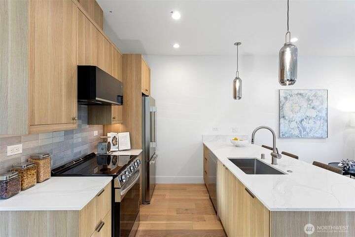 Discover this new construction Ballard gem by Roland Development that offers 2 bedrooms and 1.75 baths with inviting spaces inside and out. The bright living room with vaulted ceilings creates a warm, open feel, while the thoughtfully designed kitchen showcases quality finishes and plenty of natural light. Step outside to enjoy the fully fenced yard with low-maintenance turf—perfect for entertaining, pets, or play. With its cozy character, modern updates, and prime Ballard location, this home blends comfort and convenience in one delightful package. Home has a parking space with EV charging included and is just minutes from all Ballard has to offer!!