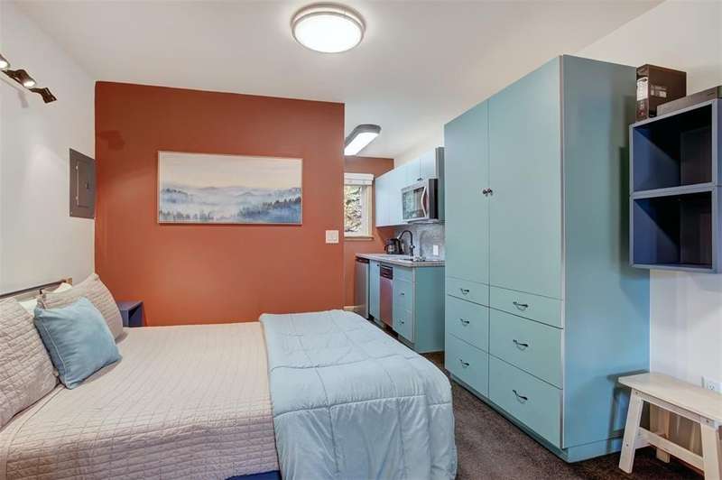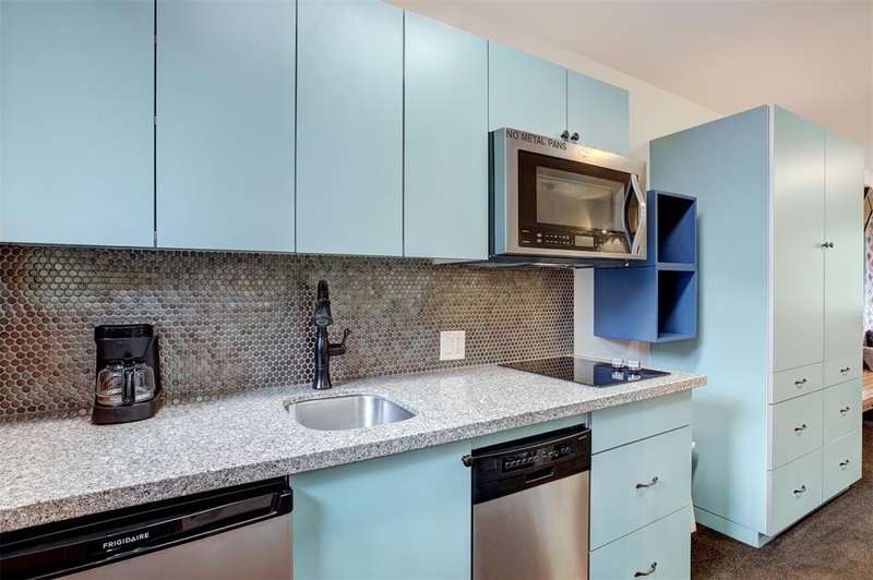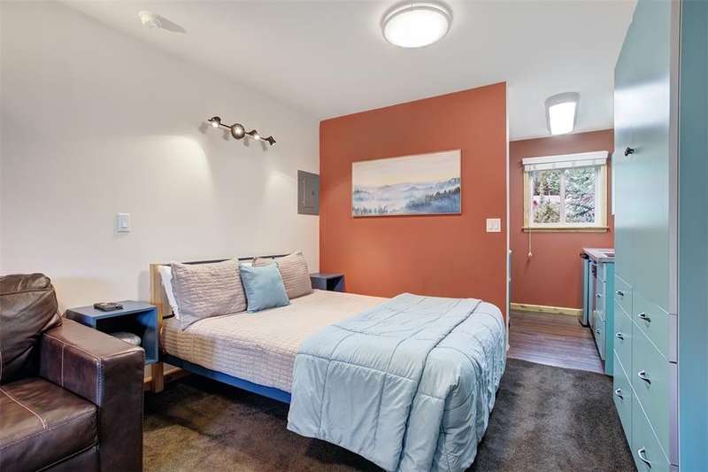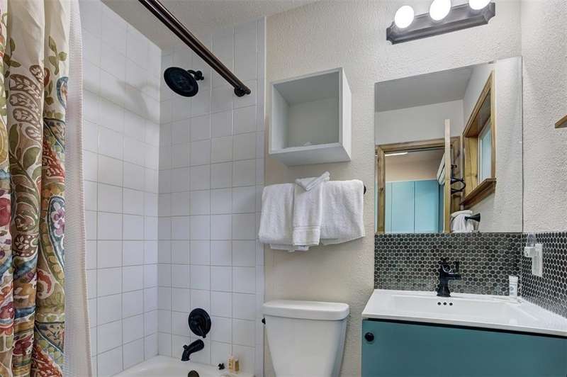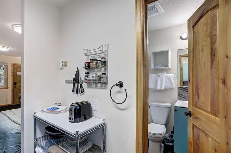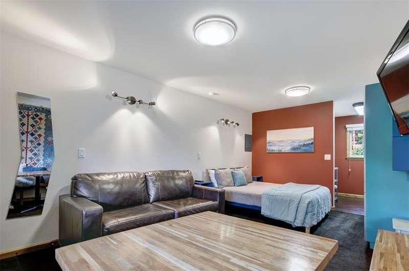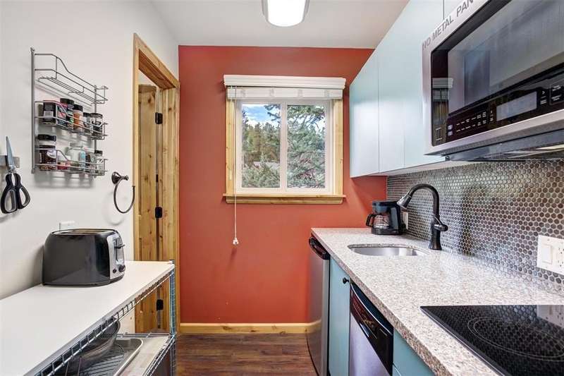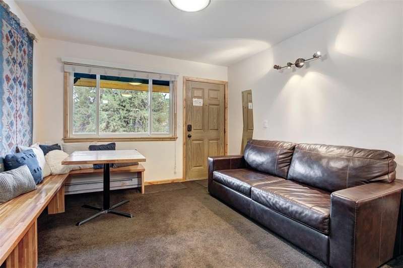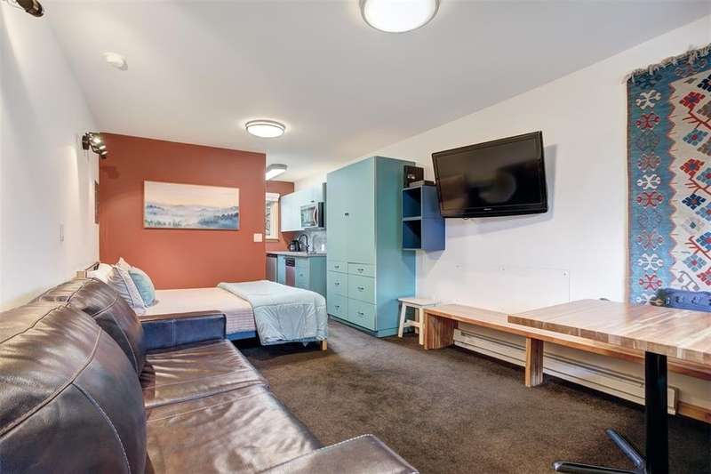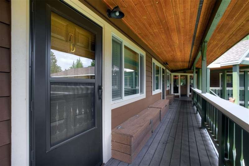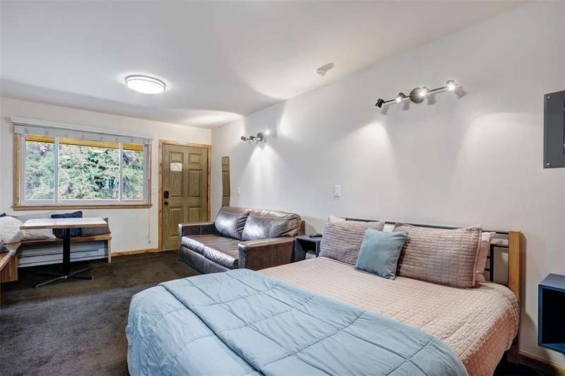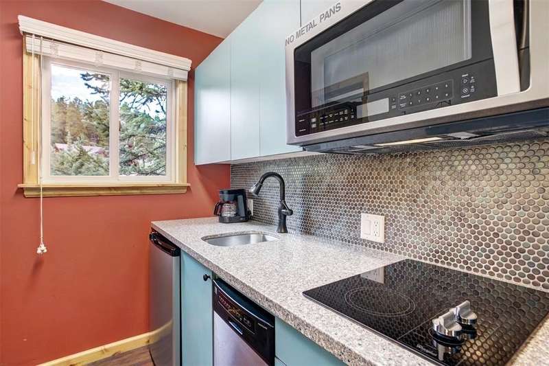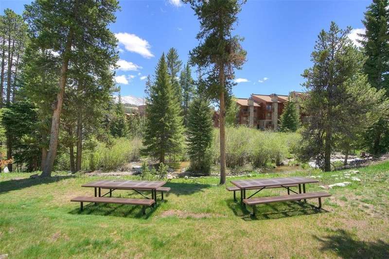 Condo 7D is in the best wing of historic Park Meadows Lodge. This renovated unit overlooks rushing Sawmill Creek and the ski run with views of 13,000’ Bald Mountain beyond. The second (top) floor location is most preferred here. Hummingbirds are regular visitors and occasionally moose may be seen from the front window wandering through the willows along the creek. Substantial sound proofing was added during the re-do. The efficient kitchen features a convection oven with microwave and hood, an electric cooktop, a dishwasher and granite counters. High quality cabinetry, upgraded electrical service and well-designed built-in furniture are also included. Enjoy quick, easy access to Main Street Breckenridge and the ski lifts. The management company is excellent. Park Meadows Lodge is very popular with resort visitors. Its location in Rental Zone 1 contributes to high occupancy and can provide owners with good cash flow. The lodge’s central common gathering space is spectacular. Here you will find plenty of room for socializing, a giant stone fireplace and comfortable seating. Other on-site amenities include a large game room, laundry, hot tubs and picnic tables along Sawmill Creek, all well maintained. This is truly a wonderful, unique property—competitively priced.