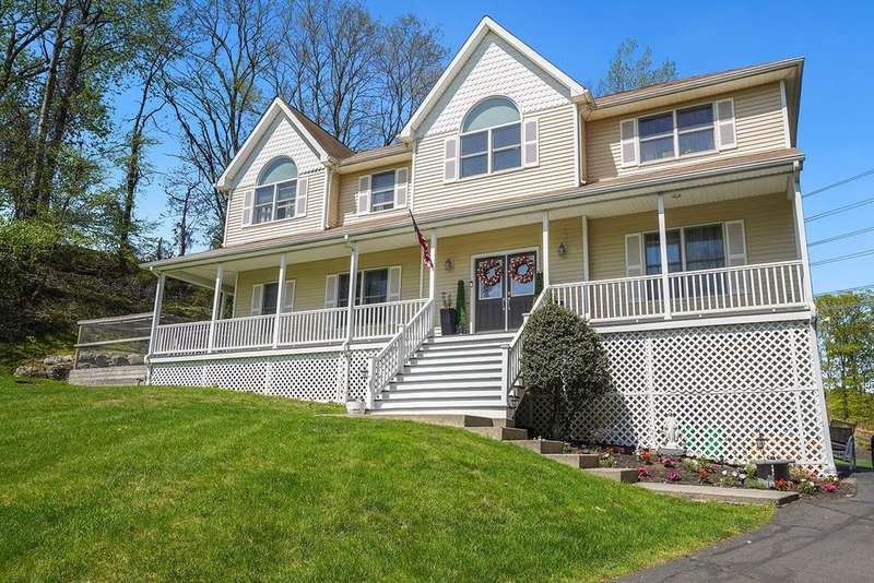 Fall in love with this stunning 5-bedroom, 3-bath Center Hall Colonial, set on over ¾ acre of lush, park-like property with breathtaking mountain and river views. Over 3000 square feet including luxurious finished walk out basement, this home combines timeless charm with elevated style and feels like a designer model.A welcoming wraparound porch leads to a spacious foyer, formal living and dining rooms with crown molding, and a custom eat-in kitchen with granite, stainless appliances, and glass tile backsplash?all opening to a warm cozy family room with fireplace. Sliders open to a huge Trex deck overlooking peaceful, landscaped grounds. The main level also includes a guest bedroom, full bath, and laundry room. Upstairs, retreat to your luxurious primary suite with vaulted ceilings, 3 closets (2 walk-ins), radiant heated floors, and a spa-like bath. Three additional bedrooms and another fully renovated bath complete the second floor. All of this plus 3 garage!