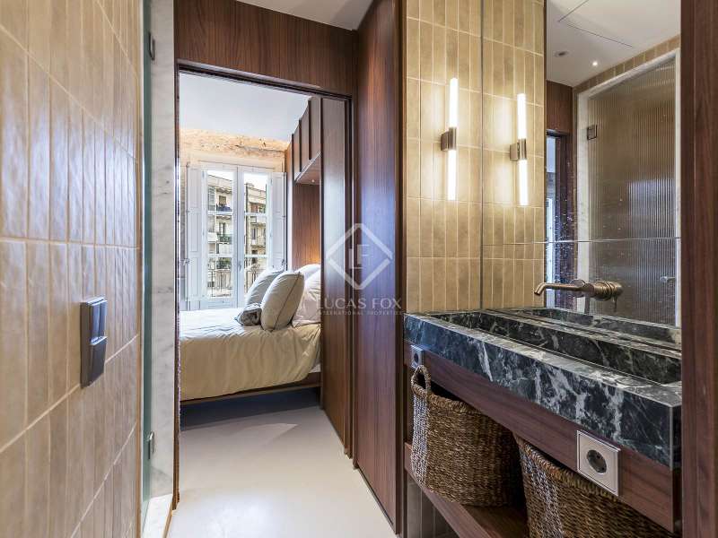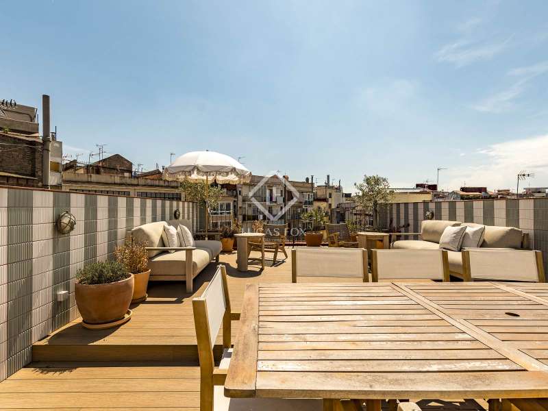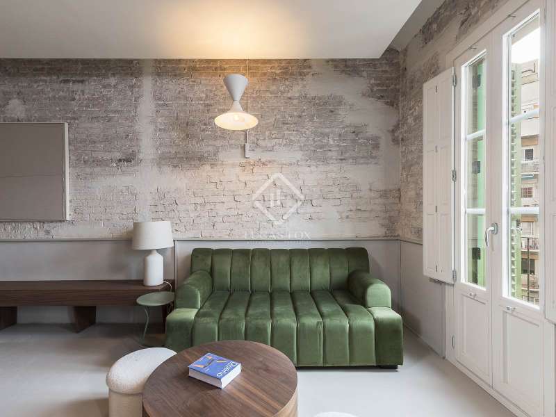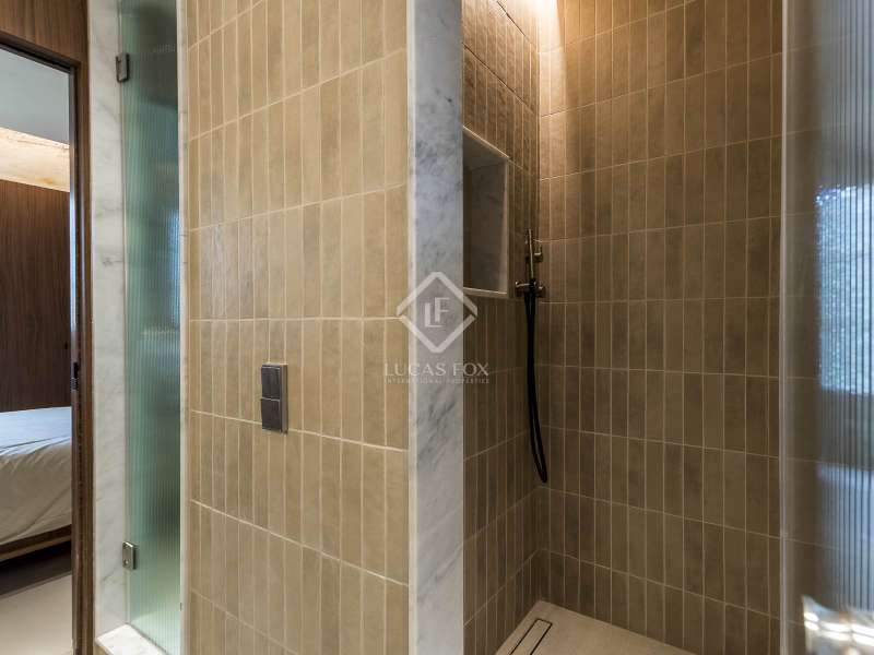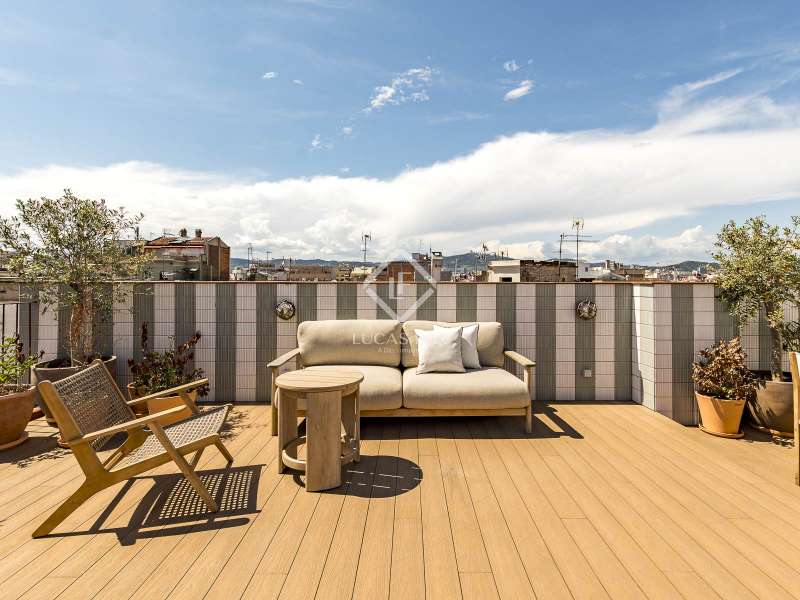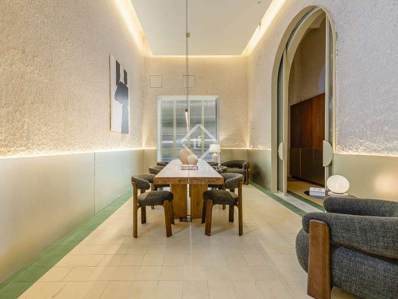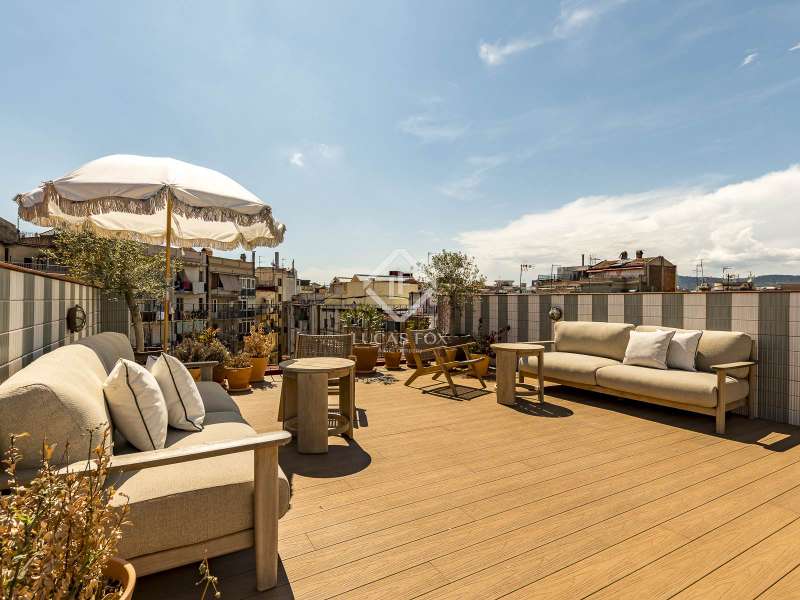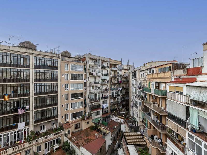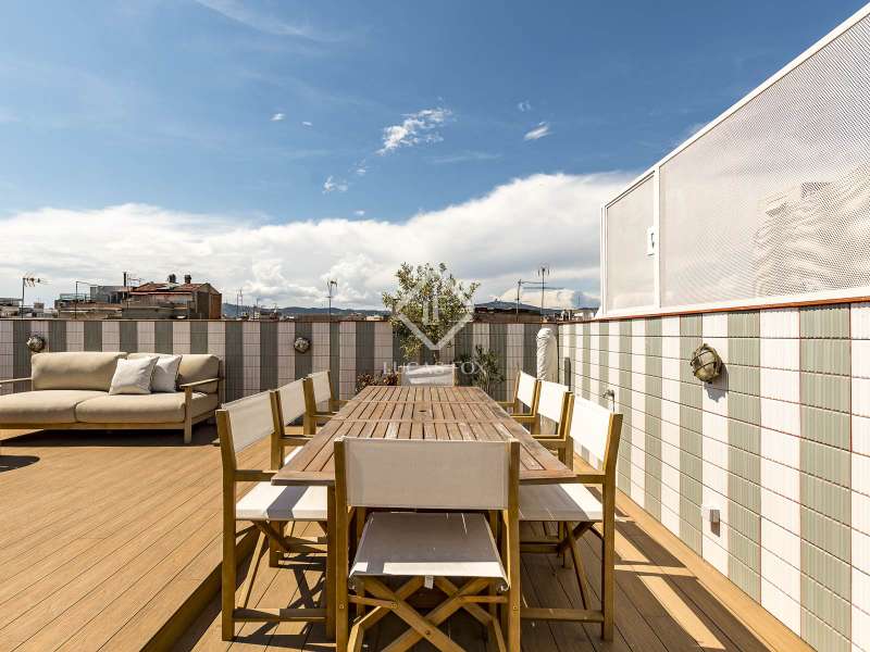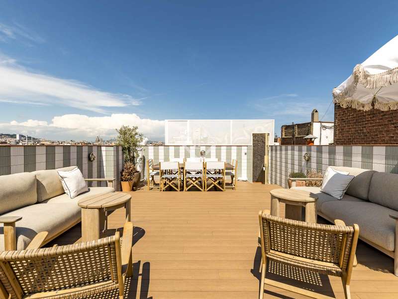 This development is located in the charming Sant Antoni neighbourhood of Barcelona's Eixample district. The classic style building dates back to 1900 and has been completely renovated, offering a lift and attractive communal areas. The communal areas of the building include a gym, parking spaces for bicycles, a wine cellar, a laundry room and a communal terrace with outdoor showers, a lounge and a social bar. The building consists of a basement level, a mezzanine and main floor level, 5 upper floors and a rooftop. Offering twelve apartments and two duplex loft properties, this development provides homes that are fully furnished, equipped and ready to move into. The kitchens come with fitted electrical appliances (dishwasher, oven, microwave oven, coffee maker and refrigerator), Zucchetti taps and porcelain countertop. This 2-bedroom penthouse property is on the top floor (real height - seventh floor) and is the result of a clever design concept by which a single space may be transformed with a system of sliding panels. The beds can be concealed in closets during the day, and the kitchen and bathroom are at the centre of the home. What's more, it boasts 54 m² of magnificent private terrace space. Feel free to contact us for further information.