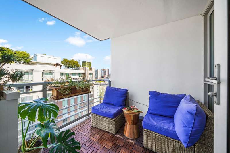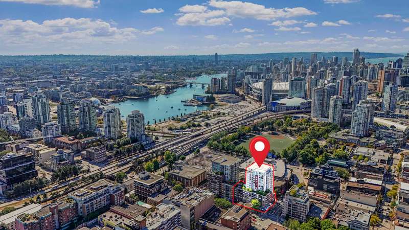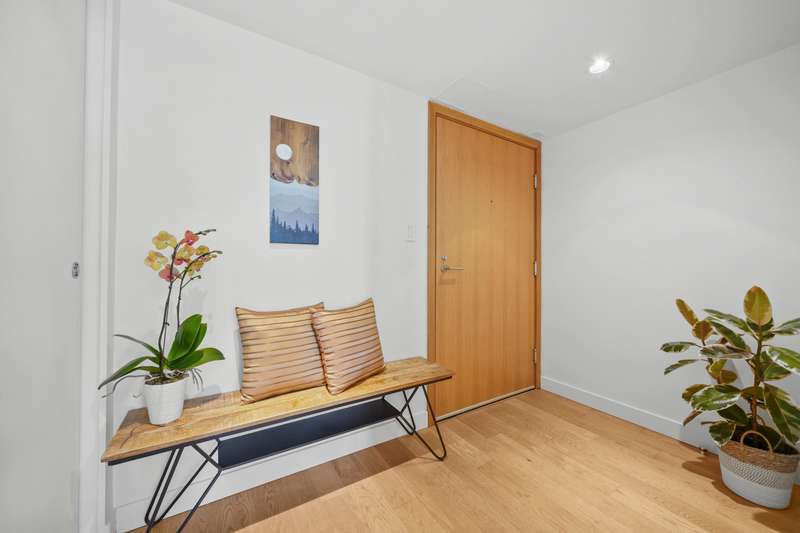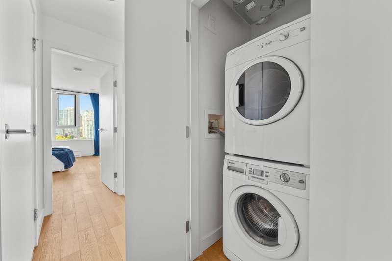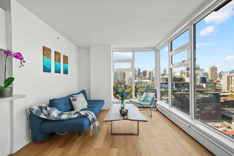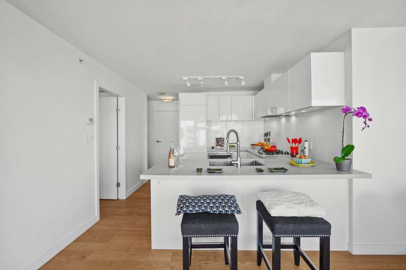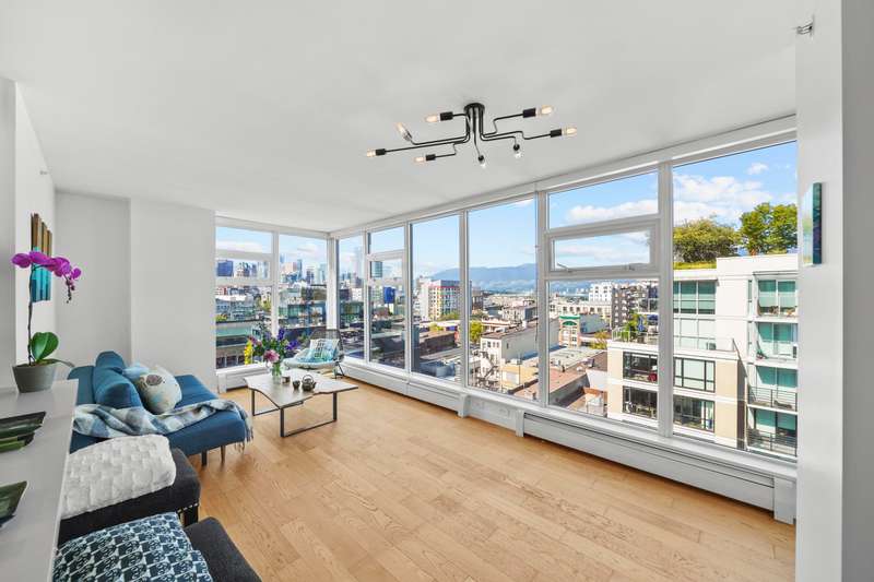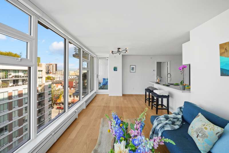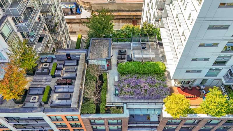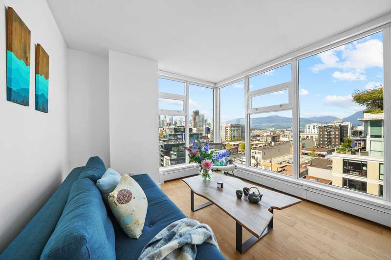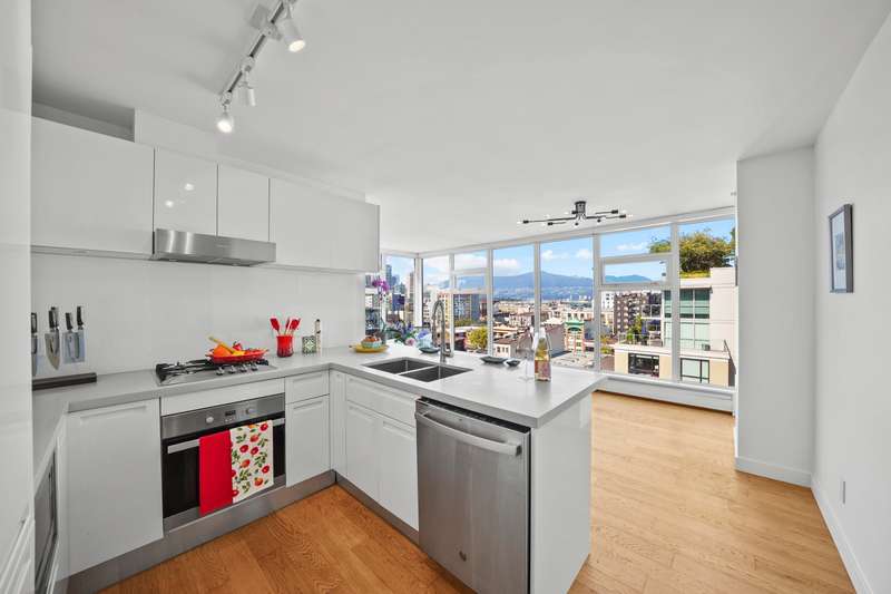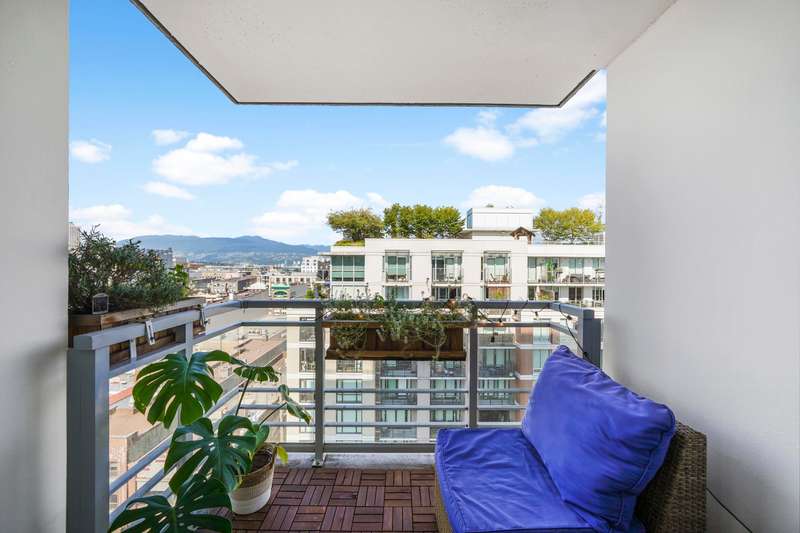 Welcome to your residence in the SKY! This NW corner suite w/ stunning panoramic views, the best of central city living. From your living room, bedrooms, & private balcony, take in sweeping vistas of the mountains & skyline. Functional layout - 2bed on opposite sides, 2bath, & walnut hw flooring throughout. True Chef’s kitchen boasts a gas stove, integrated Miele & Blomberg appl, lacquered European cabinets, a custom art glass backsplash, & Corian countertops—all within a bright open-concept design. Primary bedroom is filled w/ natural light & includes a serene ensuite w/ a cozy soaker tub. Additional comforts incl insuite laundry, storage locker, & option to continue renting a parking stall. Concrete building: playground, gym, outdoor BBQ, garden, & rooftop terrace. Move-in ready HOME!