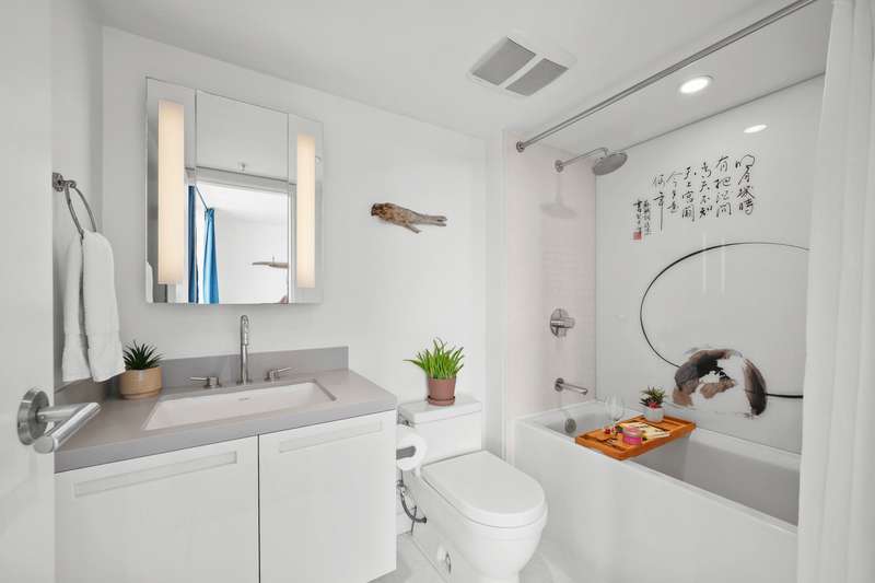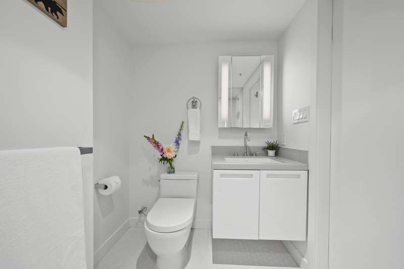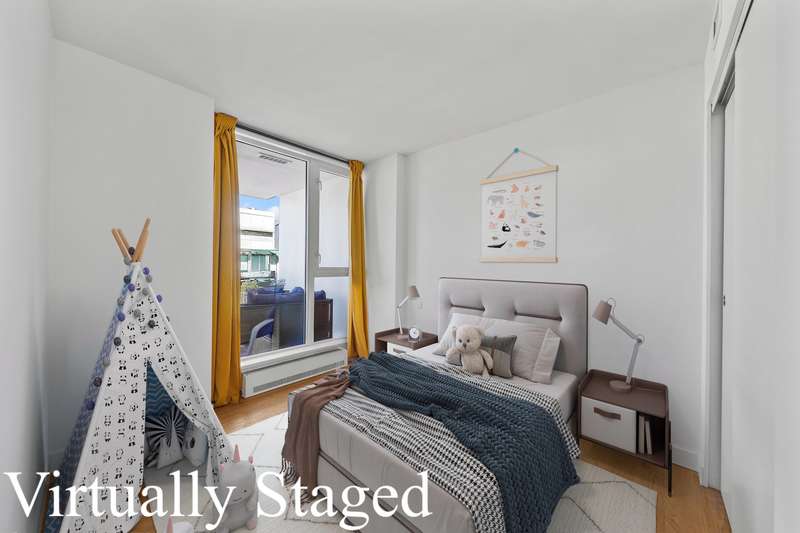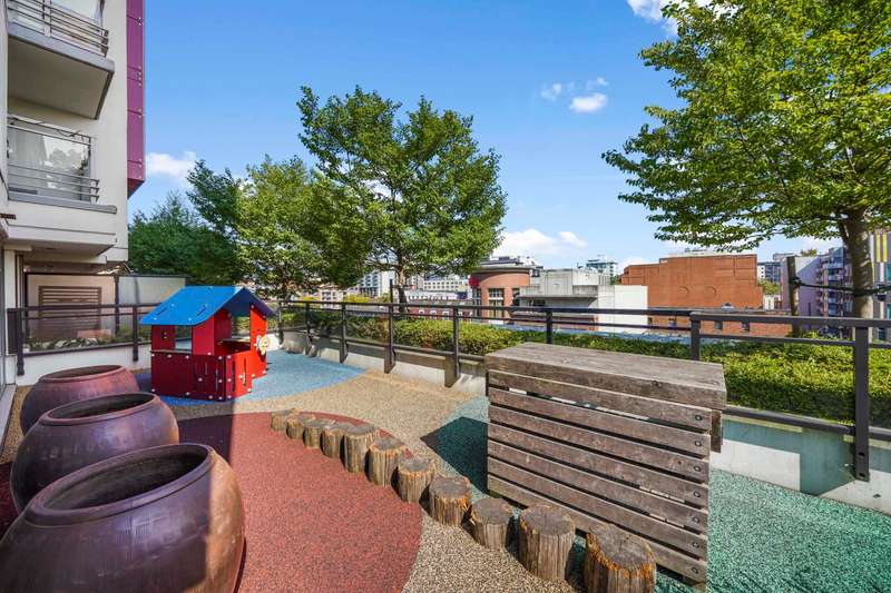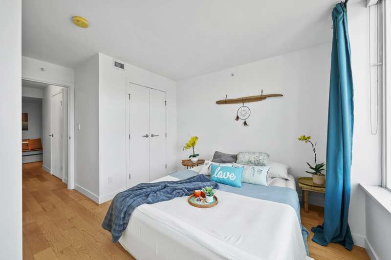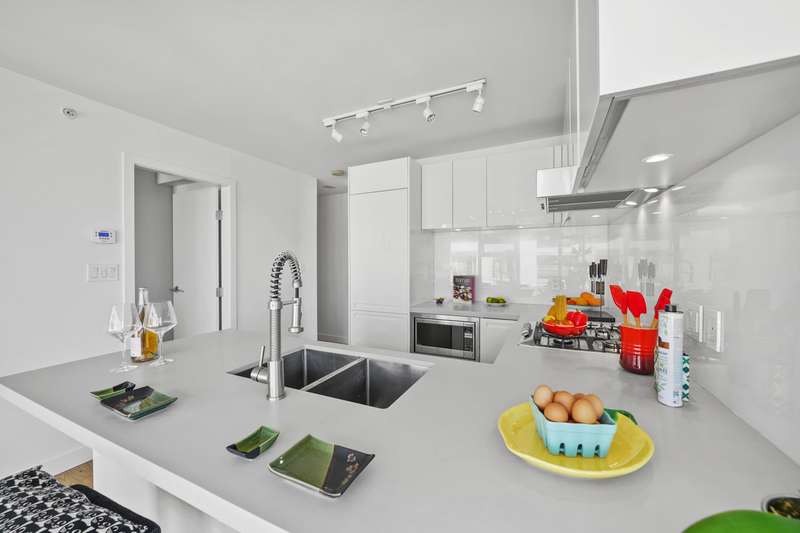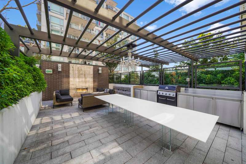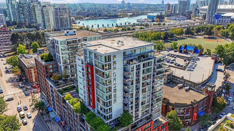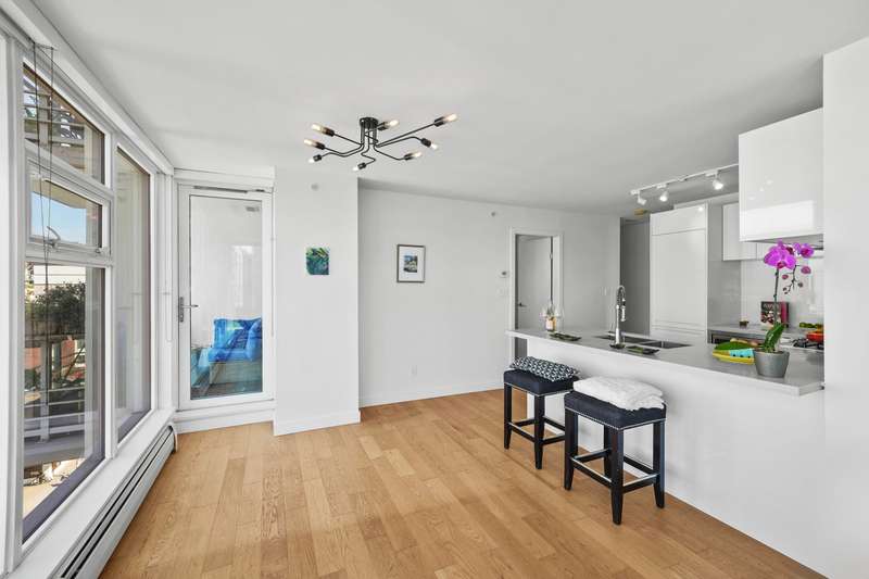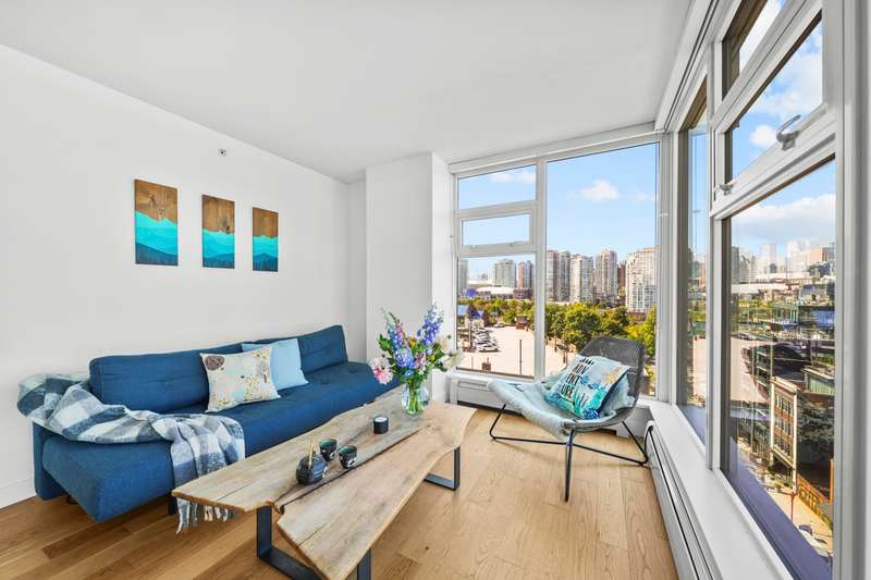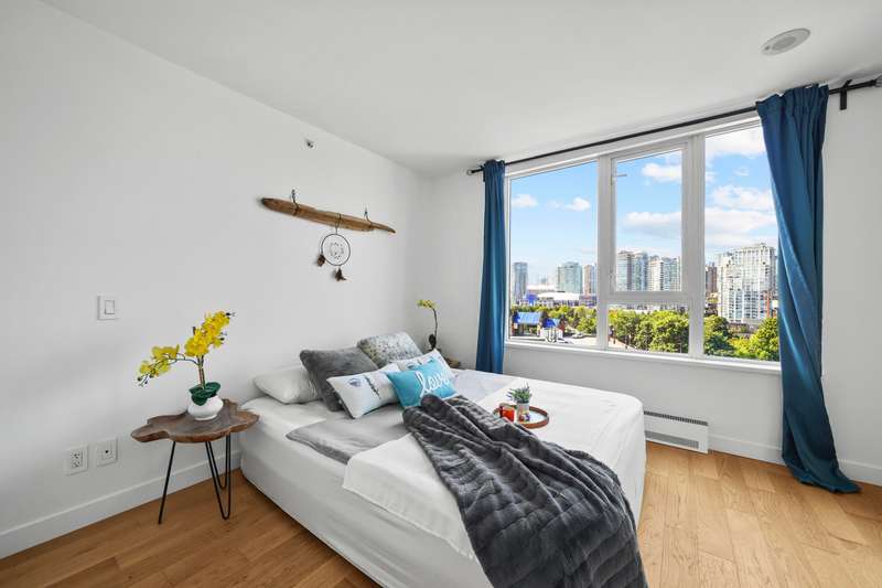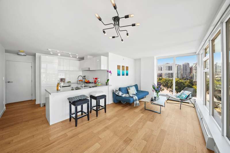 Welcome to your residence in the SKY! This NW corner suite w/ stunning panoramic views, the best of central city living. From your living room, bedrooms, & private balcony, take in sweeping vistas of the mountains & skyline. Functional layout - 2bed on opposite sides, 2bath, & walnut hw flooring throughout. True Chef’s kitchen boasts a gas stove, integrated Miele & Blomberg appl, lacquered European cabinets, a custom art glass backsplash, & Corian countertops—all within a bright open-concept design. Primary bedroom is filled w/ natural light & includes a serene ensuite w/ a cozy soaker tub. Additional comforts incl insuite laundry, storage locker, & option to continue renting a parking stall. Concrete building: playground, gym, outdoor BBQ, garden, & rooftop terrace. Move-in ready HOME!