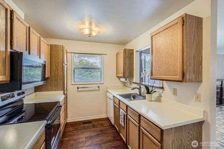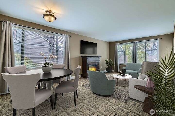 Impeccably maintained 2 bedroom, 1.5 bath end unit in a vibrant 55+ community. Excellent light w/western views from the deck & living room. Recent updates include new carpet in bedrooms & new SS range & microwave. The primary bedroom boasts expansive closets and full bath. Another half bath and bedroom will accommodate visiting guests. A convenient pass-through from the kitchen to the dining area. The electric fireplace with its beautiful custom mantle will warm you on those chilly eves. The newer furnace is ready for A/C, if desired. An oversized garage has room to spare for extra storage. The building's exterior was just painted, including exterior doors; deck surfaces & railings redone and gutters replaced. LEVEL ENTRY from the elevator!