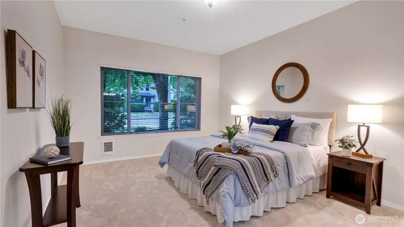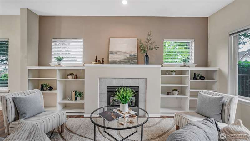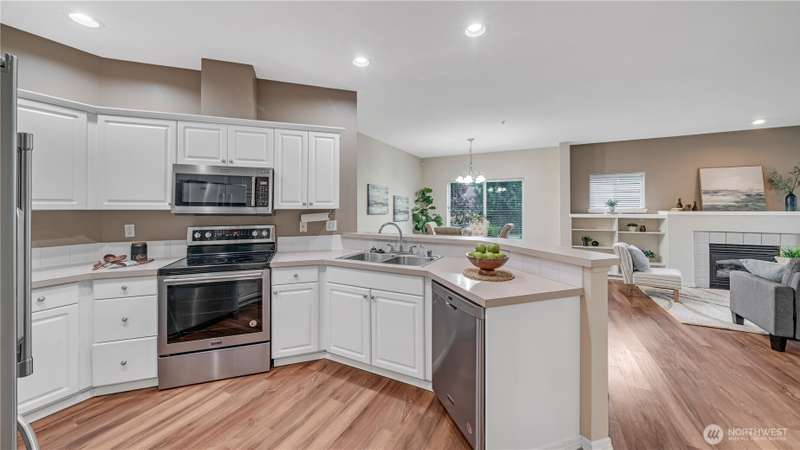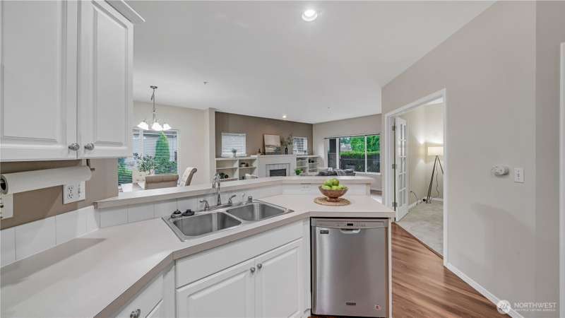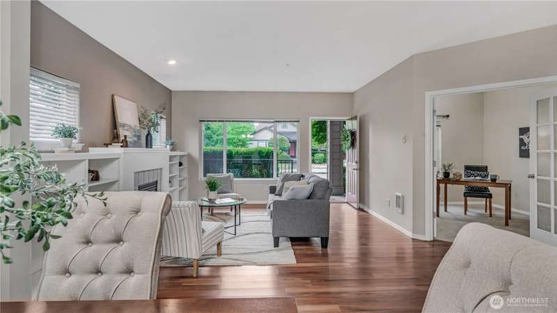 Price reduction for instant equity! This end unit main level Condo offers added privacy + more natural light to create a charming and cozy home feeling. The living room has a gas fireplace to allure comfort & relaxation. The built-in bookshelf allows you to bring home your favorite trinkets. The kitchen is equipped with updated SS appliances. The primary bedroom has an adjacent walk-in closet and a ¾ private bath. The main full bath is located off the hallway. Laundry rm with washer & dryer. Front porch to enjoy your Java. The attached oversized garage offers space to store & has direct access to the home. Community backs to a greenbelt. Schools in walking distance, close to family parks, to trails & Base JBLM. Community is very walkable.