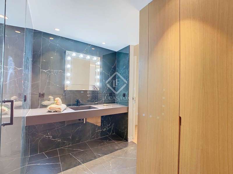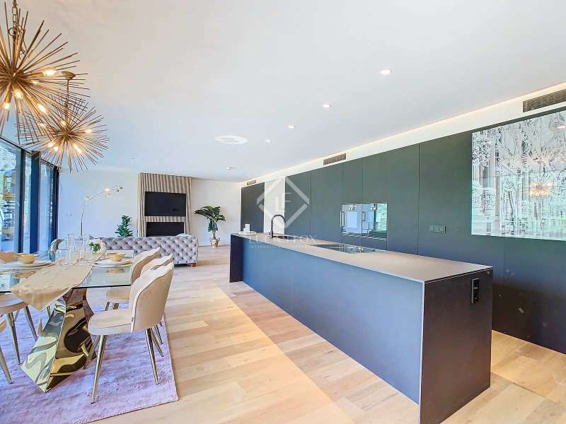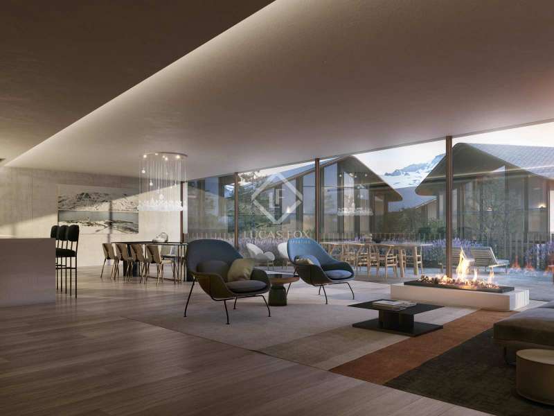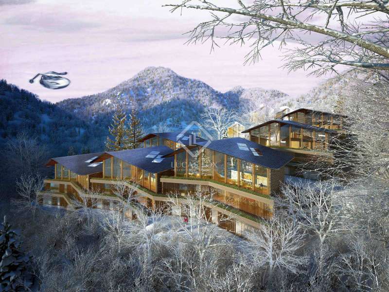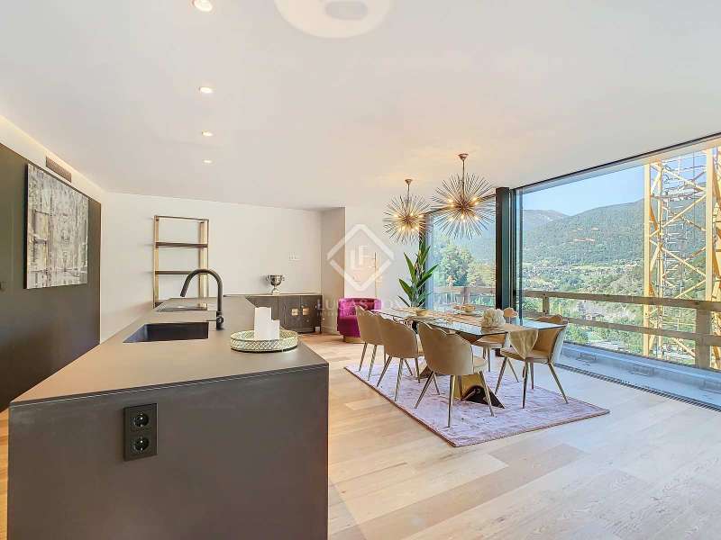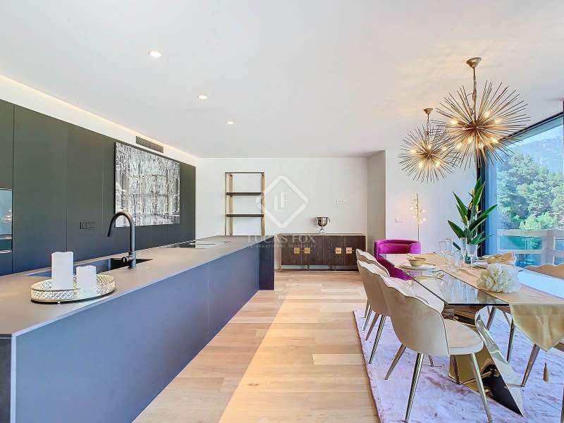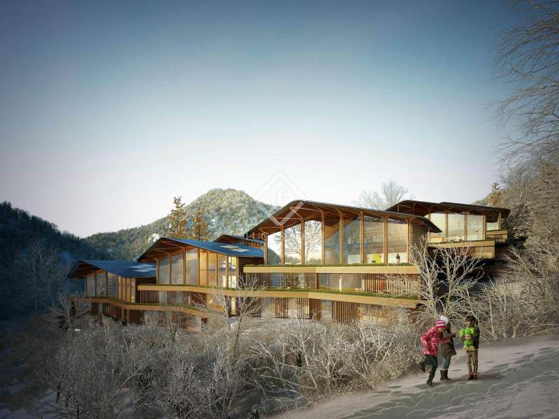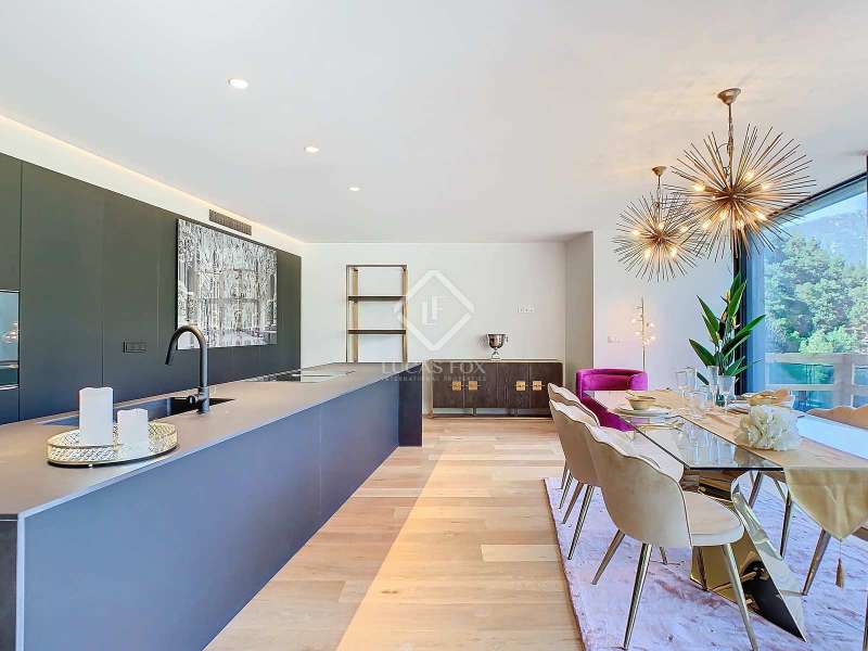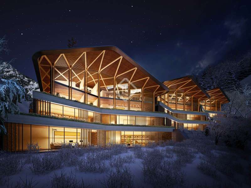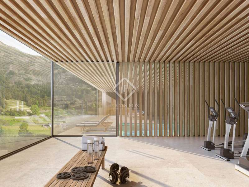 Lucas Fox presents Ordino Mountain Residential Resort, an exclusive new build development in the parish of Ordino, a quiet residential area of Andorra, with impressive mountain views in a natural setting. This development is based on the idea of reinterpreting the concept of a log cabin and transferring it to a residential project. To do so, a combination of natural materials, such as wood or stone, and contemporary materials is used. In this way, a fusion of traditional Andorran architecture with innovative design is achieved. With this idea in mind, three exclusive blocks of flats have been designed, with few neighbours per floor, and large floor-to-ceiling windows that allow plenty of natural light into the day area of the flats and offer impressive views of the natural surroundings. Specifically, we find a spacious two-bedroom apartment with a terrace with stunning views of the surrounding mountains. The property has a modern design, with minimalist furniture, in neutral colors. As for its layout, we find an entrance hall that leads to the day area on one side and the night area on the other. The night area is open-plan, with a large open space, which houses the living-dining room with the open-plan kitchen, separated by a central island. The night area has a bedroom with its private bathroom, the large main bedroom with its private bathroom and an additional bathroom to serve the entire property. The property is BREEAM certified, a certification that recognises sustainability efforts in terms of energy efficiency and environmentally friendly construction. Among its qualities, we can highlight the armoured door, white lacquered doors, wooden floors suitable for underfloor heating in the main rooms and porcelain stoneware in the wet areas and the kitchen, a rotating fireplace by Dexofocus and built-in wardrobes in the bedrooms. For added comfort, it includes aluminium carpentry with thermal break with triple glazing and Saint-Gobain low-emissivity layer, air conditioning system with underfloor heating and cooling, supported by a fan coil system for cooling; all powered by a geothermal heat pump system. The kitchen comes fully equipped with Santos furniture in a matte white finish, a Neolith worktop and Gaggenau appliances . The bathrooms also come fully equipped, with Villeroy & Bosch sanitary ware, Hansgrohe taps and a Neolith worktop. The development offers an exclusive multi-level garden , with rest areas , landscaped areas , pedestrian areas and LED lighting. In addition, it offers a social club with a common room with a fireplace, double- access parking, storage rooms and lifts. Finally, it offers a fully equipped spa area with several showers, saunas, swimming pools with massage systems, massage beds and a jacuzzi-type bench. For greater security, the development has access control with a security guard and monitoring of communal areas.