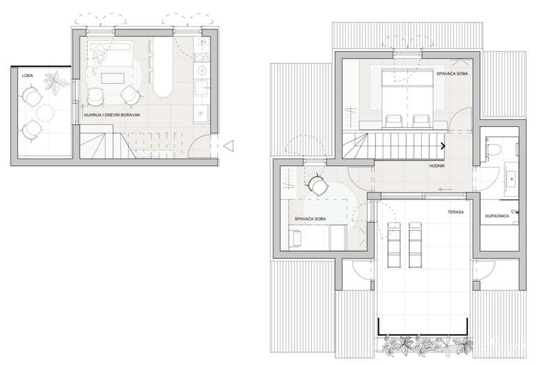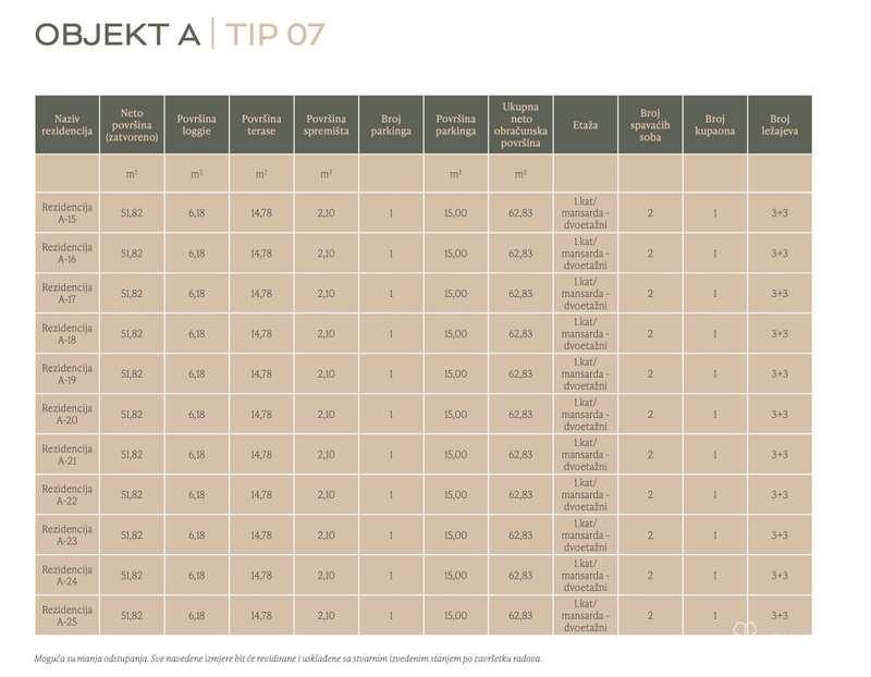 Apartment A-T07 - duplex - 1st floor/attic - living area 51.82 m2 (2 bedrooms + 1 bathroom) + balcony (6.18 m2) + terrace (14.78 m2) + storage (2.1 m2) + parking (15 m2); total net calculable area 62.83 m2 = 351,854 EUR