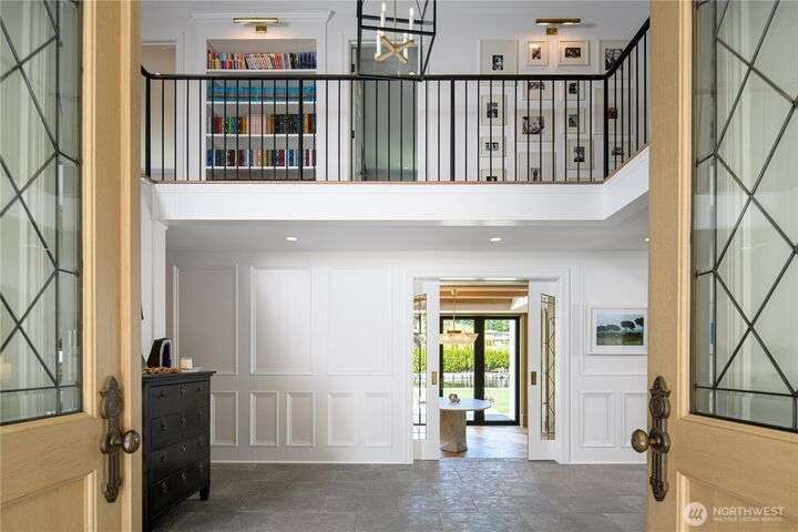 Reimagined English Tudor nestled on the shores of Lake Washington. Double doors open to two story entry with bespoke iron railings & gorgeous stone floors mined in Ireland. Formal living & dining rooms with oversized French doors to bluestone patio, huge lawn, fire pits & calming water views. Study with cashmere walls, lacquered trims and bookcases. Kitchen/Great room with fireplace, stunning marble & Ann Sacks terra cotta tile finishes and blue Lacanche range. Primary room w/antique fireplace & Calacatta marble bathroom. Hand-cut herringbone white oak floors. 123 ft of waterfront-new bulkhead/dock/platform lift for the boating enthusiast. 5 Beds, 5.5 Baths. Gym. Park-like setting with gated drive. Do not miss the pickleball court!