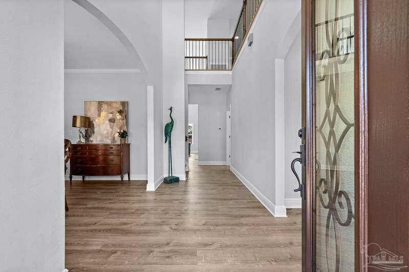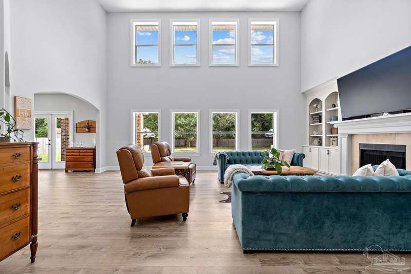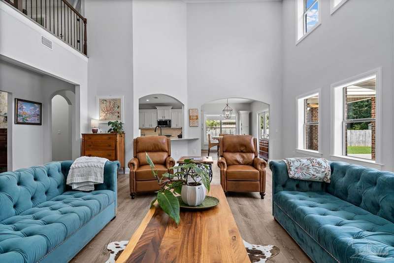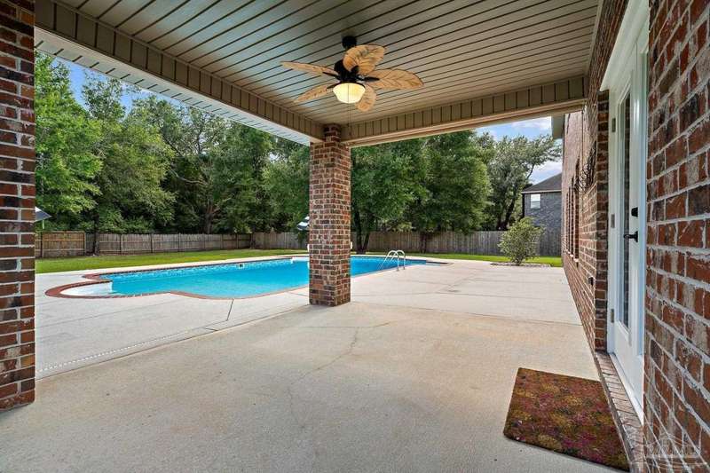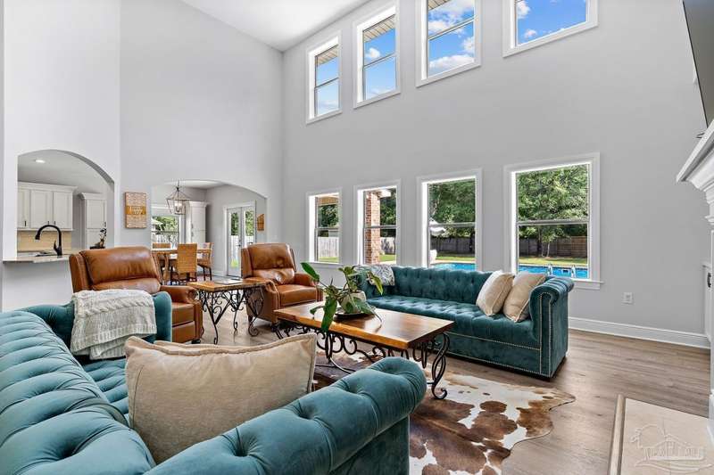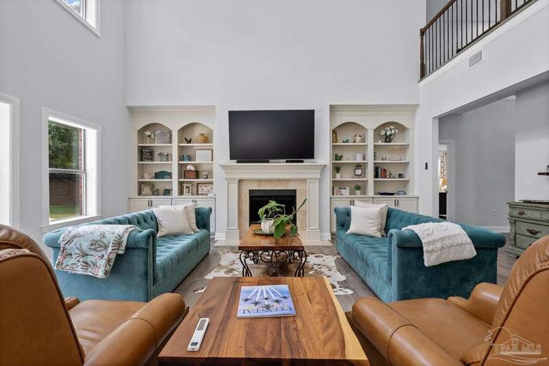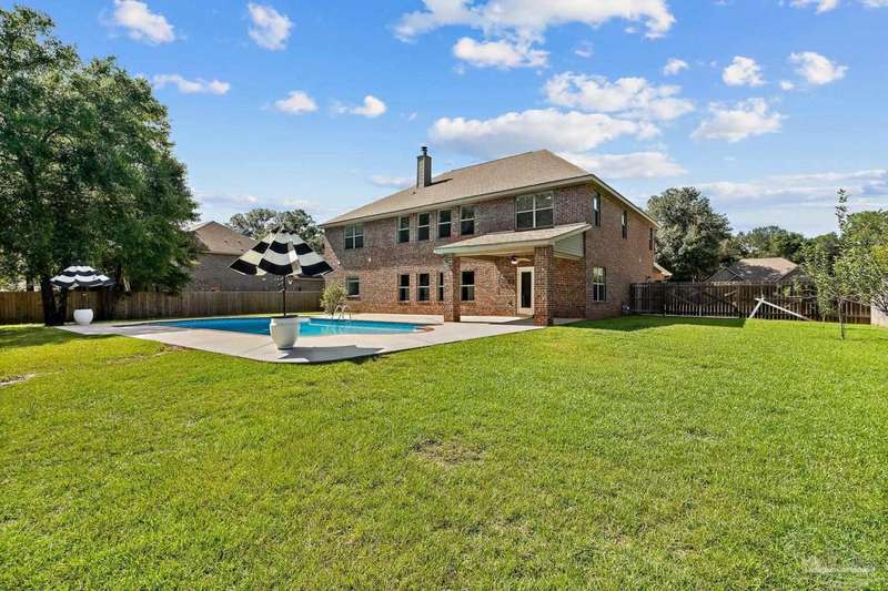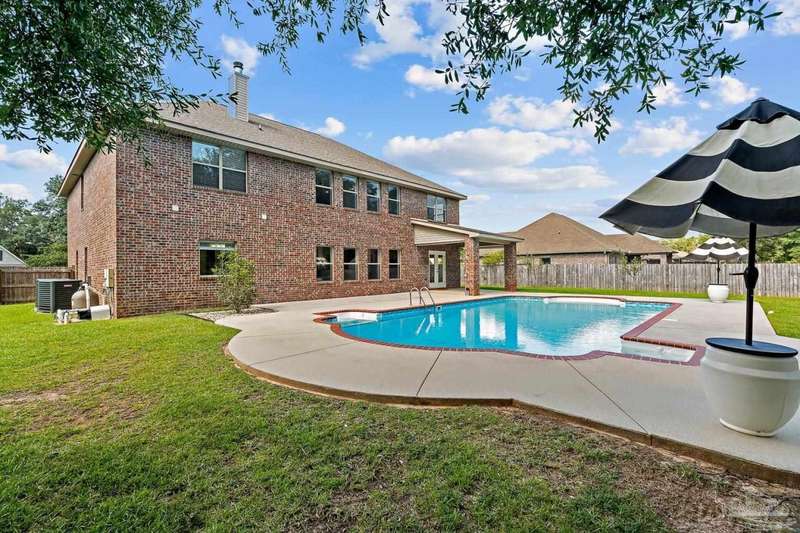 Welcome to Cottonwood-a gated community where elegance, space, and lifestyle come together. This meticulously maintained 6-bedroom, 3.5-bath home spans 4,296 sq. ft. on over half an acre, complete with a private in-ground pool. Inside, soaring ceilings and a catwalk overlook the main living area creating a dramatic space filled with natural light, enhanced by custom built-in cabinetry paired with architectural niches above. The kitchen is a showpiece, featuring stunning Taj Mahal quartzite countertops, custom cabinetry, and a walk-in pantry designed to match the kitchen-providing both beauty and abundant storage. A breakfast nook extends off the kitchen, while a formal dining room and an office on the main level add both function and flexibility. The primary suite is conveniently located on the first floor, offering two walk-in closets and a spa-inspired ensuite bath. Thoughtful touches continue with a butler's station tucked under the stairs, designed for seamless entertaining and everyday convenience. Upstairs, 5 Bedrooms configured in split-bedroom layout provide privacy for all, with two of the bedrooms offering walk-in closets and every bath finished with beautiful Taj Mahal quartzite countertops and custom cabinetry. A generous bonus/game room completes the second level, delivering endless options for recreation, media, or multi-use space. Outdoors, the lifestyle centerpiece is the expansive, beautiful resort style in-ground pool, framed mature landscaping that backs up to privacy. A side-entry two-car garage and an oversized driveway further elevate the property's curb appeal. Set within this exclusive community, this residence blends custom detail with everyday livability-crafted for those who want space, style, and a home that truly stands apart.