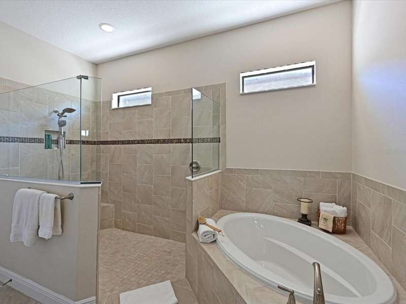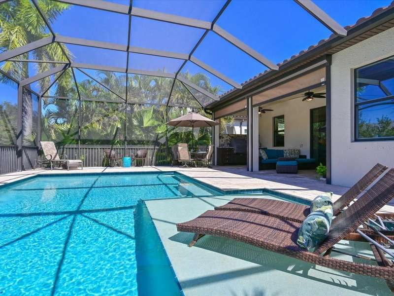 FOUR BEDROOM AND 2 1/2 BATH HOME IN LEGENDS BAY!. Original owner has meticulously maintained this home. Come see the many decorator touches and upgrades. Enter into the spacious foyer with custom light fixtures, tray ceiling with crown molding and designer wall finishes. 18 ceramic tile flooring guides you into the spacious gathering area consisting of the great room, living room and kitchen. The gourmet kitchen has everything an aspiring chef could need. Stainless steel appliances include a three-door refrigerator/freezer with dual ice output, built-in microwave and oven, 5 burner gas stove and new LG dishwasher. Wood cabinetry offers plenty of storage with easy to use pull out drawers and soft close features. The large corner pantry has solid wood slat shelving. Diana Reale marble countertops and travertine backsplash adorn this area. The kitchen island offers casual seating for up to four. The dining area is optimal for more formal meals; two large windows offer light and views to the outdoor area. The spacious great room is perfect for larger gatherings or just relaxing watching TV.Enter the primary bedroom with ensuite bath consisting of large vanity with dual sinks, soaking tub and huge walk-in shower. A separate toilet room and walk-in closet complete this private area in the rear of the home.This split floorplan has two guestrooms and full bath with tub/shower combo on one side of home, making these perfect for family or guests.The fourth bedroom is currently used as an office and has engineered hardwood floors. A separate half bath is conveniently located for guest use. Save the best for last: Walk out to your private custom designed lanai and pool area. The covered lanai with travertine tile flooring boasts a large seating space to relax and unwind with friends and family. A custom outdoor kitchen has marine grade polymer cabinetry with drawers and pull-out shelves to store everything you need to create an outdoor meal. A Hestan commercial grade stainless steel grill with built-in rotisserie and infra-red burner can cook just about anything you desire including pizzas. The kitchen also includes 2 gas side burners, an outdoor beverage refrigerator and granite countertop and backsplash.Relax and unwind in the custom designed concrete (not Gunite) pool with waterfall fountain and a sun shelf for relaxing and viewing sunsets or native Florida birds in the small creek behind the home. Florida friendly landscaping surrounds all sides of the home and is watered with recycled water for irrigation provided in the HOA fee. Automated 12volt landscape lighting highlights the home and palms in the evening.Legends Bay is a gated community located along Sarasota Bay. Enjoy local activities in Bradenton and Sarasota. Legends Bay is located just ten minutes from Sarasota International Airport and 55 minutes to Tampa International Airport. World renown IMG Academy campus is 3 miles nearby and IMG Golf Course is a golf cart ride away. Explore Downtown Bradenton with its historic charm and the Manatee riverfront or venture south to Downtown Sarasota with fine dining, exciting venues such as the Van Wezel Performing Center and Sarasota Opera House and the well-loved St. Armand's Circle. Check out local activities and markets along the crystal sand beaches of Bradenton Beach and Anna Maria Island. Every day holds an adventure within minutes of your new home!