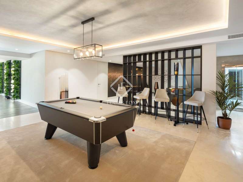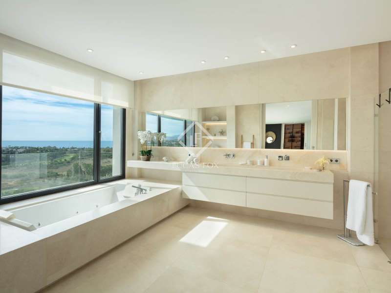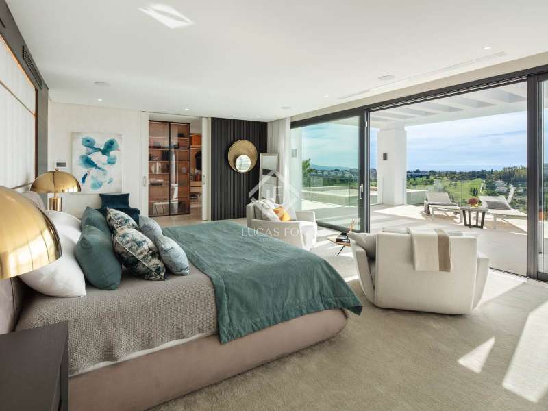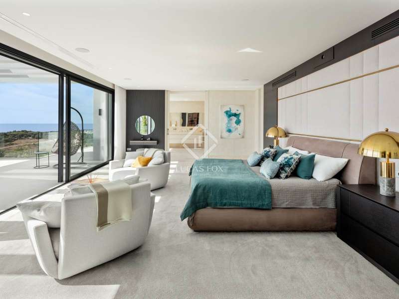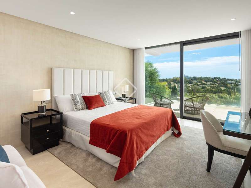 The villa features seven bedrooms and eight en-suite bathrooms, spread across four levels, all designed with a sophisticated neutral palette and warm decorative touches. The main floor boasts an elegant open-plan living area seamlessly connected to a dining room and a designer kitchen with a central island and floating table which is ideal for both everyday living and entertaining. The main suite enjoys direct access to the upper terrace, a bespoke walk-in wardrobe, and a marble bathroom with bathtub and shower strategically positioned to embrace the views. The remaining bedrooms maintain the same level of comfort, each with private terrace access and built-in wardrobes. Please contact us for more information regarding this exceptional villa.
