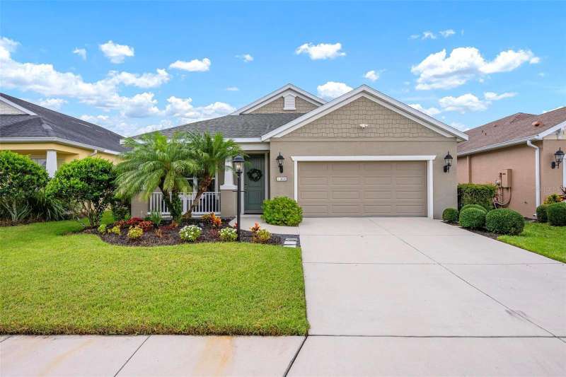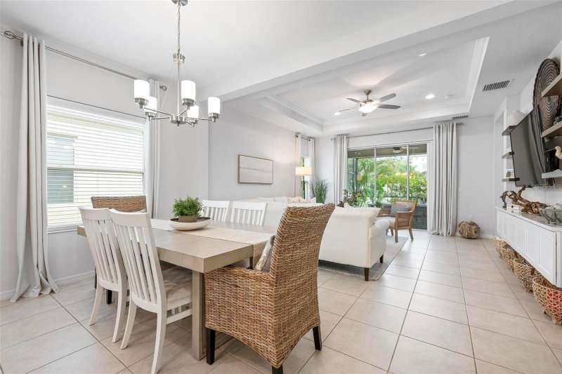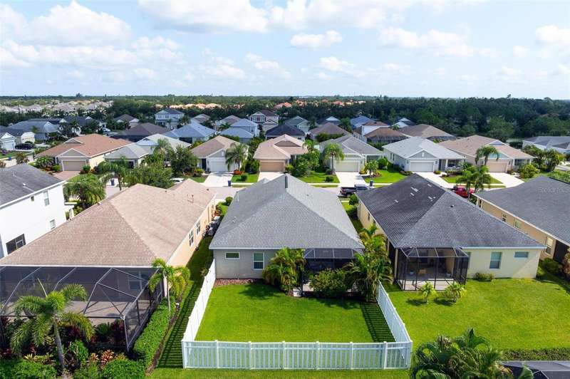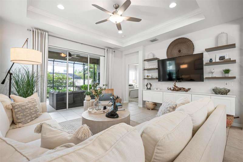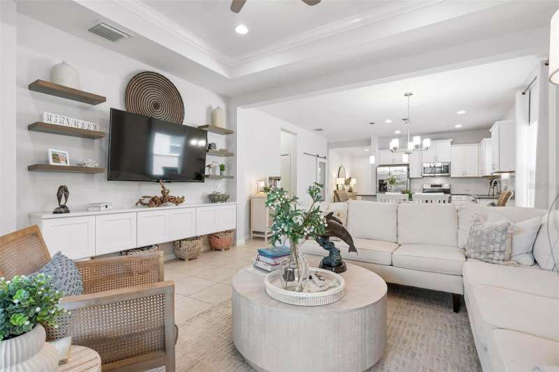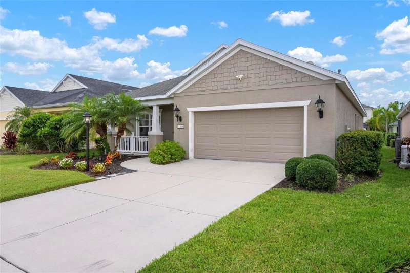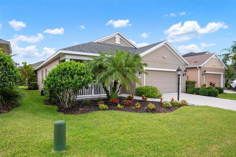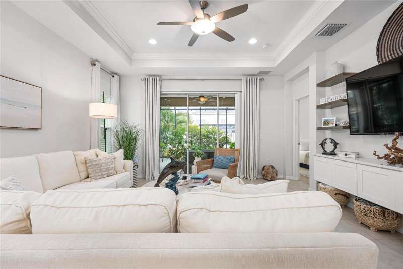 PERFECTION IN WOODBROOK… Move-in ready! Beautifully maintained 3-bedroom plus DEN home with a bright and open great room layout. Stylish upgrades throughout make this home feel like new. Welcoming covered front entry and meticulously maintained landscaping enhance the curb appeal. Neutral ceramic tile and luxury vinyl plank flooring throughout – no carpet. Foyer with charming ship-lap accent wall. Crown molding, tray ceiling, recessed lighting, updated stylish light fixtures and ceiling fans. Expansive great room with wall of floating wall-mounted shelves and cabinet. Pocket sliding doors open to the extended screened lanai for effortless indoor-outdoor living. Large fully fenced backyard with low-maintenance vinyl privacy fencing. Open floor plan connects the great room, dining room and kitchen. Inviting kitchen with Shaker-style cabinetry, granite countertops, subway tile backsplash, stainless steel appliances and a large center island with counter-height seating. A spacious walk-in pantry with barn door provides generous storage space. Retreat to the primary suite compete with a large walk-in closet and ensuite bath with tiled walk-in shower. Two additional bedrooms share a well-appointed full bathroom, while a versatile den with French glass doors at the front of the home makes for the perfect home office, media room, playroom or additional living space. The laundry room includes built-in cabinetry and GE washer and dryer. Additional closets throughout the home for storage and a two-car garage with built-in overhead storage. Built by award-winning Neal Communities and nestled in the private, pet-friendly community of Woodbrook. Residents enjoy a resort-style heated pool and spa, cabana, outdoor grill area with tables, playground, park, and scenic walking trails that wind through beautifully preserved natural surroundings. Conveniently located near world-class shopping at UTC, fine dining, cultural attractions, downtown Sarasota, the pristine Gulf Coast beaches, top-rated golf courses, and Sarasota-Bradenton International Airport. With easy access to the University Parkway corridor, everything you need is just minutes away.