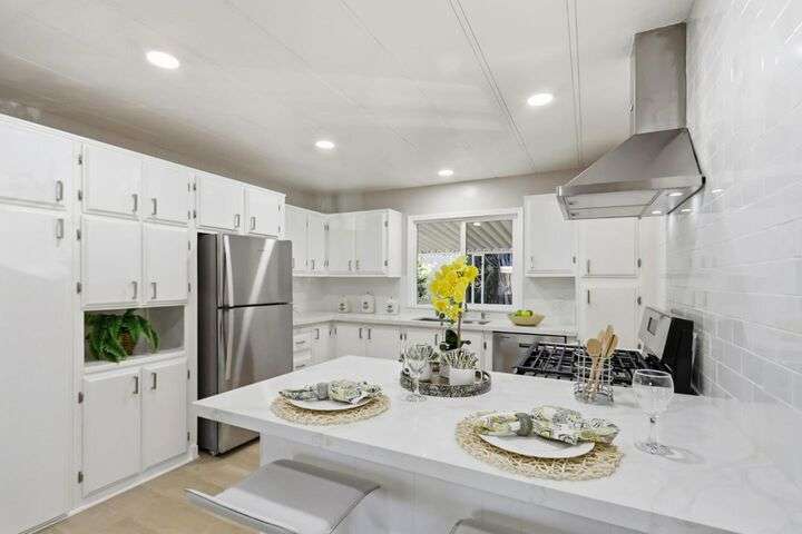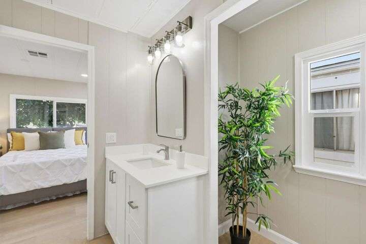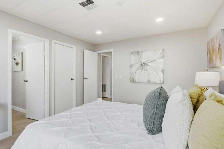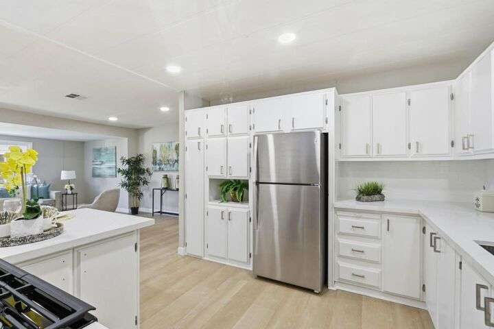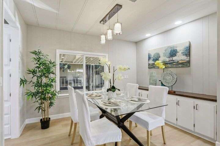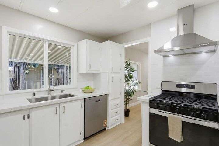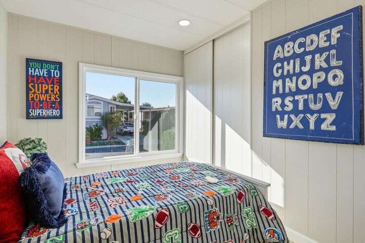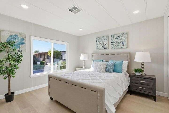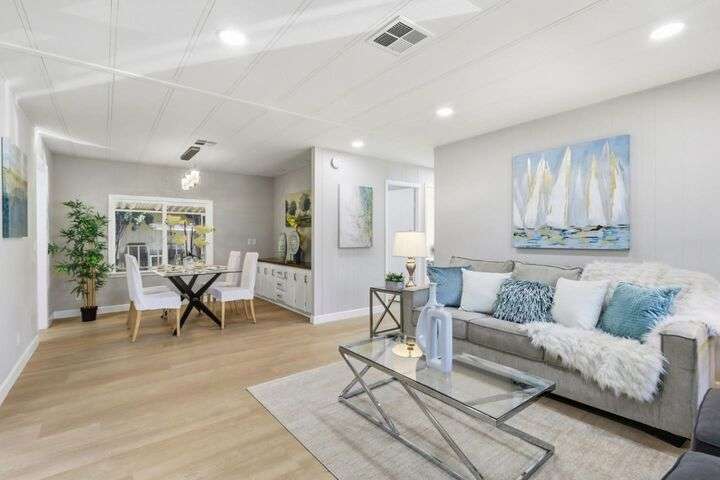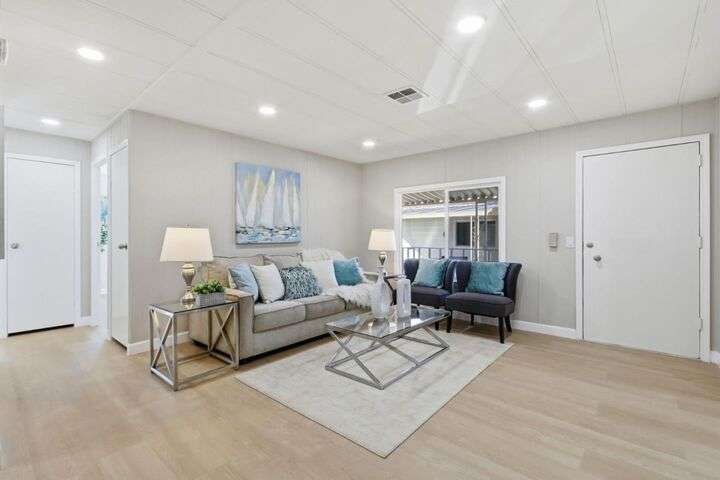 Don't miss this beautiful updated home located in the highly desirable Millpond Mobile Home Park, a 55+ senior community in San Jose! Offering approximately 1,559 sq. ft. of living space, this home features a fabulous floor plan with 3 bedrooms and 2 fully renovated bathrooms. Enjoy new interior & exterior paint, a bright living room and separate family roomfilled with natural light, new double pane windows, recessed LED lights, and brand-new laminate flooring throughout. The kitchen includes plenty ample cabinet space, brand new quartz countertop, and brand-new stainless-steel appliances. Both hallway bedrooms are generously sized with easy access to the hall bathroom. The primary suite boasts a large walk-in closet and an updated en-suite bathroom with a new vanity, and an updated walk-in shower. Residents enjoy access to a clubhouse, swimming pool, community events, and beautifully maintained common areas. This peaceful, friendly neighborhood is ideally located near shopping, restaurants, Downtown San Jose, Willow Glen downtown, and major highways. With affordable space rent and a relaxed, low-maintenance lifestyle, this home is perfect for a first time homebuyer or someone looking to downsize and call this place home!