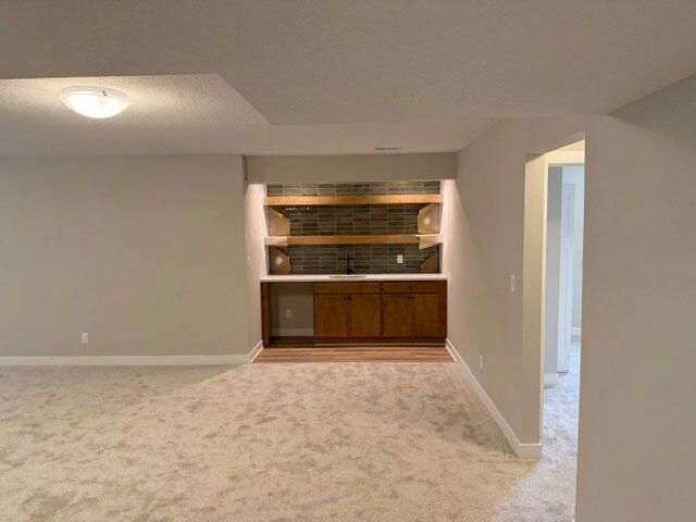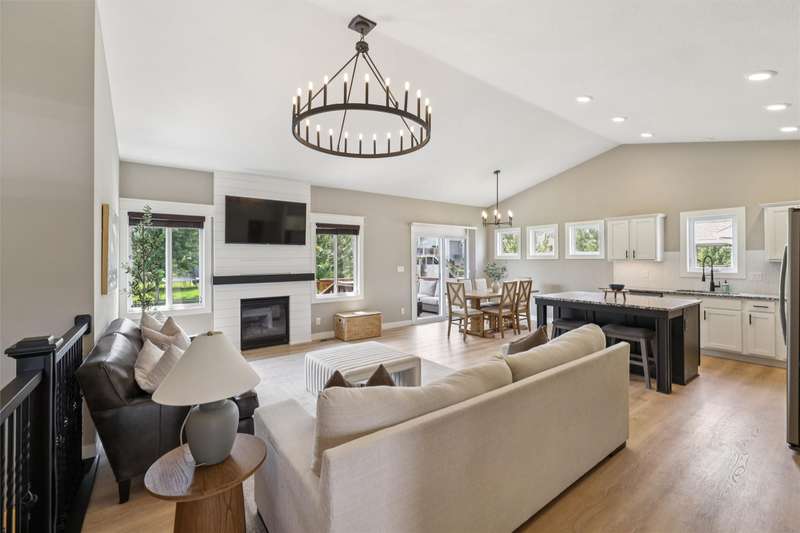 Beautifully designed home featuring an open-concept main level with laminate floors, and a cozy fireplace. The kitchen offers a large island, tile backsplash, and built-in appliances. The primary suite includes a tiled shower, double vanity, and walk-in closet with convenient laundry access. Two additional bedrooms and a full bath complete the main floor. The finished lower level adds a spacious rec room with wet bar, two bedrooms, and full bath