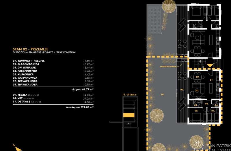 Apartment S-02 - ground floor - living area 64.77 m2 (2 bedrooms + bathroom + WC) + terrace (28 m2) + garden (157 m2 - SW) + storage (9 m2), net calculated area 125.38 m2 = €343,000