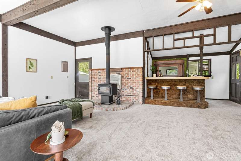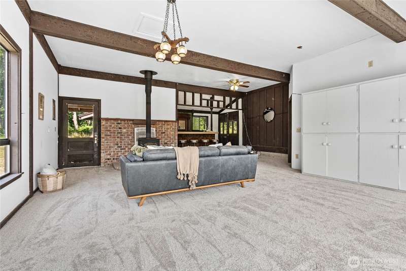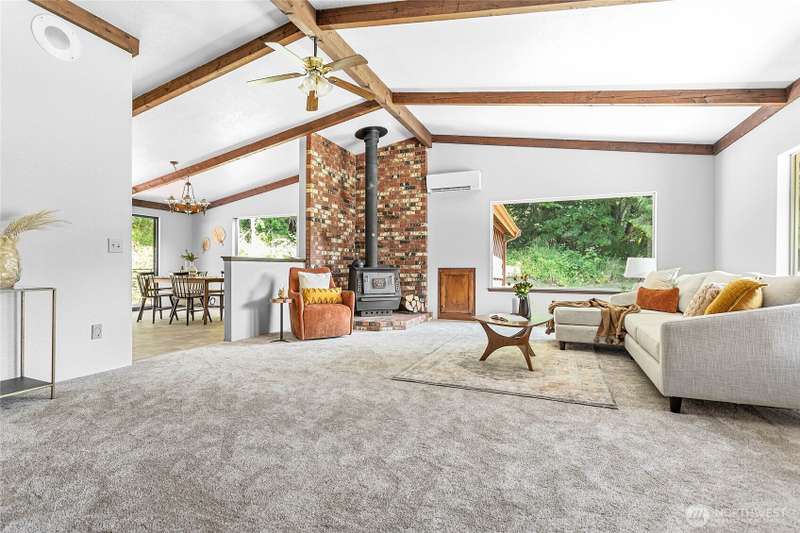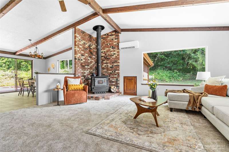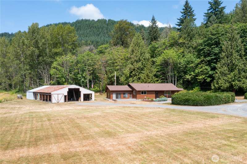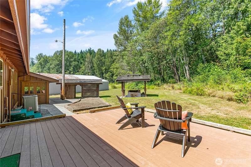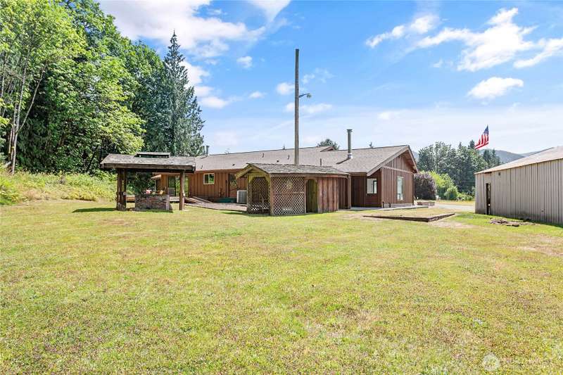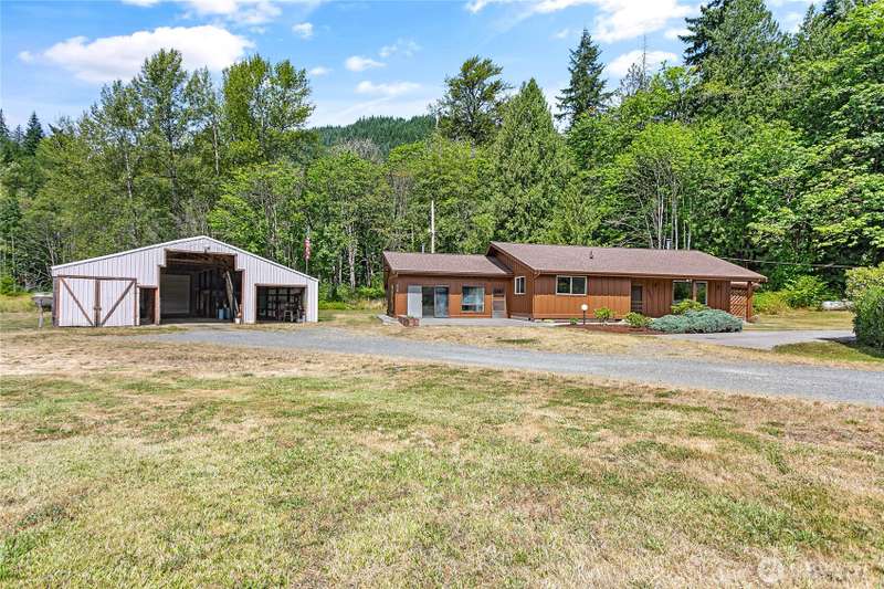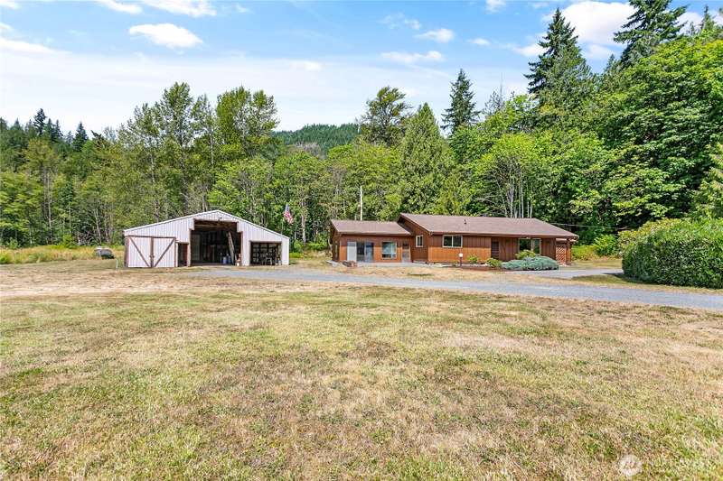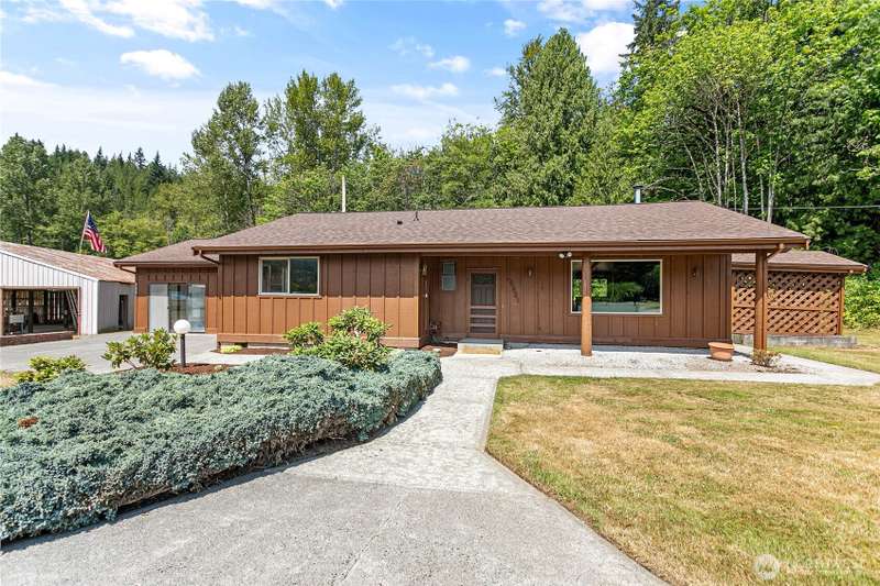 Discover your peaceful retreat on 2 serene acres, surrounded by towering trees and a creek less than 20 minutes from Bellingham. This refreshed one-level home features a brand-new roof, fresh interior/exterior paint, and new flooring throughout. Inside, enjoy 2 bedrooms, 2 full baths, and a spacious living room with vaulted ceilings, exposed wood beams, and a cozy wood stove. Step out onto the composite back deck to soak in the lush surroundings and garden space - perfect for planting or creating your own outdoor sanctuary. The rec room has its own wood stove, wet bar, separate entrance, and an additional half bath. The large 4,400 sq ft shop includes a fully enclosed, insulated, and heated portion - ideal for project or creative pursuits.