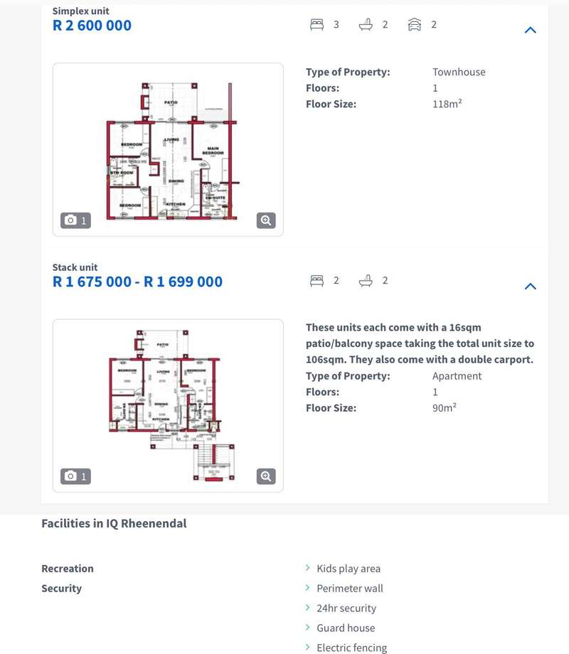 IQ REENENDAL A SAVE SECURE ESTATE A NEW DEVELOPMENT IN RIETVALLEI RAND 116 2 BEDROOM UNITS R1,65 (All cost included) 2 Bedroom 2 bathrooms ensuite 2 Carports Occupation September 2025 71 3 BEDROOMS 2 BATHROOM UNITS SIMPLEX R2,6m (All cost included) 3 bedrooms with double garage Double garages Occupation November 2025 This is a well priced estate for all investors and young professionals and small families. All units with an open plan living area with top of the range finishes. The living area with a dining room and lounge leading through sliding doors to a spacious patio with a builtin braai. The units have pre-paid electricity, backup bulk solar system, solar geyser, inverter and fibre. A perfect location close to Waterkloof High School, various others schools, Castle Gate Shopping Cente, irene Mall and all amenities Selling off plan 24/7 Security with guarded entrance.