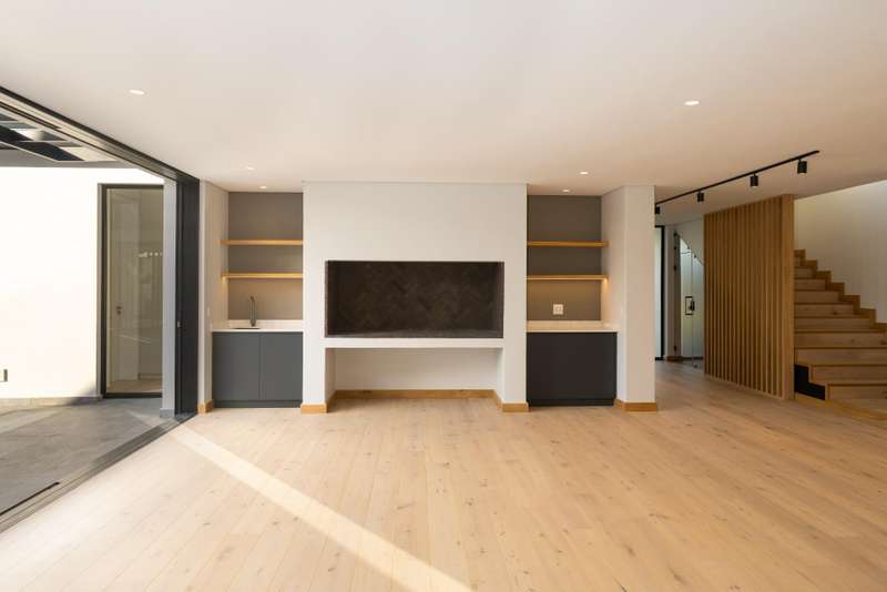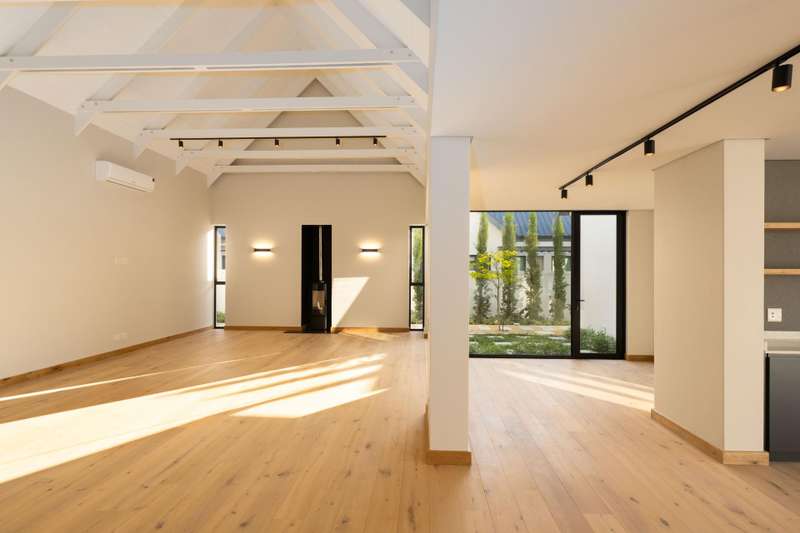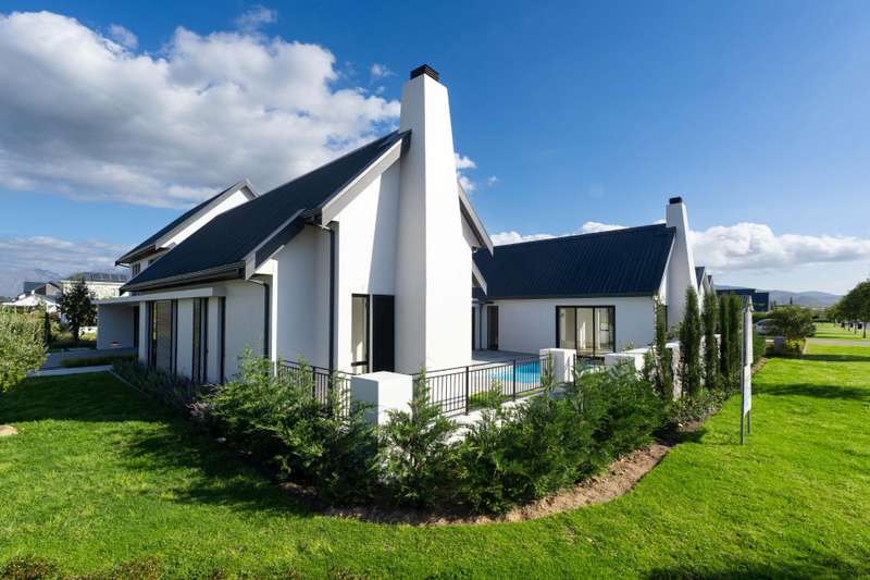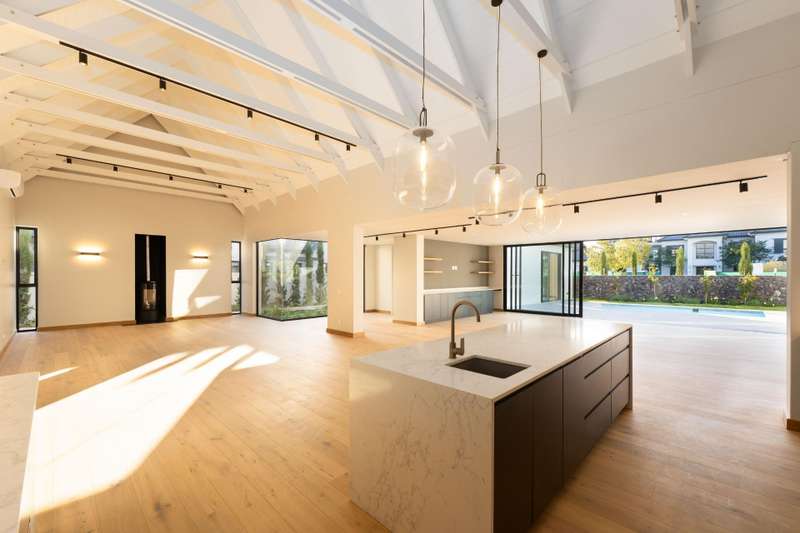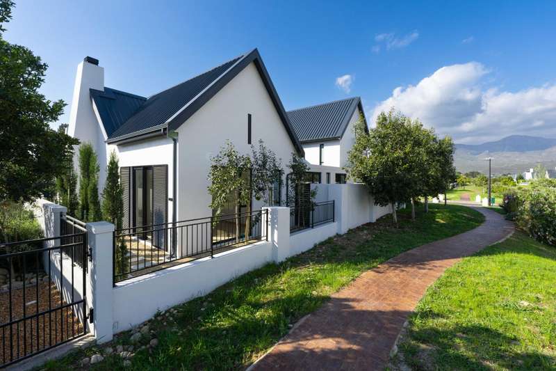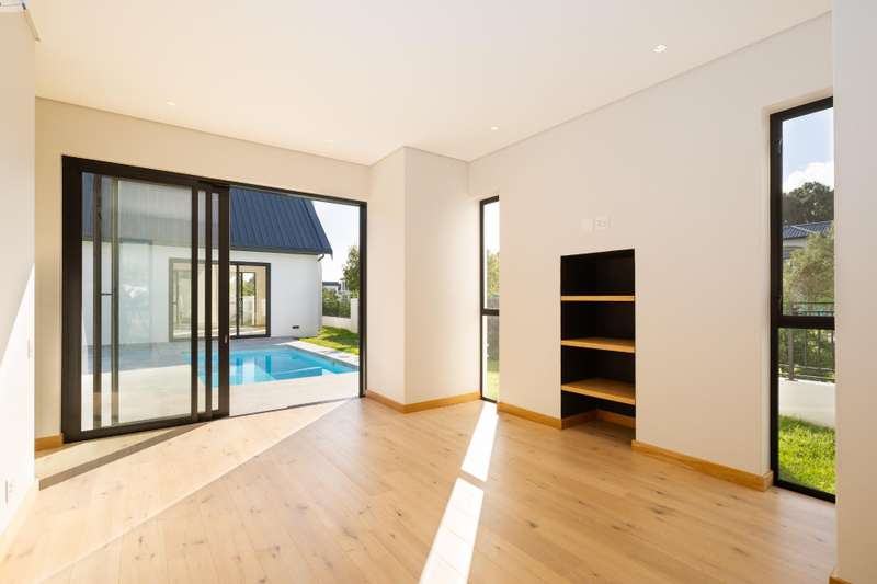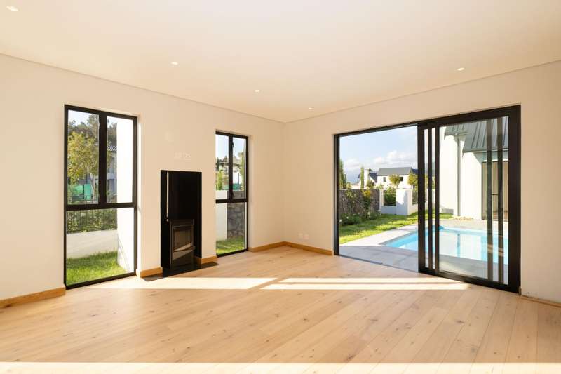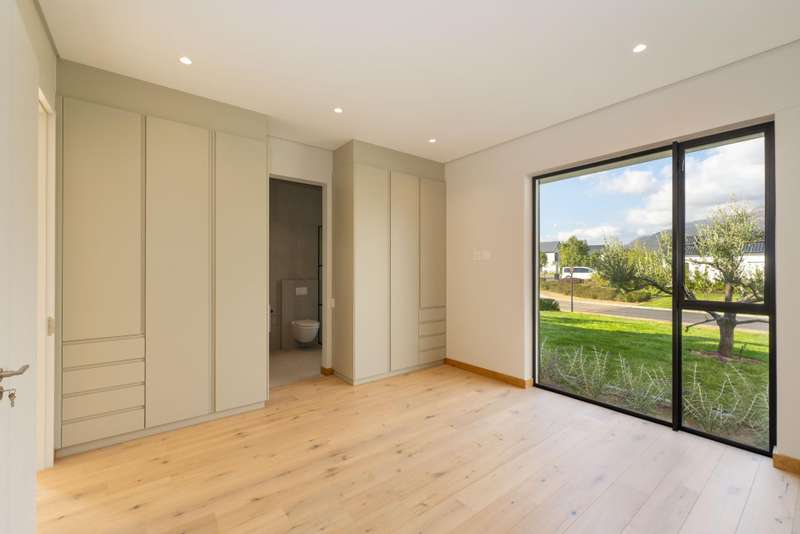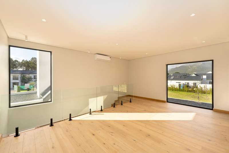 This fresh and modern, 5-bedroom house is situated in La Vue on Val de Vie estate. The indoor spaces are designed for comfort and style with large windows and stacking doors, filling the space with ample natural light. The heart of the home is the sleek open plan kitchen, featuring a separate pantry and generous scullery. The open plan living area with a cozy fireplace, vaulted open truss ceilings, wine display under the staircase, and views to an internal courtyard make this house quite unique. The adjacent entertainment and dining area is perfect for hosting gatherings with a built in braai that invites al fresco dining and expansive stacking doors that lead to a swimming pool, perfect for year round entertainment. The expansive main suite has its own fireplace, large dressing area, en suite bathroom with a double shower, freestanding bath and twin basins. Five spacious en suite bedrooms provide ample room for families or guests. The Upper level leisure lounge could be used as a home office with a private en suite bathroom, ideal for work from home convenience. The property also features a separate flatlet with its own entrance, a triple garage with ample storage, and a full solar and back-up system This home is perfect for growing families, work from home convenience or those who love to entertain.