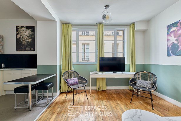 Ideally located in the Sentier district, in the immediate vicinity of Rue Montorgueil, this 50.52 sqm Carrez apartment is nestled on the first floor of an old building, with no living space above.