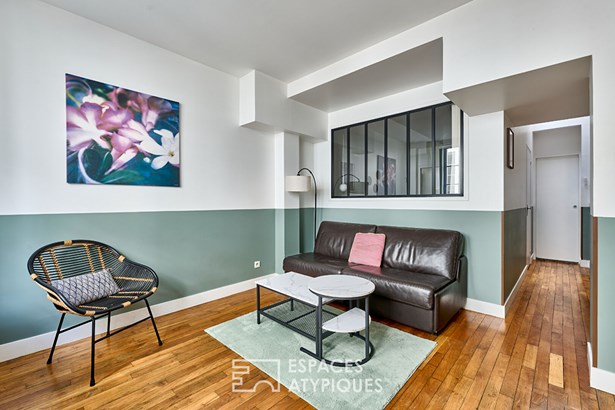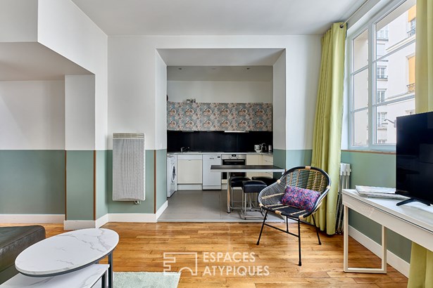 On the street side, the 20.65 sqm living room seduces with its elegant decoration that structures the space. The semi-open kitchen blends harmoniously into the whole. A large double window bathes the whole in natural light.