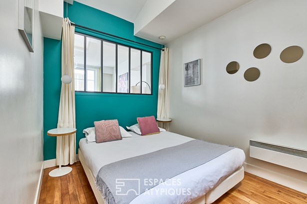 A workshop-style glass roof separates the 9.29 sqm bedroom from the living room, giving an impression of depth and clarity. Designed to combine comfort and practicality, it features generous storage and a blue headboard, creating a cozy atmosphere.