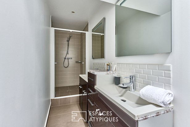 The adjoining 4.92 sqm bathroom combines modernity and practicality. Its metro tiles lend a timeless aesthetic, while the double sink and integrated storage optimize the space. A skylight provides beautiful natural light, creating a bright and pleasant atmosphere.