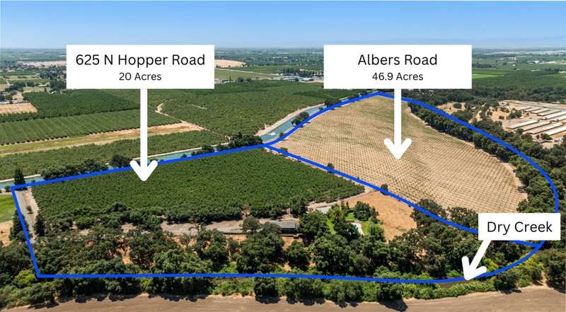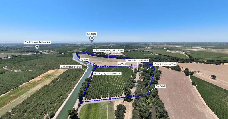 Secluded 67-Acre Dry Creek Luxury Estate Discover the perfect blend of privacy, luxury, and productivity on this stunning 67-acre estate nestled along the banks of Dry Creek. Comprised of two adjacent parcels, the property features approximately 50 acres planted to high-yielding Independence almonds10 acres planted in 2017 now in full production averaging 4,000 lbs per acre, and 40 acres planted in 2024, positioned for strong future yields. Irrigation is supplied by two ag wells and Modesto Irrigation District surface water. The custom 3,962 sq. ft. home offers 4 bedrooms, 4 baths, and expansive living spaces with a large pool and deck overlooking Dry Creekperfect for entertaining or relaxing in total seclusion. Additional potential home sites offer opportunities for a family compound or other possibilities. A rare combination of luxury living and income-producing agriculture. Check with your accountant for potential tax advantages.