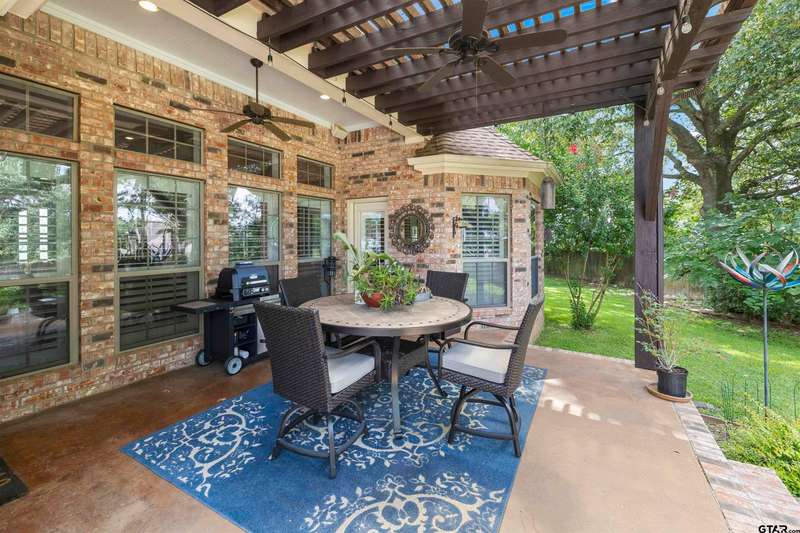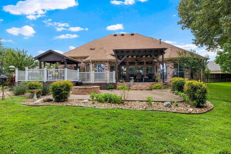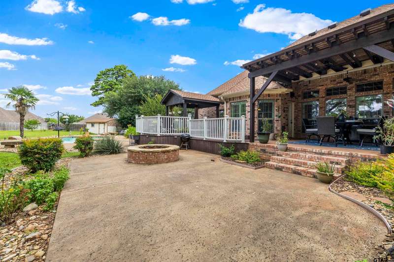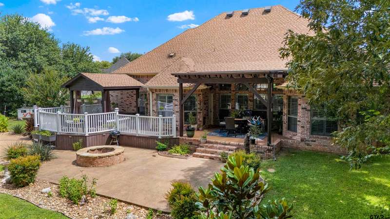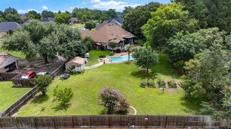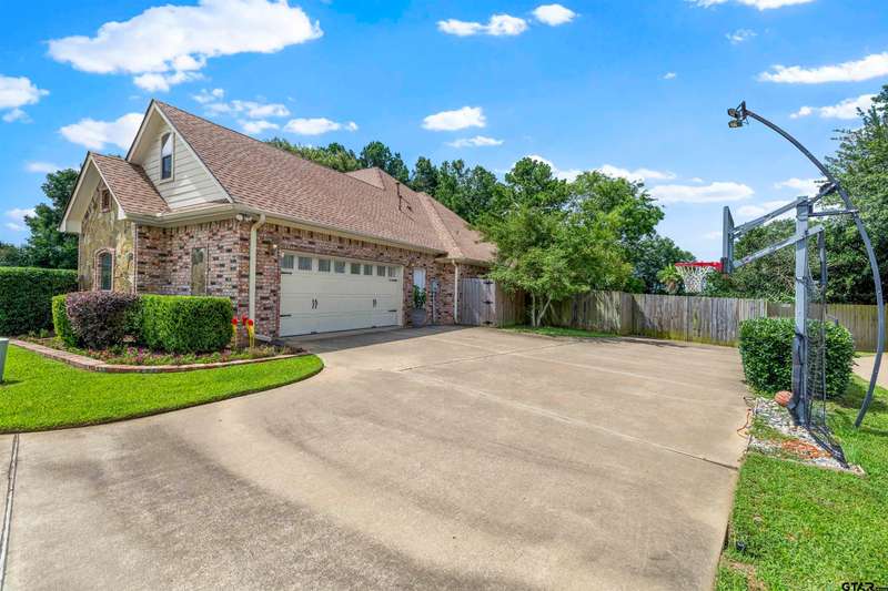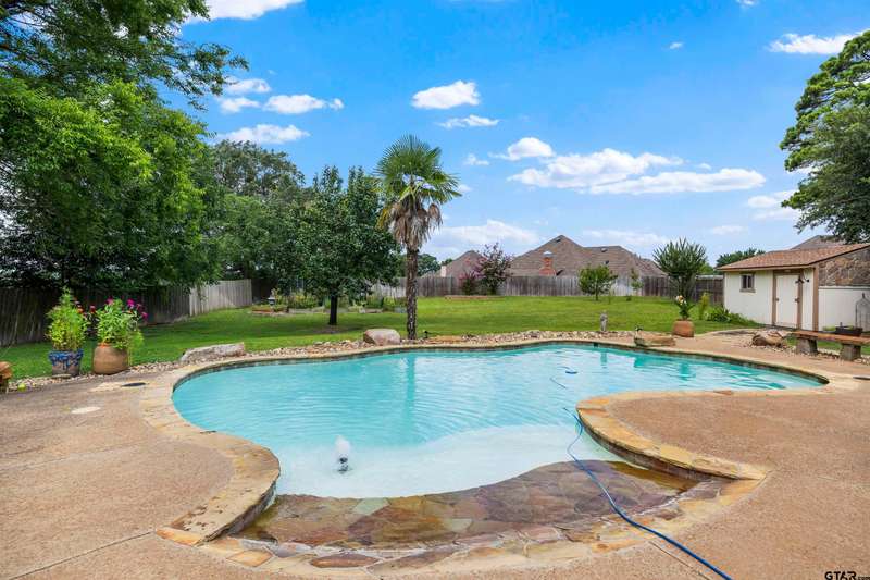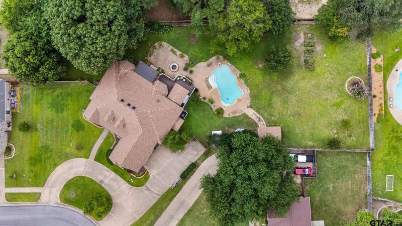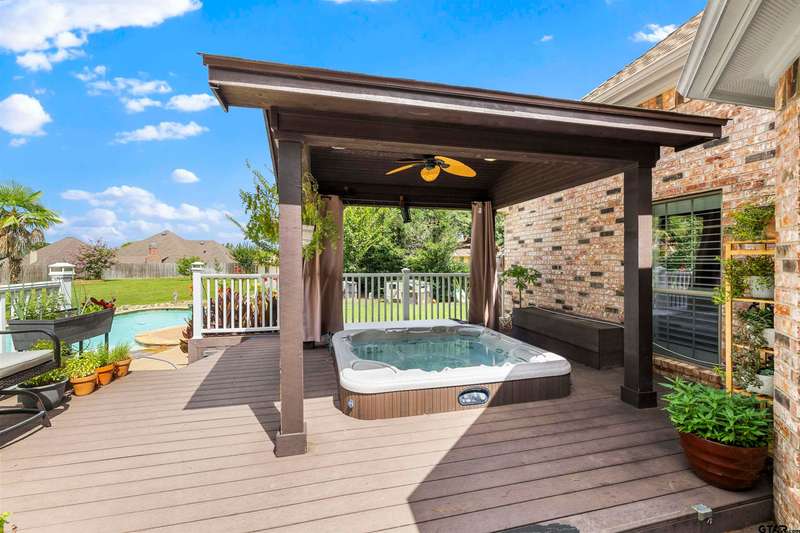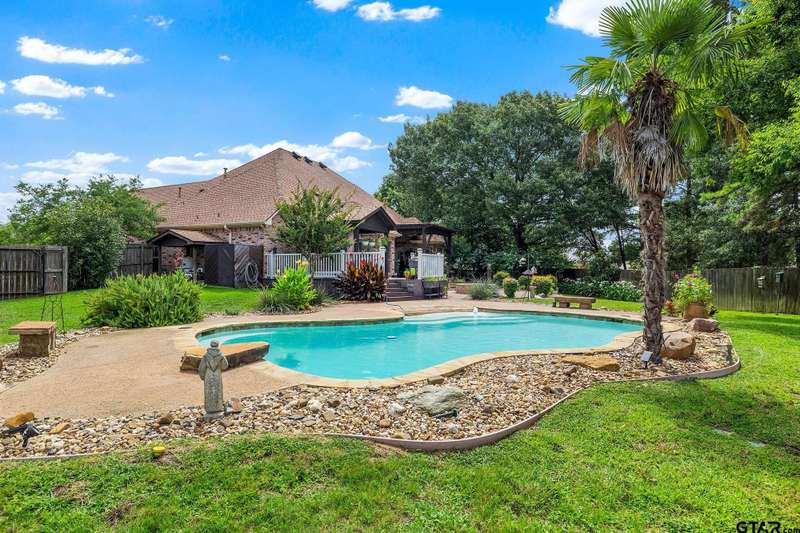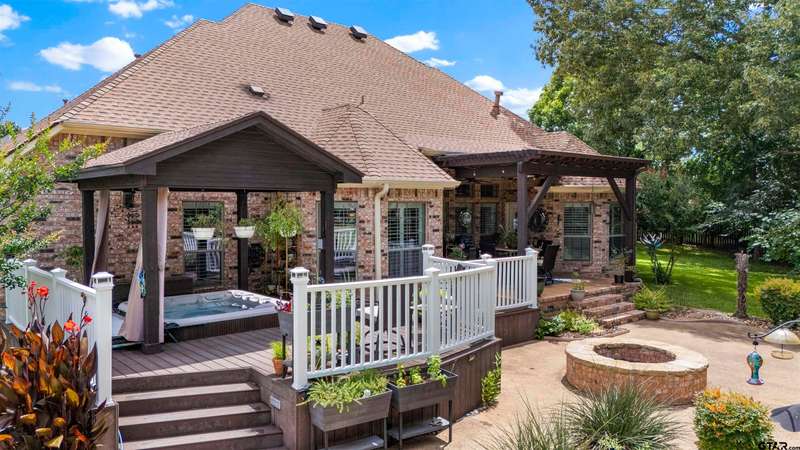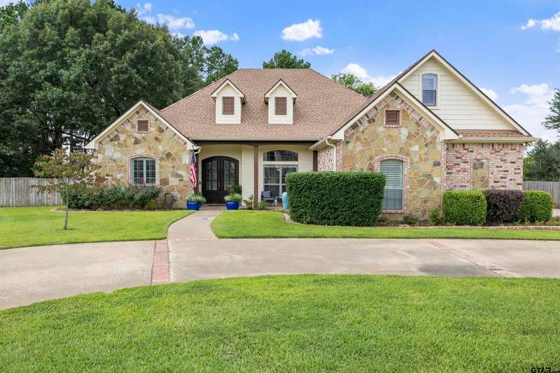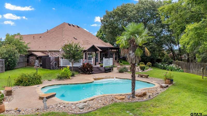 Charming home in quaint neighborhood in south Tyler, close to shopping, restaurants, and entertainment. This beautifully maintained home offers the perfect blend of comfort, convenience, and tranquility. Situated on an oversized double lot with a circle drive, the property boasts incredible outdoor living features including a sparkling pool, relaxing hot tub, fire pit, covered patio, perfect for enjoying East Texas sunsets, and a welcoming front porch. Inside, the open-concept layout features 3 bedrooms, 2.5 baths, a dedicated office, two dining areas, and an upstairs bonus room. The spacious kitchen is equipped with high-end appliances, farmhouse sink, double oven, a breakfast bar, generous pantry, and a convenient door leading directly to the backyard for seamless outdoor grilling and entertaining. The split-bedroom design offers a private retreat in the primary suite, which includes direct patio access for easy enjoyment of the pool and hot tub. The luxurious en-suite bath with heated floors, walk in shower, and ample closet space add to the appeal. Two guest bedrooms are connected by a Jack and Jill bathroom, with a double sink vanity, ensuring comfort and privacy. Additional highlights include a large walk-in laundry room with access from the garage, a Trex low maintenance deck, landscape uplighting, plugs in eaves for holiday lights, and thoughtful finishes throughout. Whether hosting friends or enjoying a quiet evening at home, this property offers a unique lifestyle opportunity with a warm country ambiance and modern conveniences.
