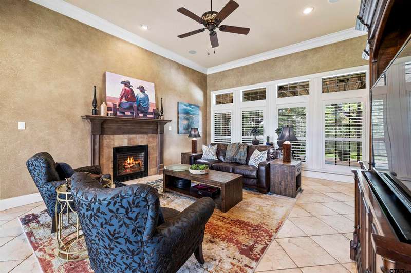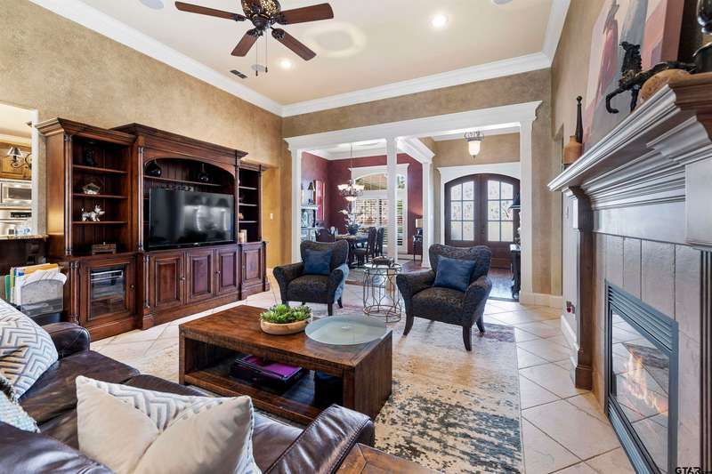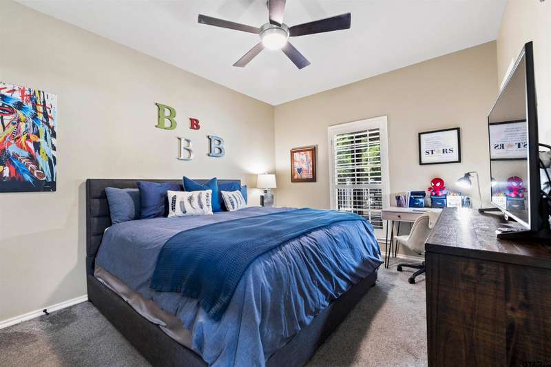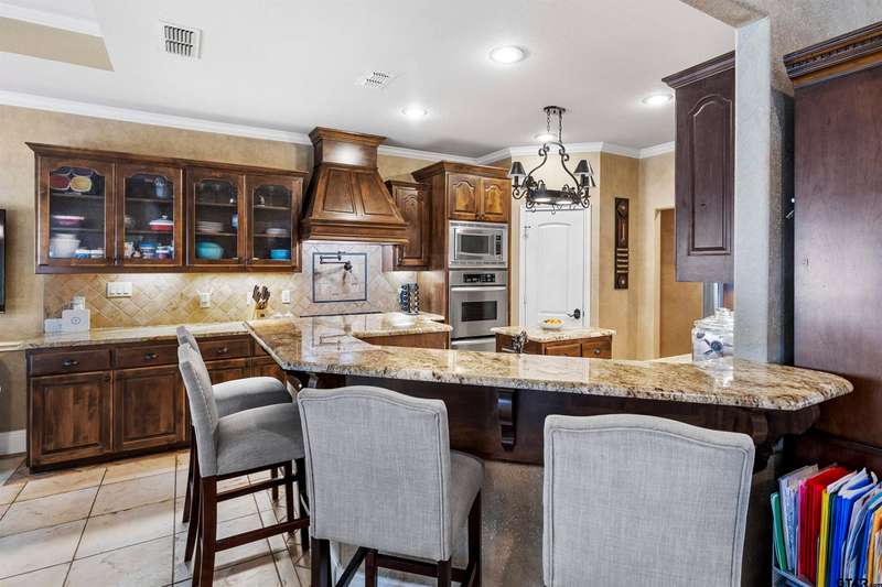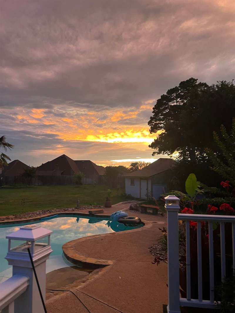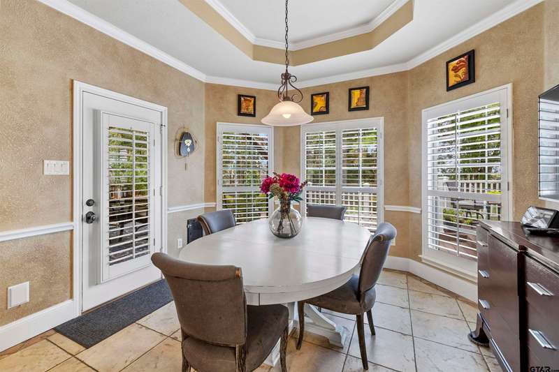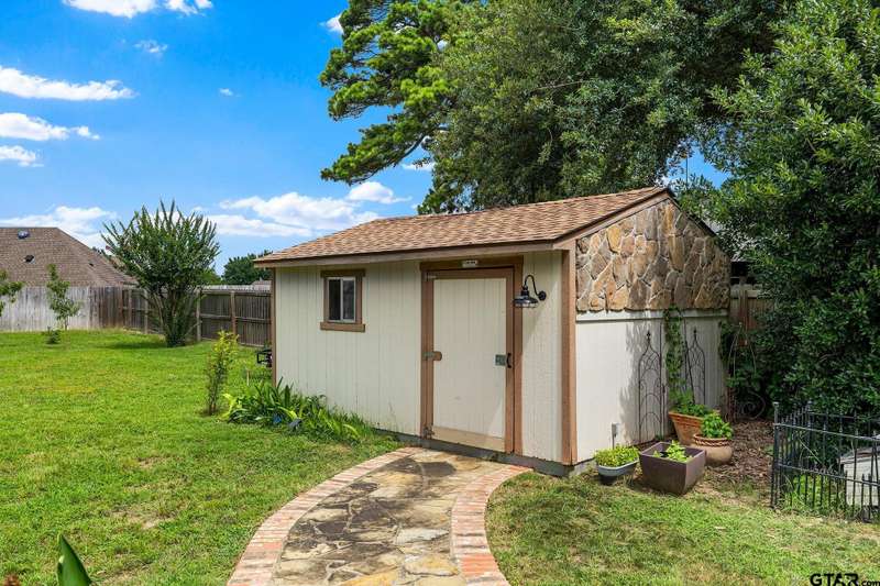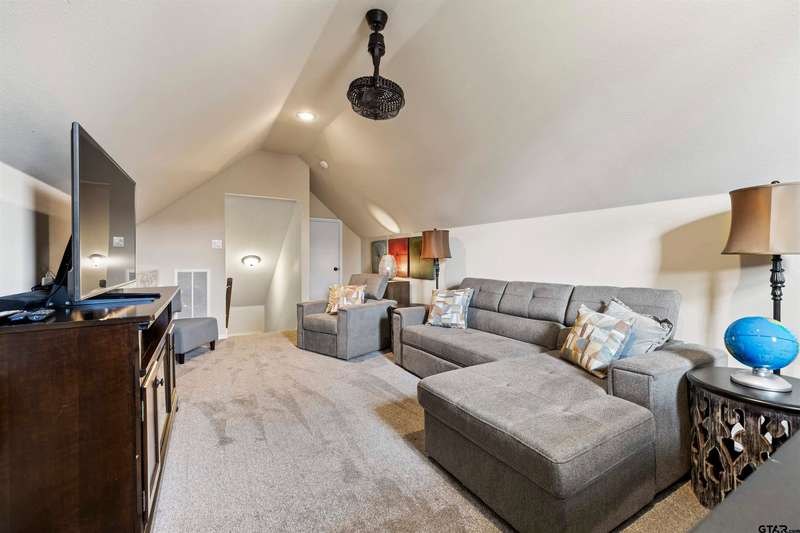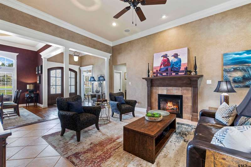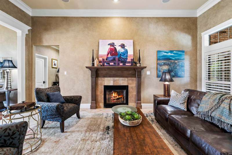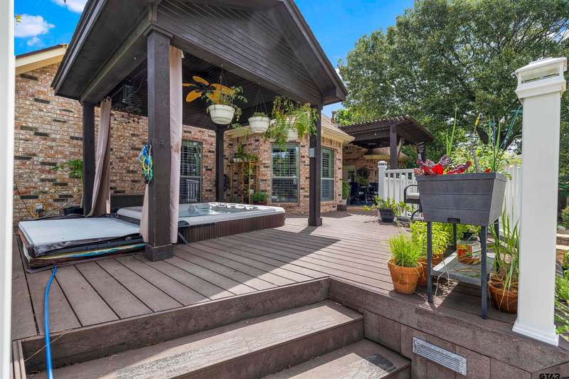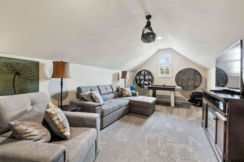 Charming home in quaint neighborhood in south Tyler, close to shopping, restaurants, and entertainment. This beautifully maintained home offers the perfect blend of comfort, convenience, and tranquility. Situated on an oversized double lot with a circle drive, the property boasts incredible outdoor living features including a sparkling pool, relaxing hot tub, fire pit, covered patio, perfect for enjoying East Texas sunsets, and a welcoming front porch. Inside, the open-concept layout features 3 bedrooms, 2.5 baths, a dedicated office, two dining areas, and an upstairs bonus room. The spacious kitchen is equipped with high-end appliances, farmhouse sink, double oven, a breakfast bar, generous pantry, and a convenient door leading directly to the backyard for seamless outdoor grilling and entertaining. The split-bedroom design offers a private retreat in the primary suite, which includes direct patio access for easy enjoyment of the pool and hot tub. The luxurious en-suite bath with heated floors, walk in shower, and ample closet space add to the appeal. Two guest bedrooms are connected by a Jack and Jill bathroom, with a double sink vanity, ensuring comfort and privacy. Additional highlights include a large walk-in laundry room with access from the garage, a Trex low maintenance deck, landscape uplighting, plugs in eaves for holiday lights, and thoughtful finishes throughout. Whether hosting friends or enjoying a quiet evening at home, this property offers a unique lifestyle opportunity with a warm country ambiance and modern conveniences.