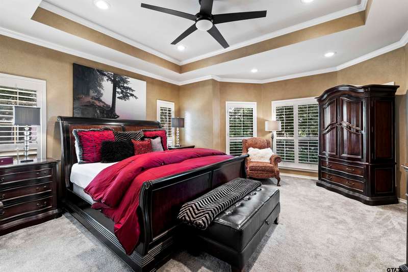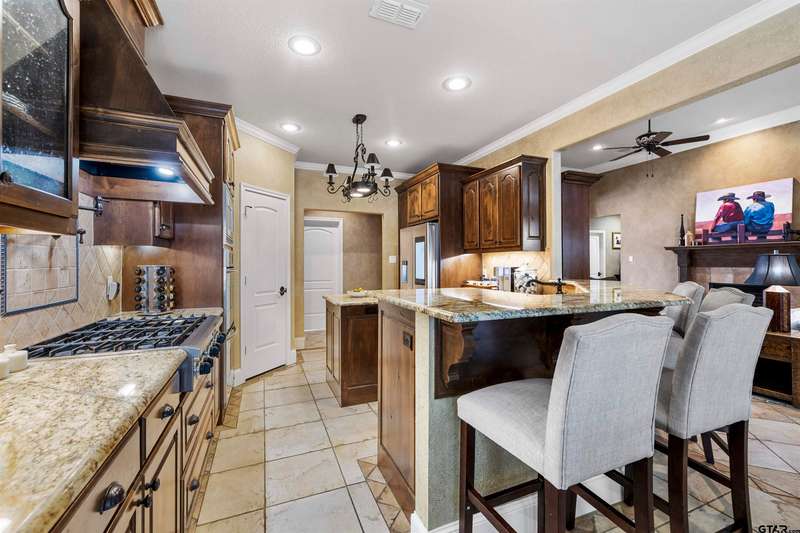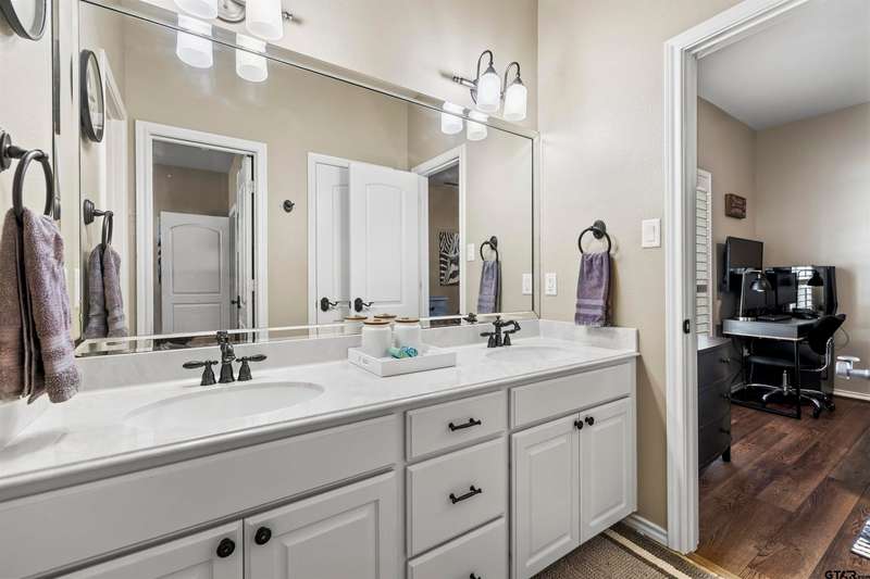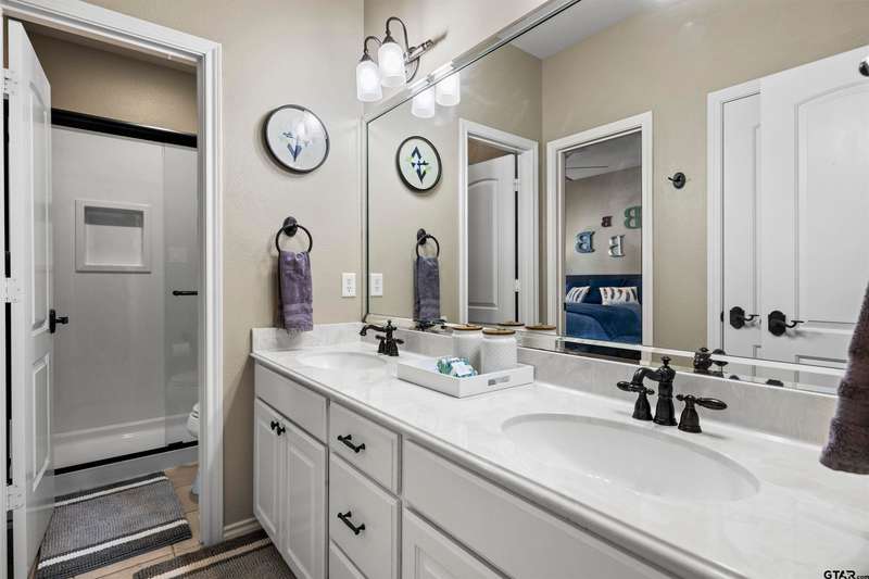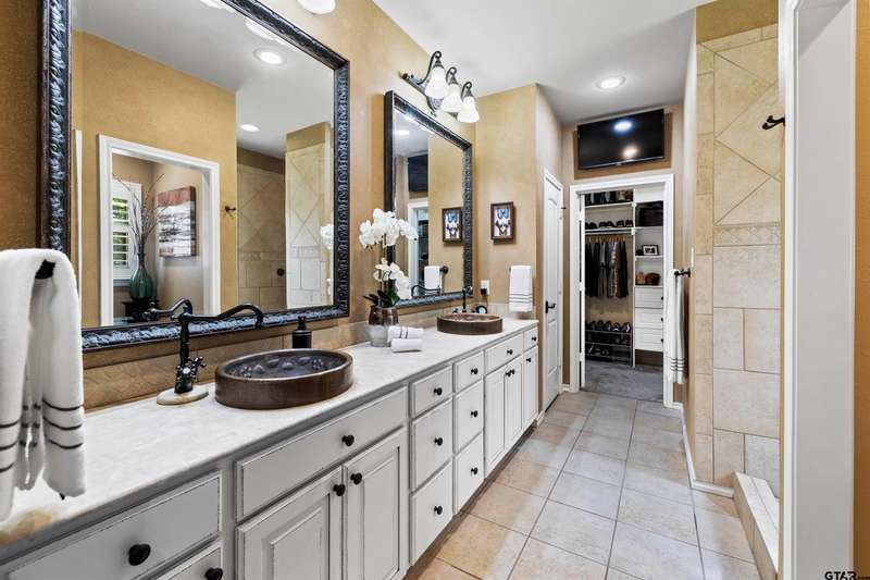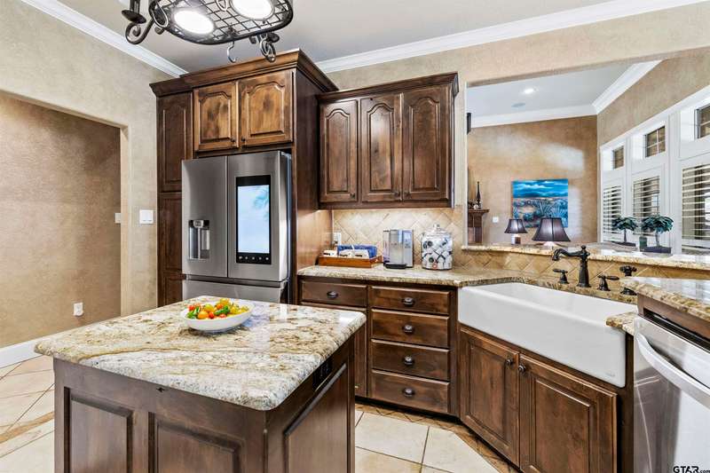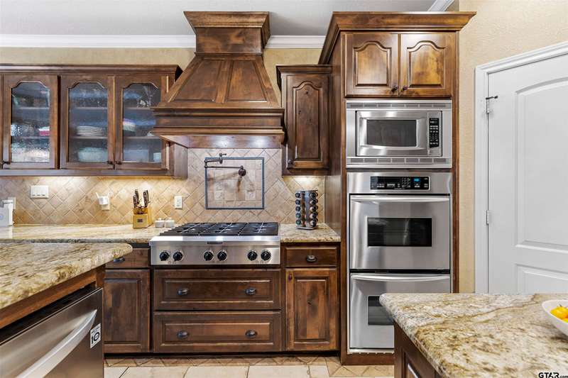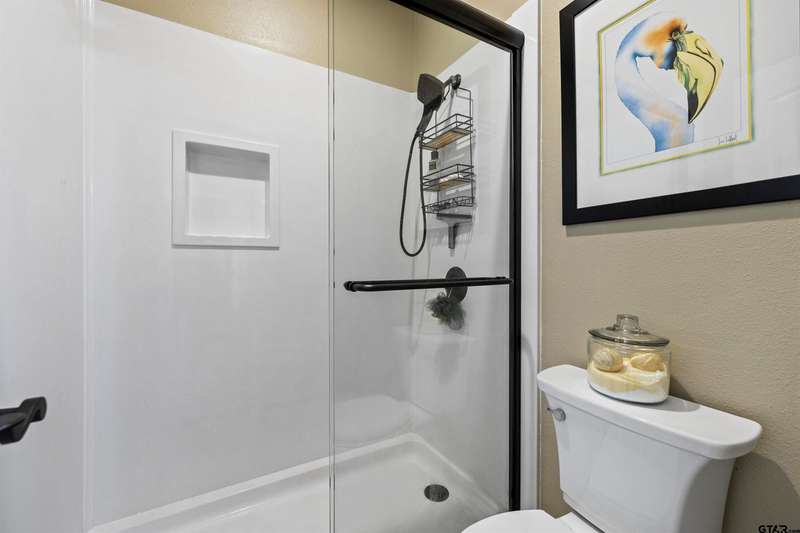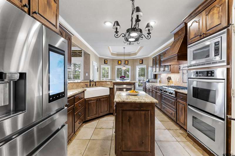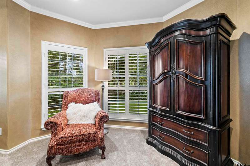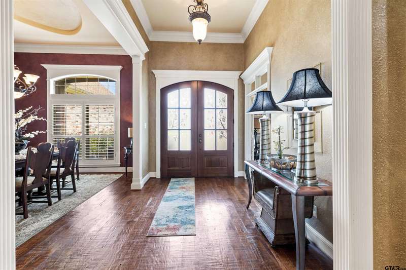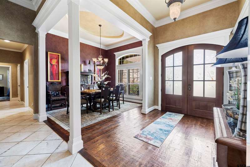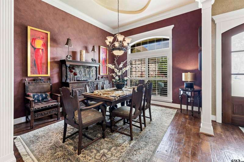 Charming home in quaint neighborhood in south Tyler, close to shopping, restaurants, and entertainment. This beautifully maintained home offers the perfect blend of comfort, convenience, and tranquility. Situated on an oversized double lot with a circle drive, the property boasts incredible outdoor living features including a sparkling pool, relaxing hot tub, fire pit, covered patio, perfect for enjoying East Texas sunsets, and a welcoming front porch. Inside, the open-concept layout features 3 bedrooms, 2.5 baths, a dedicated office, two dining areas, and an upstairs bonus room. The spacious kitchen is equipped with high-end appliances, farmhouse sink, double oven, a breakfast bar, generous pantry, and a convenient door leading directly to the backyard for seamless outdoor grilling and entertaining. The split-bedroom design offers a private retreat in the primary suite, which includes direct patio access for easy enjoyment of the pool and hot tub. The luxurious en-suite bath with heated floors, walk in shower, and ample closet space add to the appeal. Two guest bedrooms are connected by a Jack and Jill bathroom, with a double sink vanity, ensuring comfort and privacy. Additional highlights include a large walk-in laundry room with access from the garage, a Trex low maintenance deck, landscape uplighting, plugs in eaves for holiday lights, and thoughtful finishes throughout. Whether hosting friends or enjoying a quiet evening at home, this property offers a unique lifestyle opportunity with a warm country ambiance and modern conveniences.