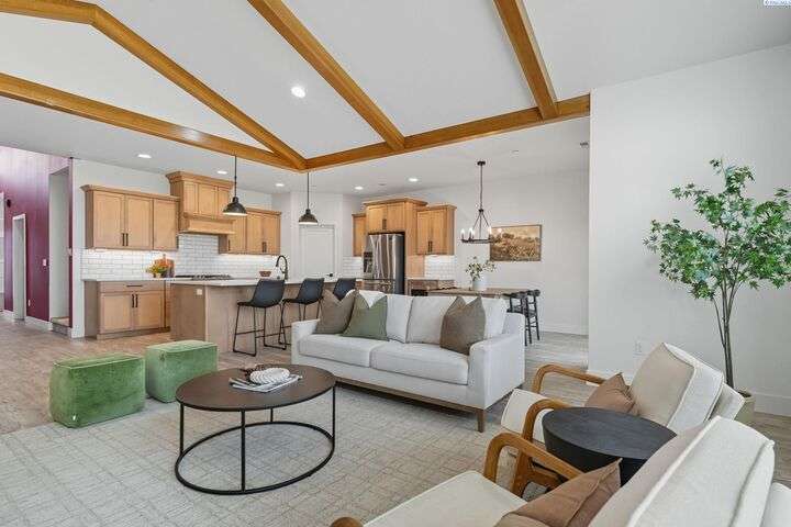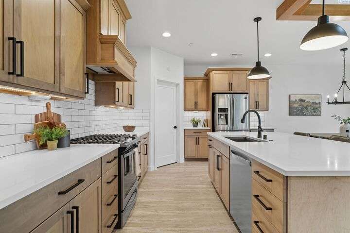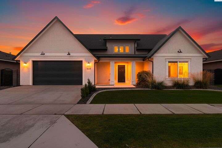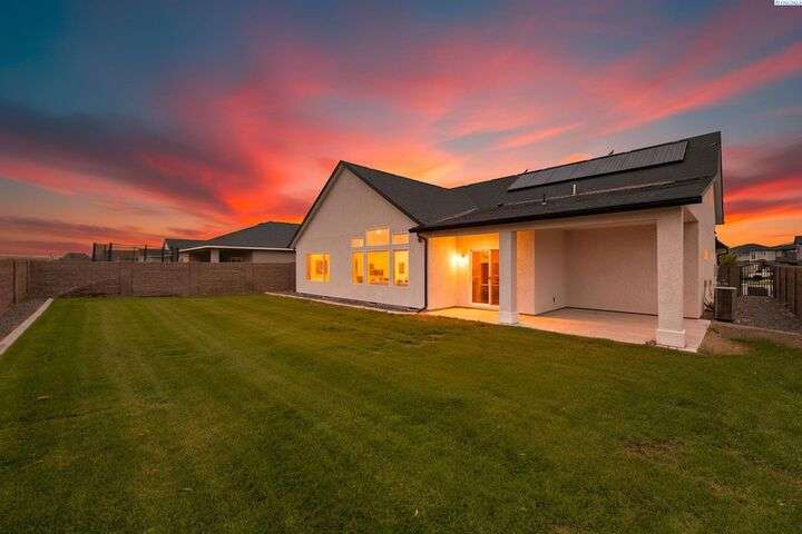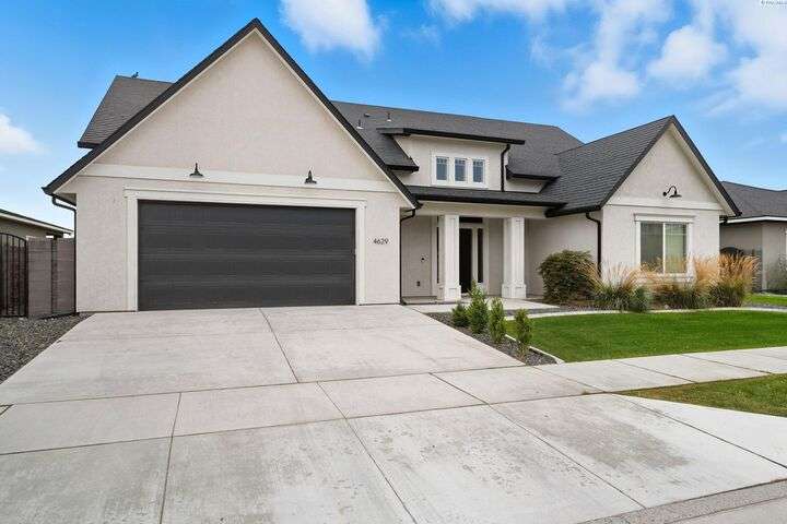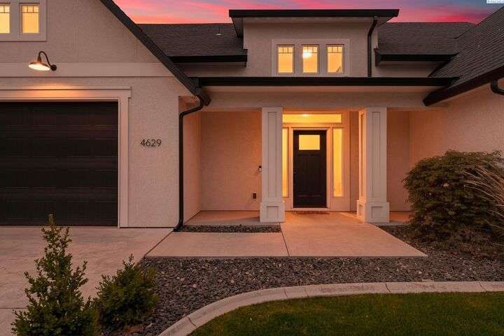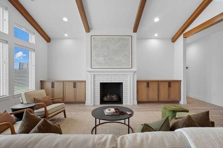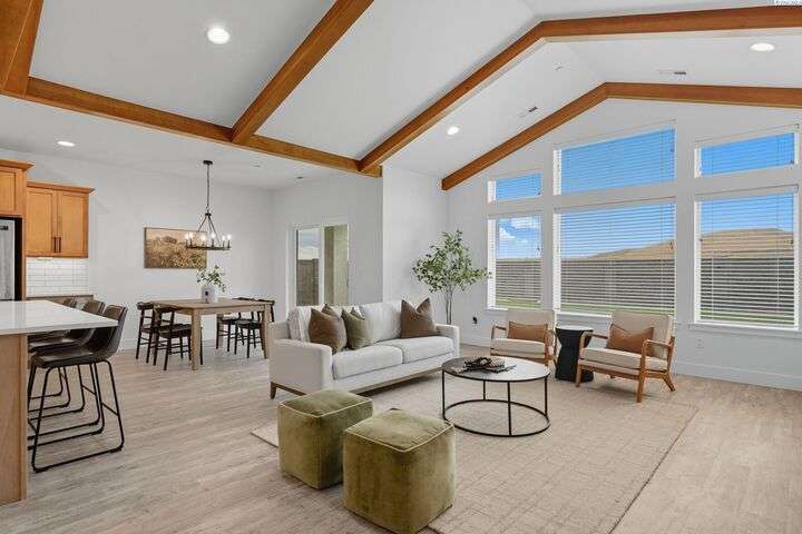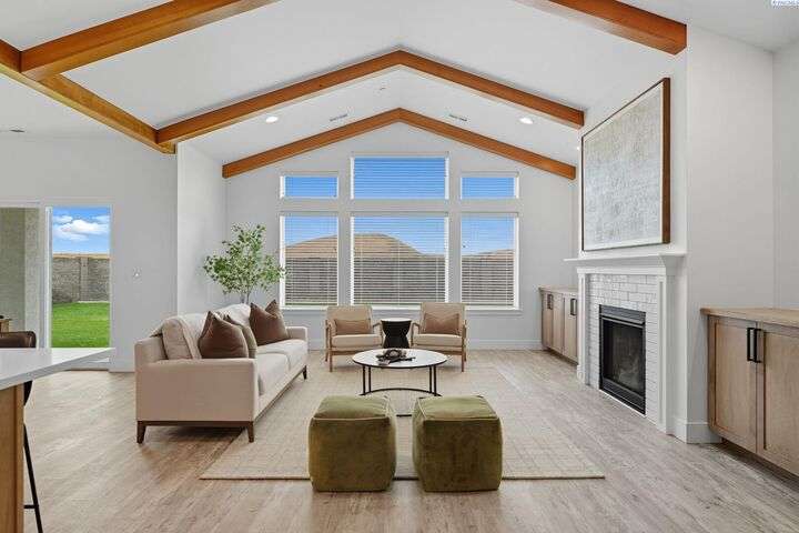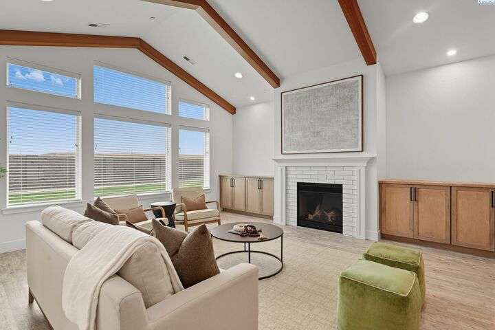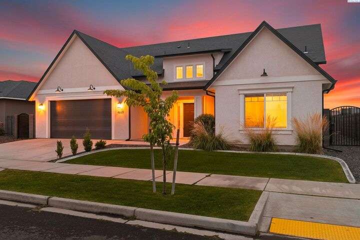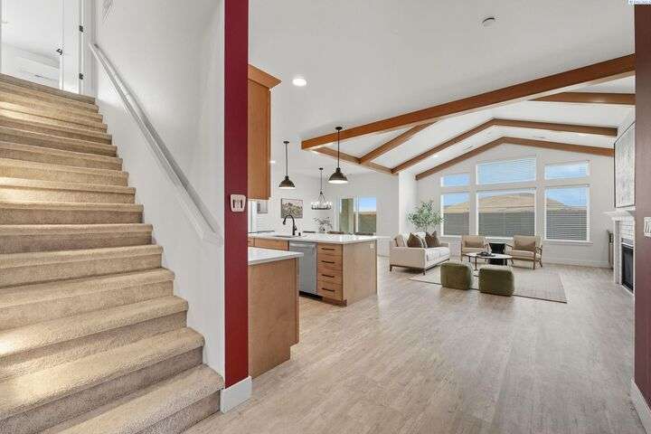 Welcome to the Interlude w/ Bonus Room floor plan by Prodigy Homes, located in the sought-after West Village neighborhood of South Richland! Step inside to an impressive wide entryway with soaring 16-foot ceilings. The foyer includes a mudroom bench and leads seamlessly into the open-concept kitchen and dining area. The kitchen boasts high-end Huntwood cabinets, a large quartz island, spacious pantry, stainless steel appliances, and stylish pendant lighting. The living room features vaulted ceilings with exposed wood beams, a cozy fireplace, and custom built-in cabinetry. The spacious primary suite includes vaulted ceilings and a luxurious ensuite bathroom with a full tile backsplash double vanity, tiled soaker tub, walk-in closet, and walk-in shower. Upstairs, you'll find a large bonus room above the garage, complete with a full bathroom and closet—perfect as a second suite, guest room, or private home office. Enjoy stunning sunset views from the covered back patio. Additional highlights include solar roof tiles to help reduce energy costs and a tandem 3-car garage with epoxy floors. This home is packed with thoughtful details—don’t miss your chance to see it. Contact your favorite Realtor today!