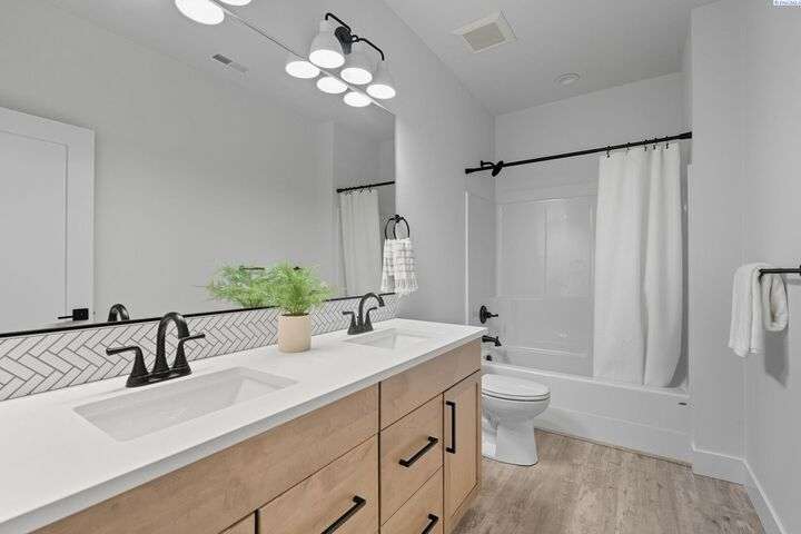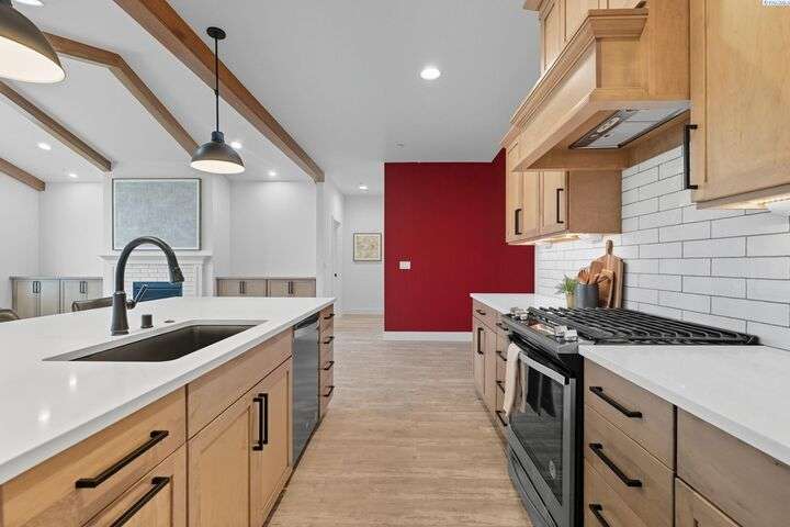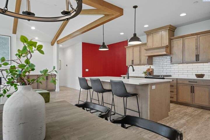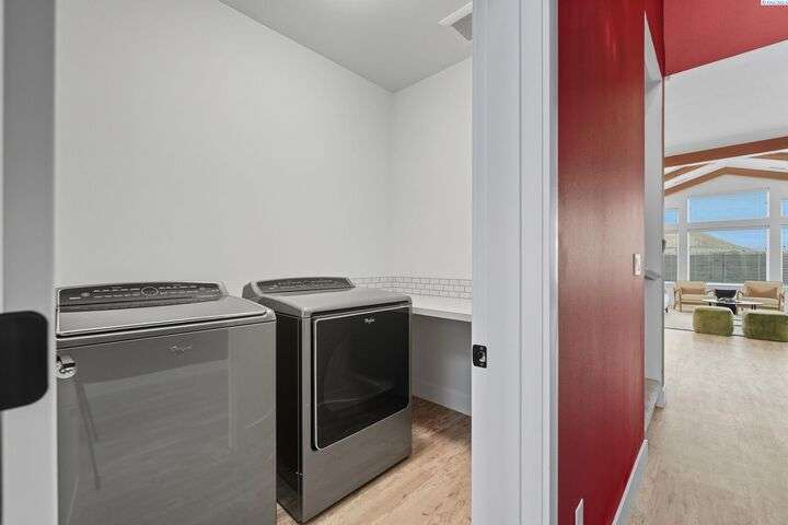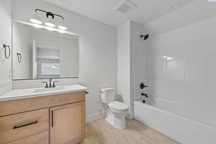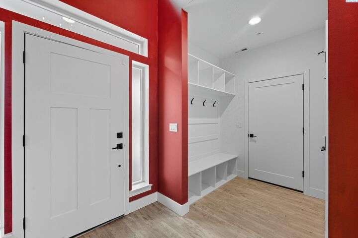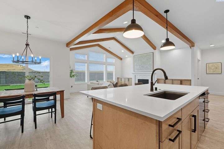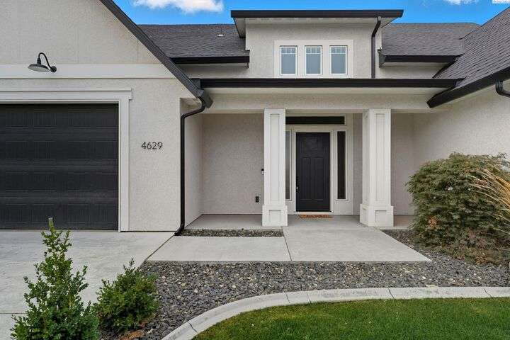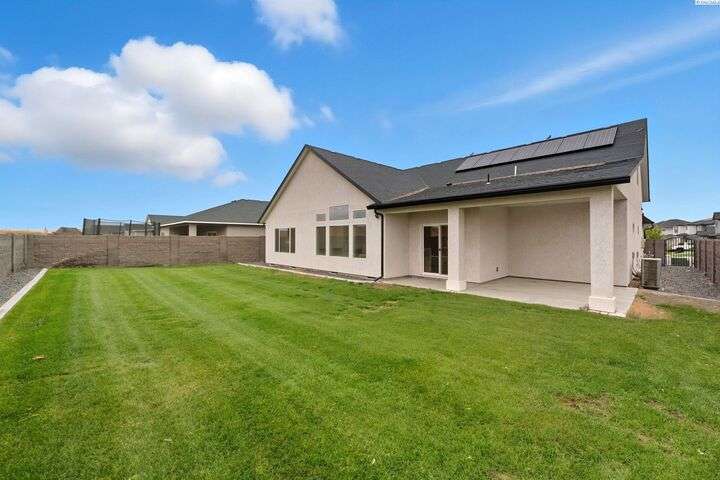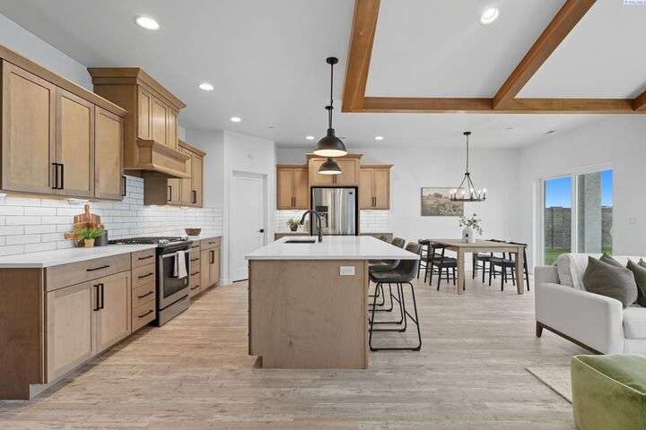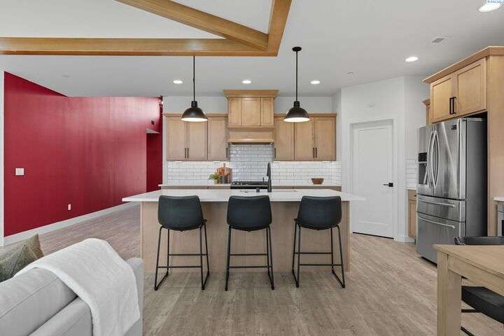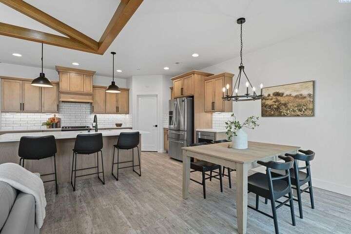 Welcome to the Interlude w/ Bonus Room floor plan by Prodigy Homes, located in the sought-after West Village neighborhood of South Richland! Step inside to an impressive wide entryway with soaring 16-foot ceilings. The foyer includes a mudroom bench and leads seamlessly into the open-concept kitchen and dining area. The kitchen boasts high-end Huntwood cabinets, a large quartz island, spacious pantry, stainless steel appliances, and stylish pendant lighting. The living room features vaulted ceilings with exposed wood beams, a cozy fireplace, and custom built-in cabinetry. The spacious primary suite includes vaulted ceilings and a luxurious ensuite bathroom with a full tile backsplash double vanity, tiled soaker tub, walk-in closet, and walk-in shower. Upstairs, you'll find a large bonus room above the garage, complete with a full bathroom and closet—perfect as a second suite, guest room, or private home office. Enjoy stunning sunset views from the covered back patio. Additional highlights include solar roof tiles to help reduce energy costs and a tandem 3-car garage with epoxy floors. This home is packed with thoughtful details—don’t miss your chance to see it. Contact your favorite Realtor today!