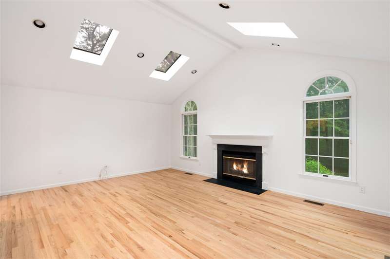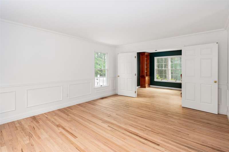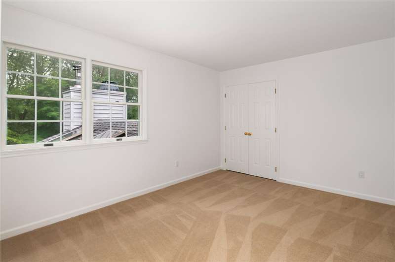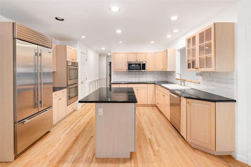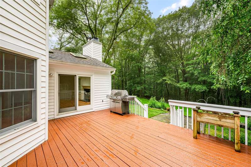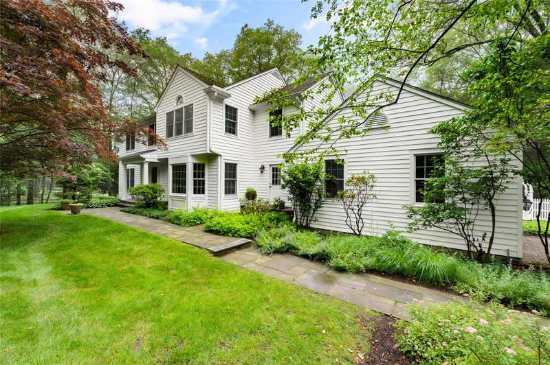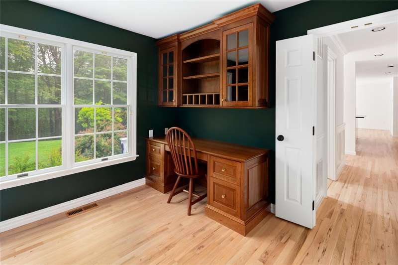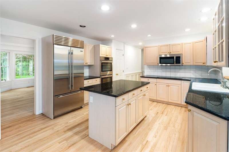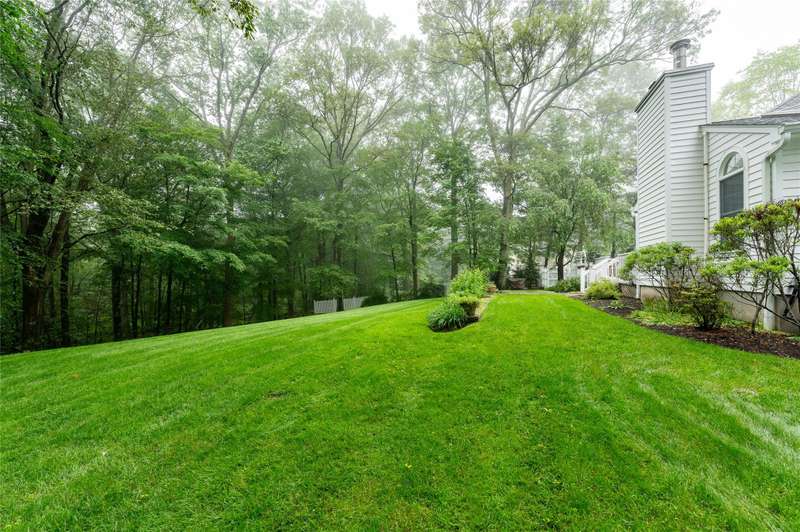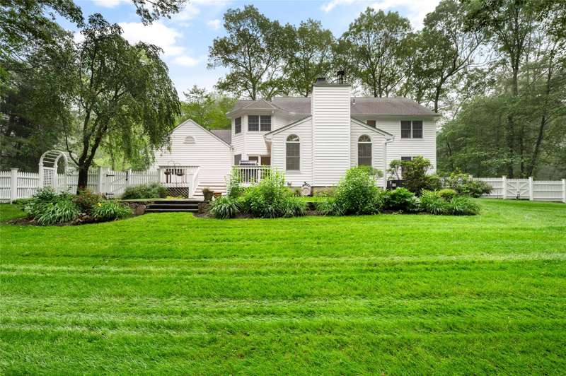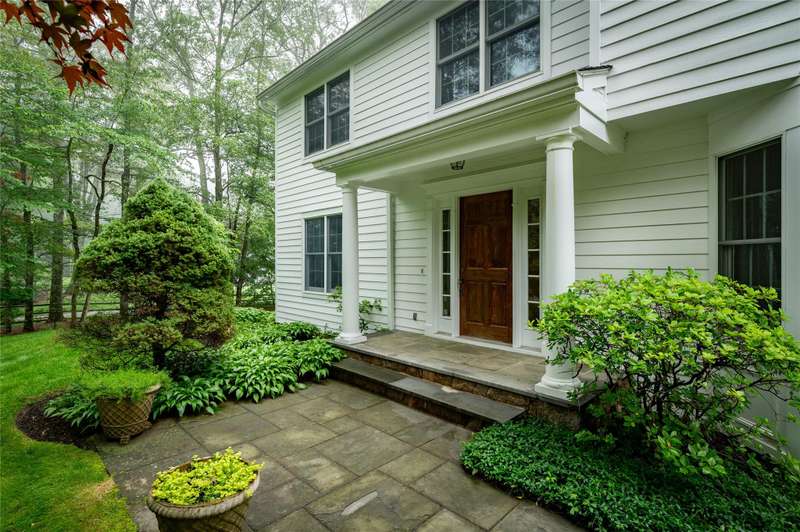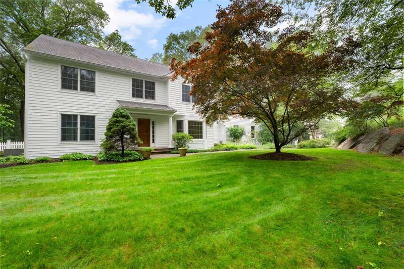 Welcome to this classic 4-bedroom, 4-bathroom Colonial sited at the beginning of a quiet cul-de-sac. With timeless white siding and a two column portico entry, this home offers space, comfort, and elegance in a peaceful setting. Step into a gracious entry hall that leads to a formal dining room and living room. The eat-in kitchen with granite counters and a center island, features top-of-the-line Bosch, Miele & Sub-Zero appliances, pantry and doors to access the deck that opens to the flat, rear yard. Kitchen overlooks and flows seamlessly into a bright and airy family room with a fireplace and four skylights, creating a warm and inviting space. Rounding out the first floor space is a large private office, ideal for today's work from home lifestyle and a first floor laundry room with utility sink and storage. Upstairs, the spacious primary suite boasts refinished hardwood floors, an updated ensuite bath with jacuzzi tub and modern shower, plus dual walk-in closets and an extra closet