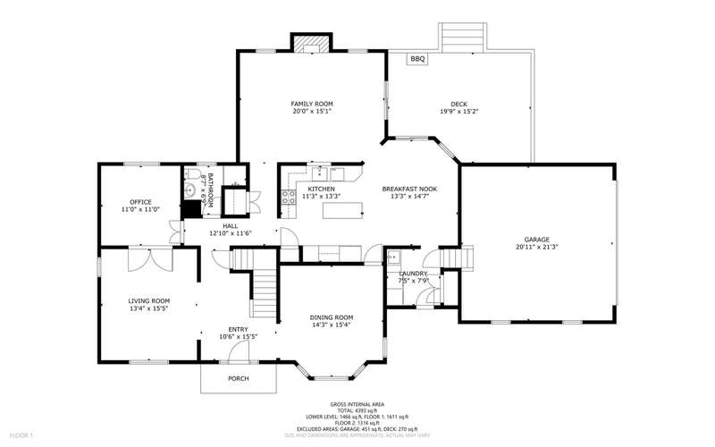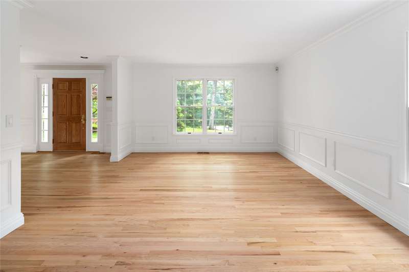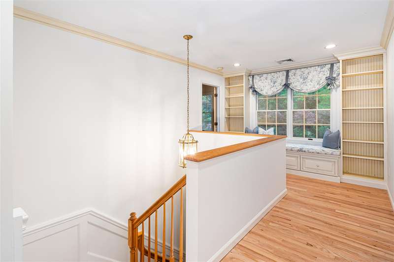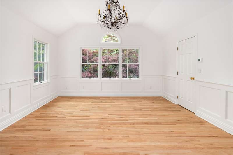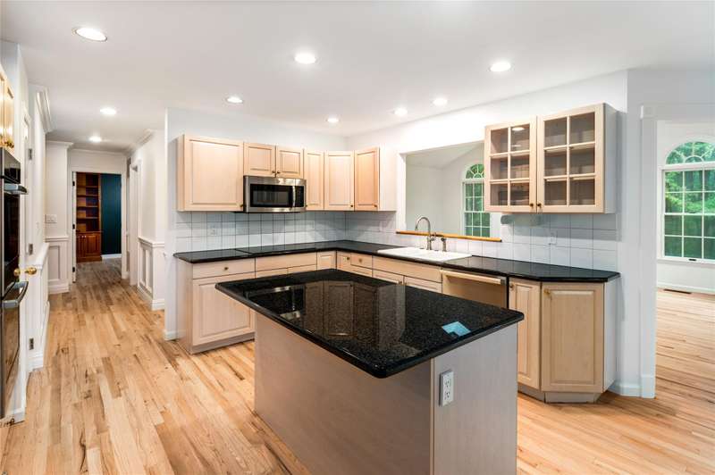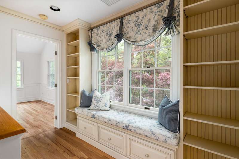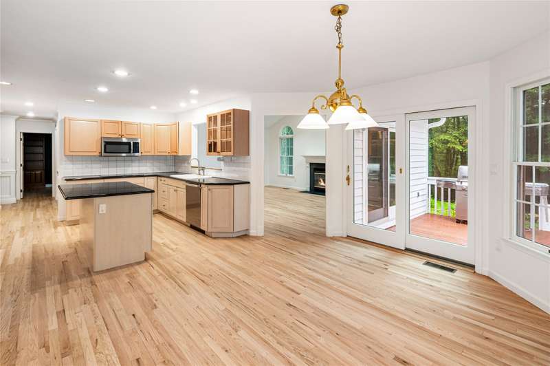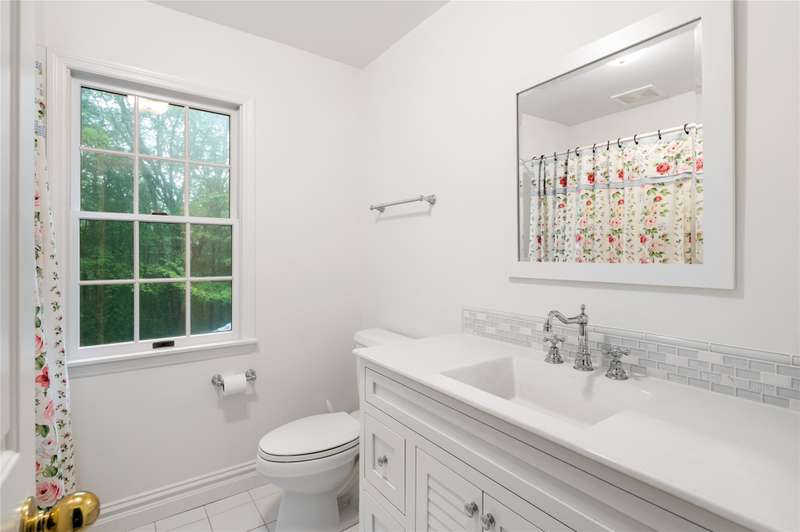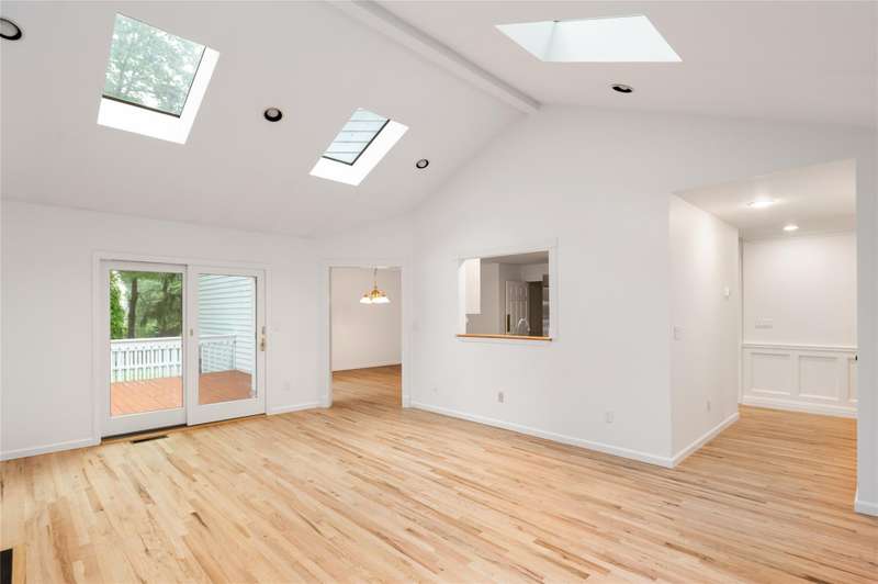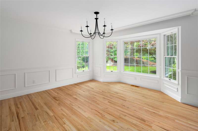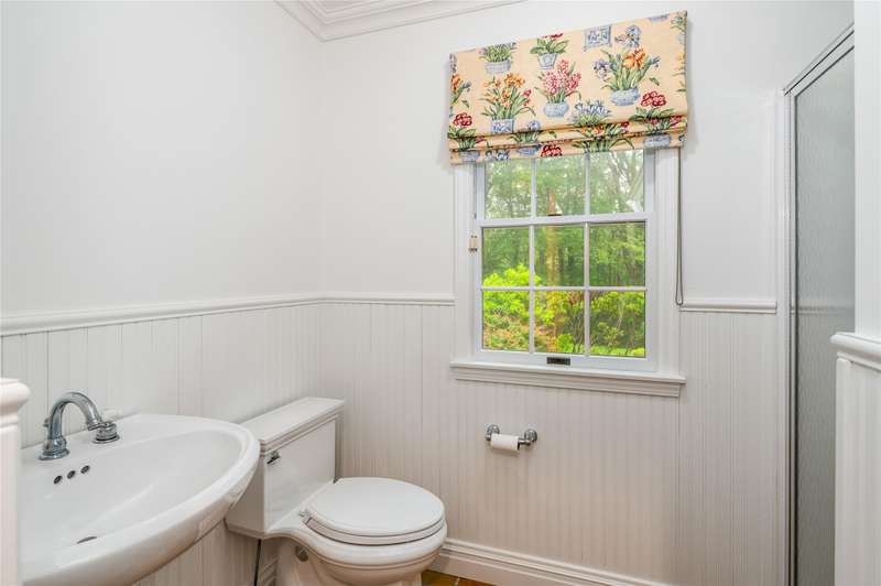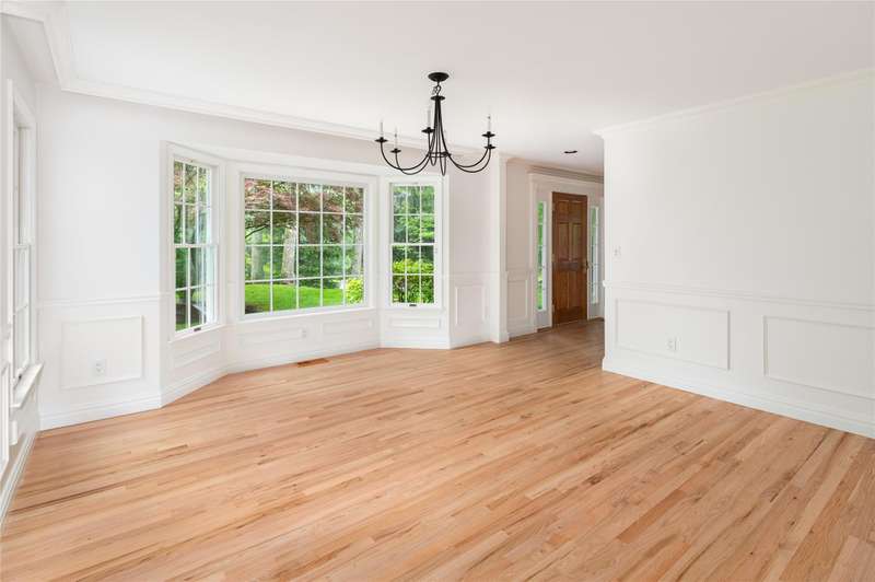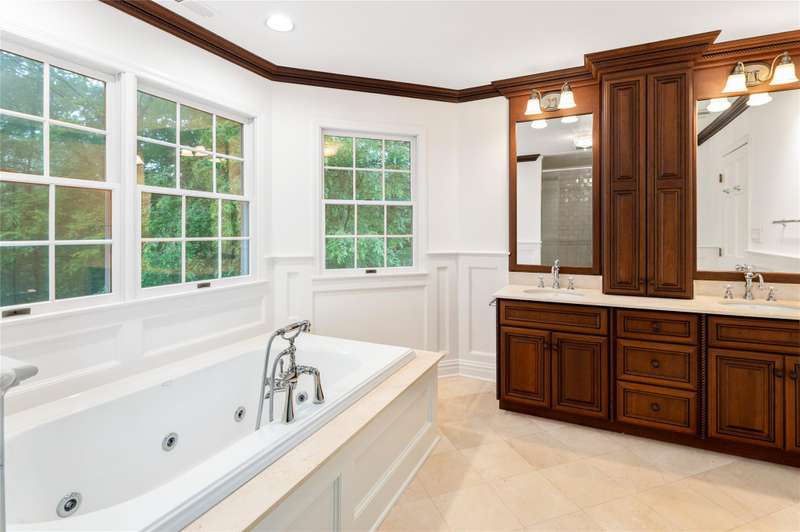 Welcome to this classic 4-bedroom, 4-bathroom Colonial sited at the beginning of a quiet cul-de-sac. With timeless white siding and a two column portico entry, this home offers space, comfort, and elegance in a peaceful setting. Step into a gracious entry hall that leads to a formal dining room and living room. The eat-in kitchen with granite counters and a center island, features top-of-the-line Bosch, Miele & Sub-Zero appliances, pantry and doors to access the deck that opens to the flat, rear yard. Kitchen overlooks and flows seamlessly into a bright and airy family room with a fireplace and four skylights, creating a warm and inviting space. Rounding out the first floor space is a large private office, ideal for today's work from home lifestyle and a first floor laundry room with utility sink and storage. Upstairs, the spacious primary suite boasts refinished hardwood floors, an updated ensuite bath with jacuzzi tub and modern shower, plus dual walk-in closets and an extra closet