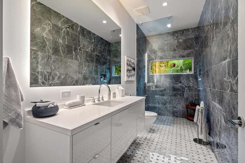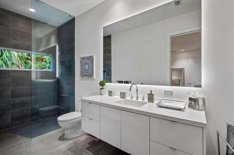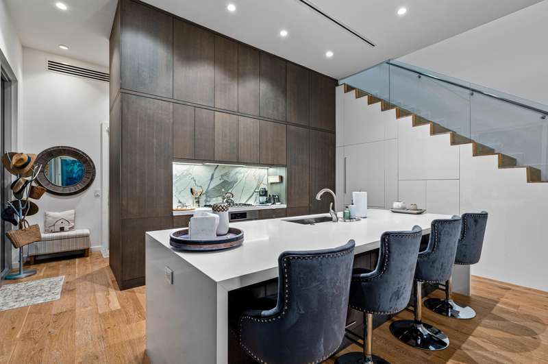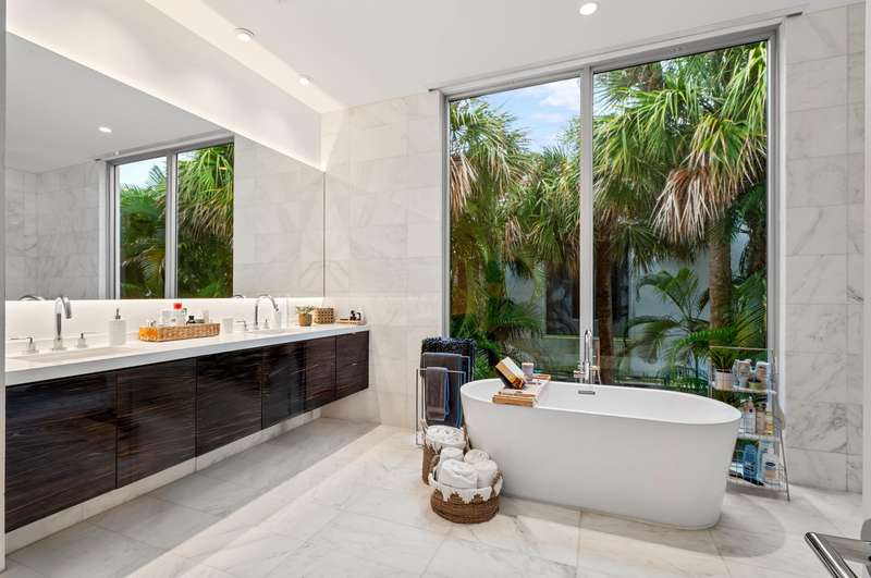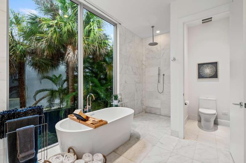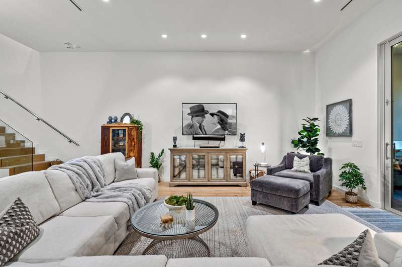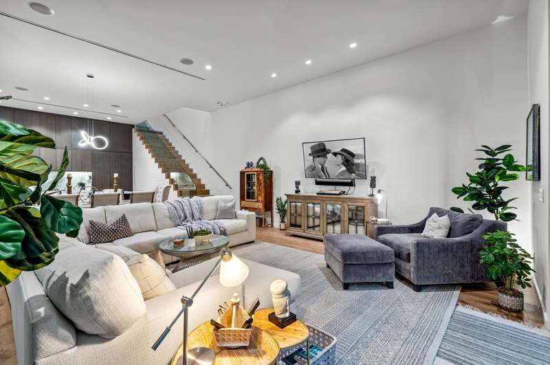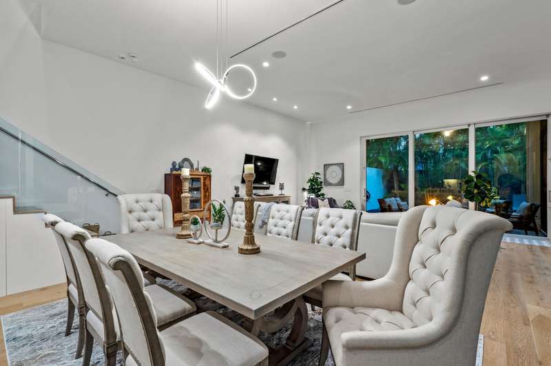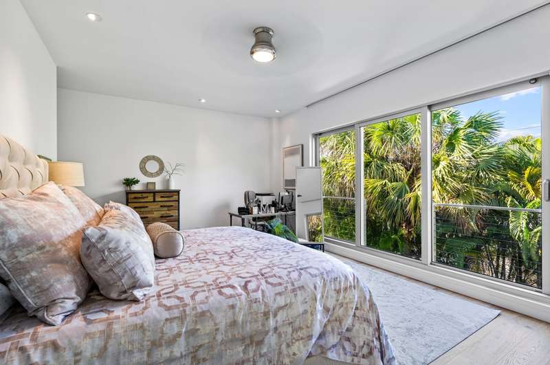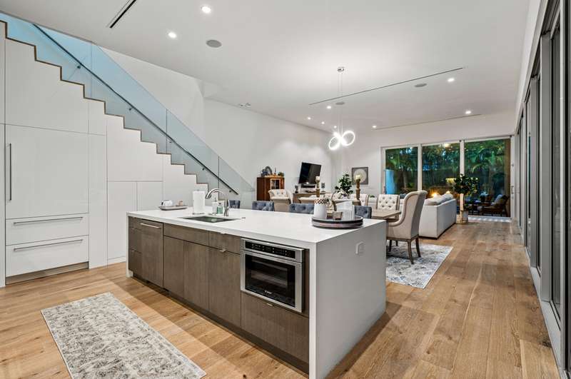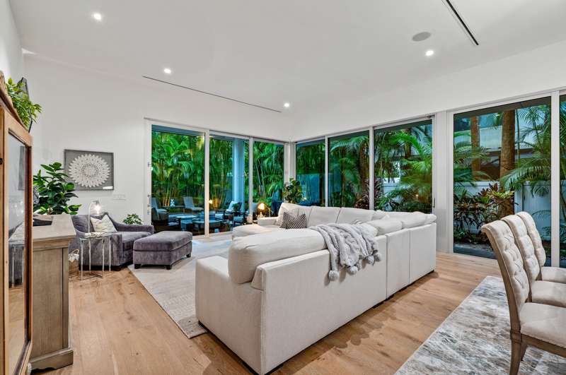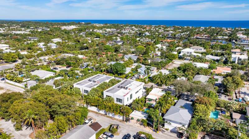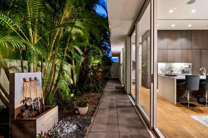 Near Atlantic Avenue and the ocean, this chic custom townhome, with no HOA, features a stunning open floorplan in a unique configuration that creatively elevates the living, dining and kitchen areas into one open, airy living space. Details include walls of glass offering garden and pool-patio views, custom cabinetry, and an outdoor entertaining area set within beautiful tropical landscaping.