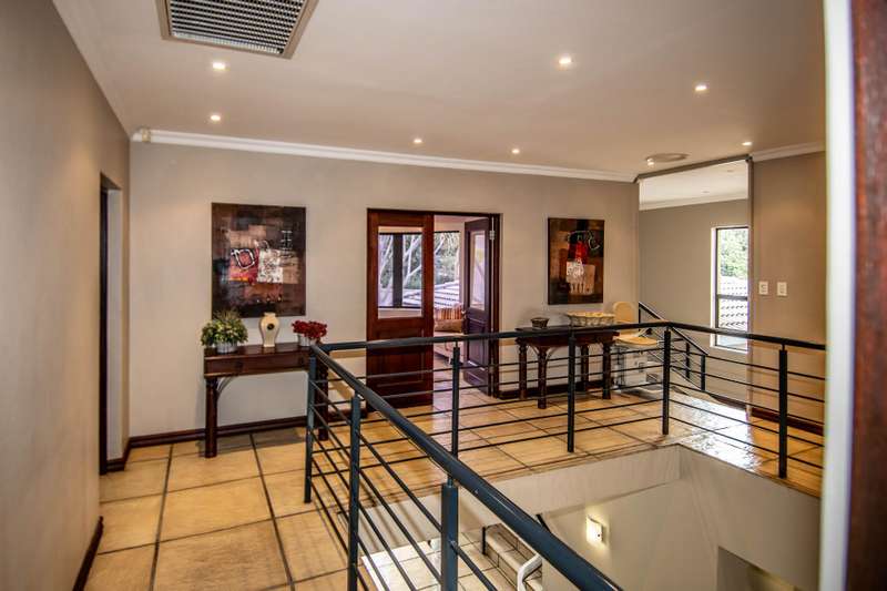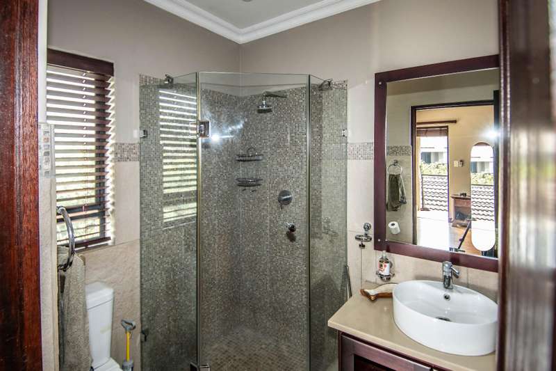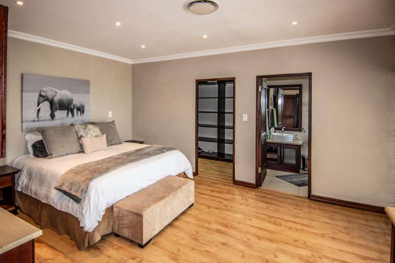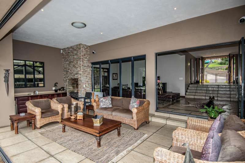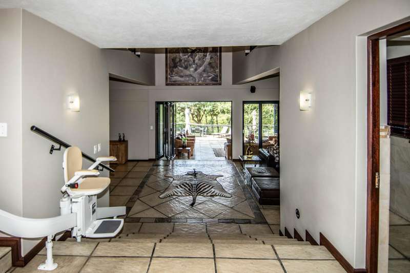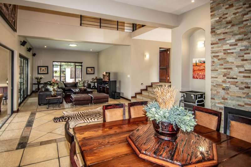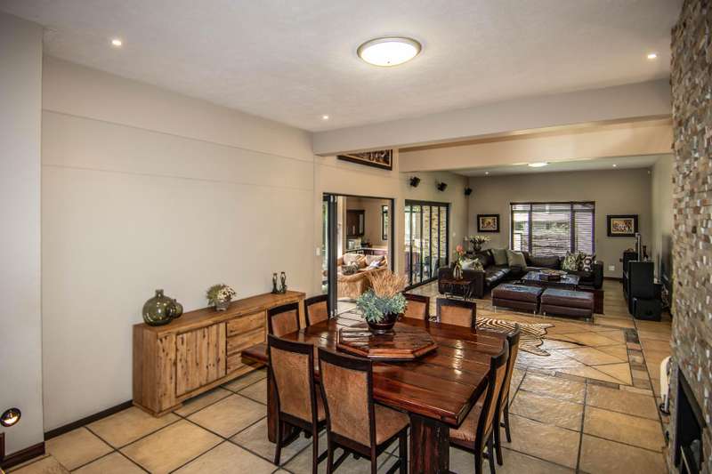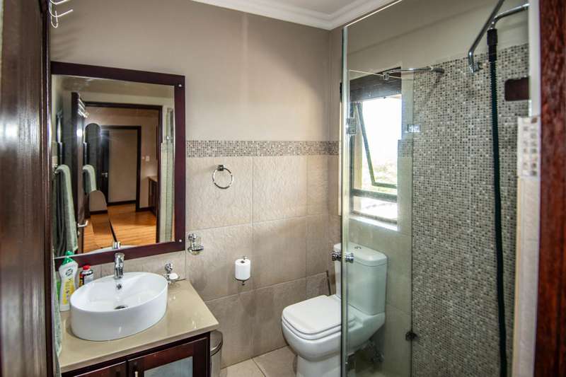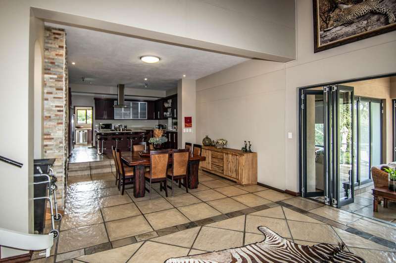 Set within Shandon Eco Reserve, this majestic family home has been impeccably maintained and cherished by it?ÇÖs owner & boasts a feature entrance which flows elegantly through extra large living areas with high ceilings & gas fireplace, off the gourmet kitchen with Caesar Stone counter tops, centre island, gas stove, walk in fridge, pantry, scullery and laundry. The lower level also hosts a study, 2 bedroom guest suite with its own kitchen, lounge and full bathroom the home spills onto a large enclosed patio with built in braai and out onto the private, manicured garden and sparkling swimming pool. The upper level of this mansion presents 3 generous bedrooms with built in cupboards, all complimented by spotless modern bathrooms en suite ( the main has a full bathroom, walk in dressing room and outdoor shower ) and pyjama lounge. Added features include 4 garages with direct access into the home, solar panels, generator, 5000l water storage tanks, borehole and irrigation system. The private boma area with views over nature and surrounding Lowveld gives one a truly unique entertainment option. Shandon eco reserve is a well-managed wildlife estate which offers a tranquil lifestyle, top notch security and roaming Giraffe, Zebra, Kudu and Impala on vast green plains. Located on the outskirts of Nelspruit just a few minutes?ÇÖ drive to the Nelspruit CBD, several schools, major routes and various retail & dining options.