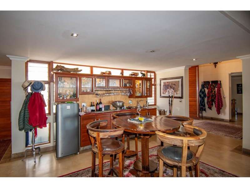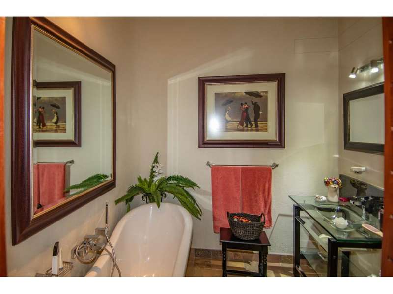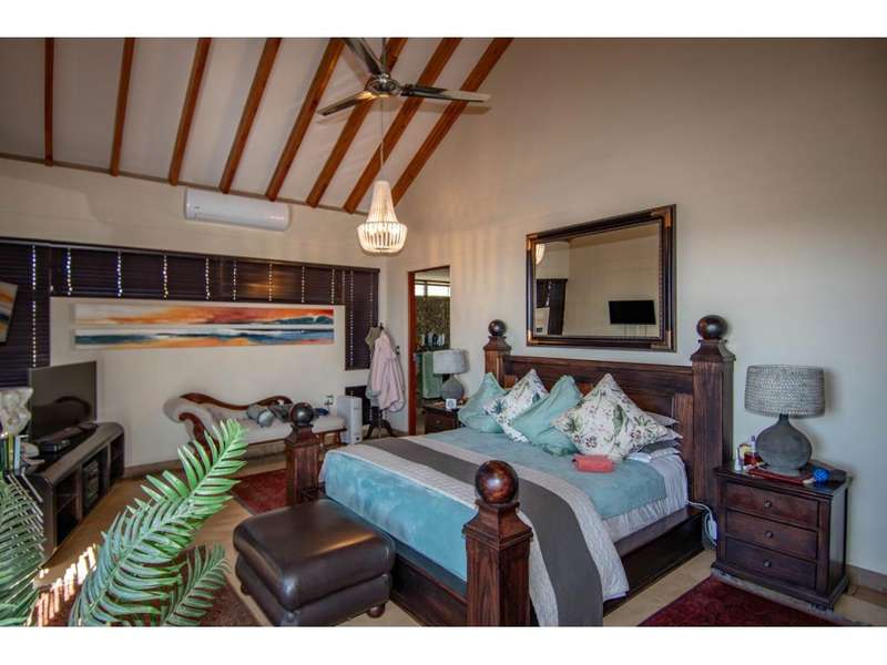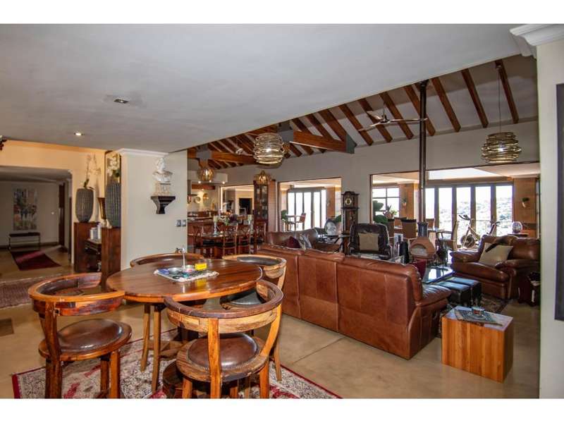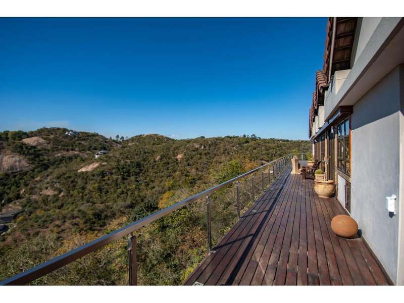 Set on a 2,7 ha stand within the highly sought after Uitsig Landgoed, this master built home has been impeccably maintained by its owner and boasts a feature entrance which invitingly flows into extra-large open plan living areas with high open truss ceilings, study nook, bar area, gourmet kitchen with gas hob, granite counter tops and wooden breakfast nook and out onto the enclosed entertainers patio with built in braai and the most breathtaking panoramic views over the surrounding Lowveld. The home offers 3 bedrooms which are all en suite with immaculate bathrooms and configured as a fully equipped guest suite with kitchenette and TV room, a generous main bedroom with its own walk in dressing area and stunning full bathroom. A third bedroom is part of a sunroom and also has a bathroom en suite. The home spills onto a private, fully walled natural back garden with feature rocks, plants, irrigation, deck with jacuzzi, firepit & built braai. Other awesome extras include laundry, domestic facilities, several storerooms, 4 garages , sauna and a caravan port. Uitsig landgoed is conveniently located near Curro Private School, West End Centre, Nelspruit Mediclinic & major routes and is renown for top notch security and upmarket homes on large natural stands with roaming game.