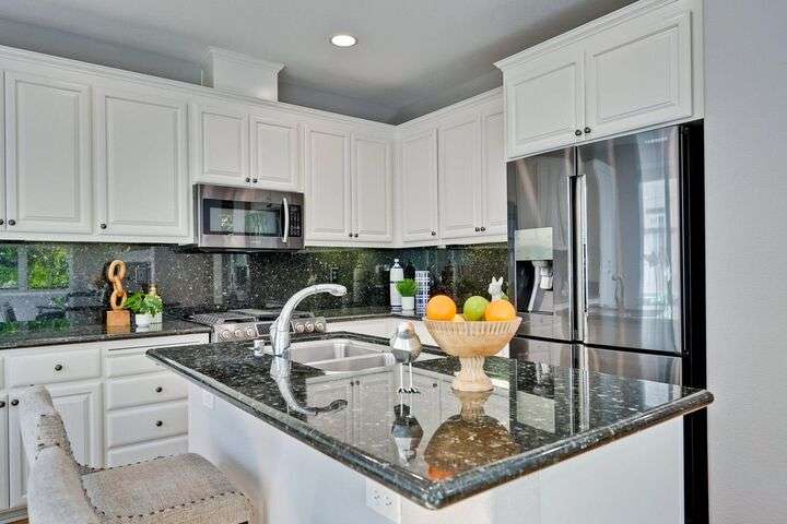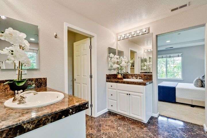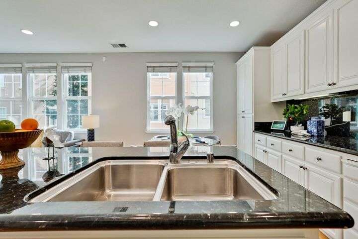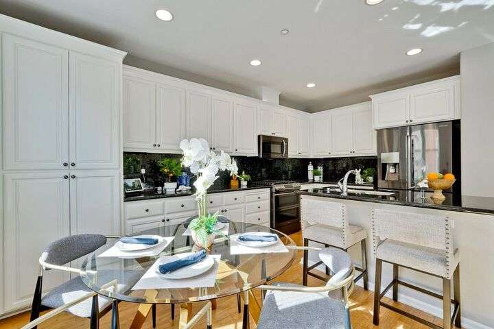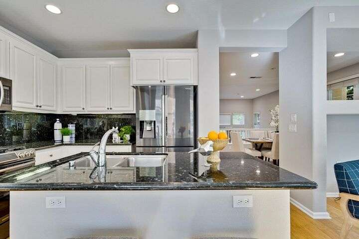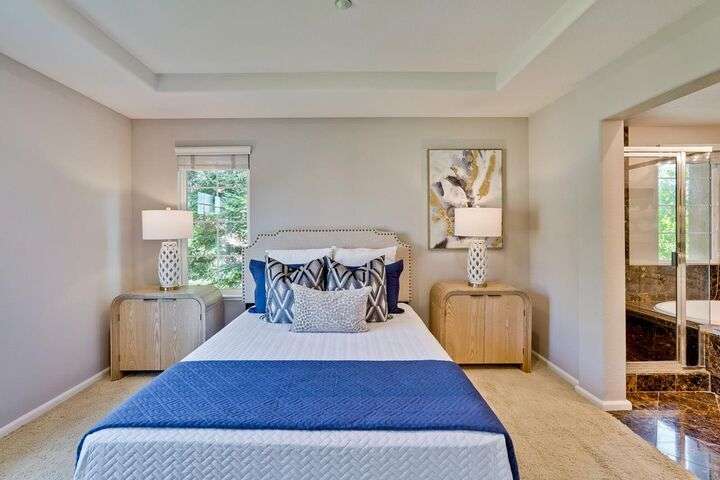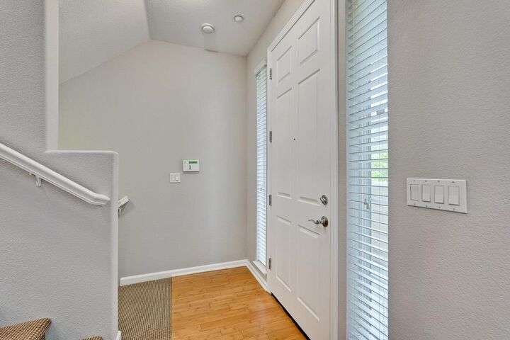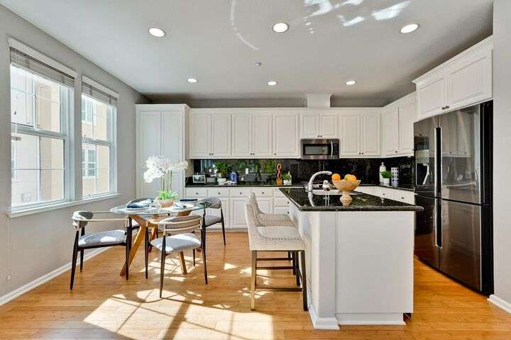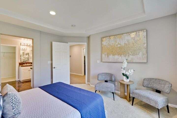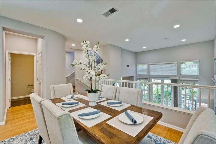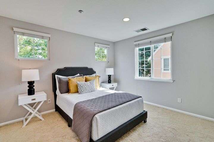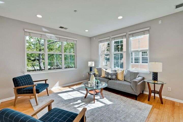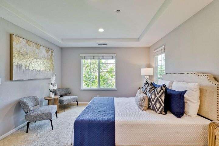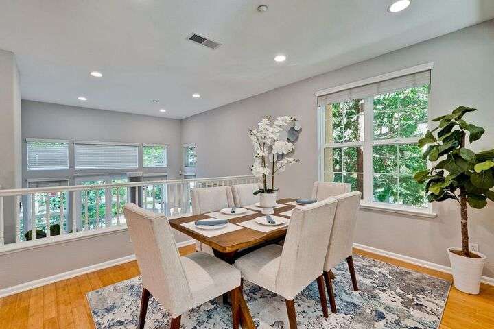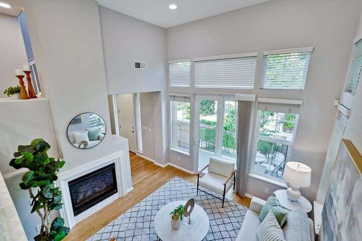 Premier Rivermark End-Unit Townhome - This exceptional, meticulously maintained Rivermark townhome faces a desirable greenbelt and offers superior walkability. Easily stroll to retail, the grocery store, the park, the library, and the award-winning K-8 school. The dramatic living room welcomes you with soaring ceilings and floor-to-ceiling windows, providing beautiful tree views and privacy. The open-plan kitchen and family room is perfect for guests, featuring modern appliances and sophisticated, newly painted cabinets. Upstairs, three plush-carpeted bedrooms await. The serene primary suite boasts greenbelt views and a luxurious bath with a large soaking tub, frameless shower, and dual vanities. Two more bedrooms, a full bath, and an upstairs laundry room complete the level. An attached 2-car garage with extra storage is a huge bonus! Easy access to many Silicon Valley's top firms. This beautiful, spacious townhome, available for the first time, is move-in ready in time for the holidays!
