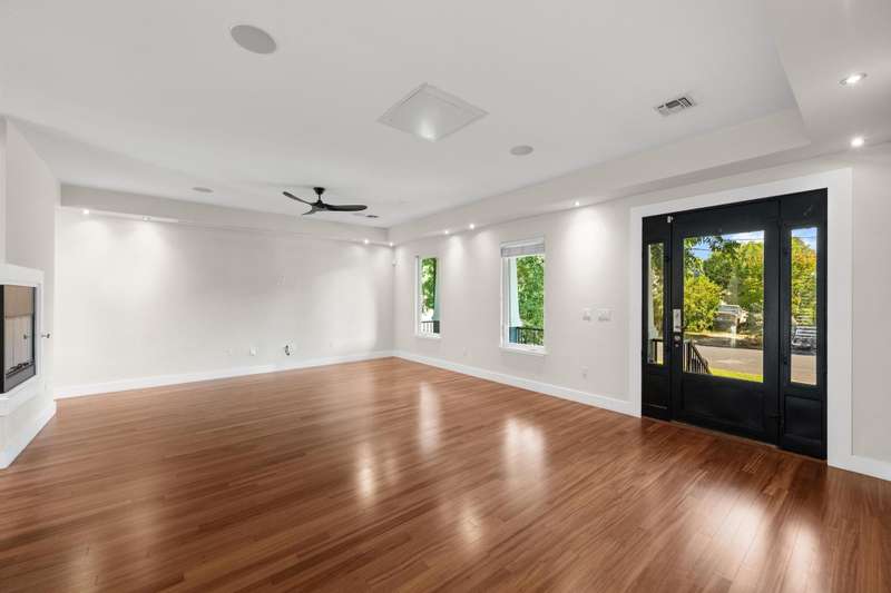 The main level features a gourmet kitchen with stainless steel appliances, gas cooktop, wine refrigerator, and breakfast bar that flows seamlessly into the living and dining areas. A double-sided fireplace enhances both spaces, creating a warm atmosphere. Two generously sized bedrooms with a connecting bath and a powder bathroom complete the downstairs.