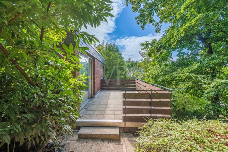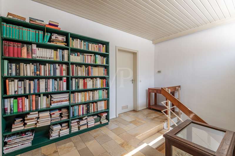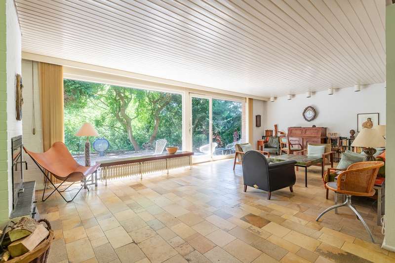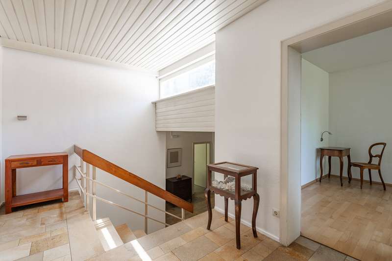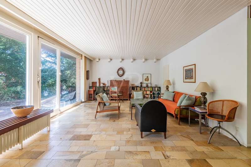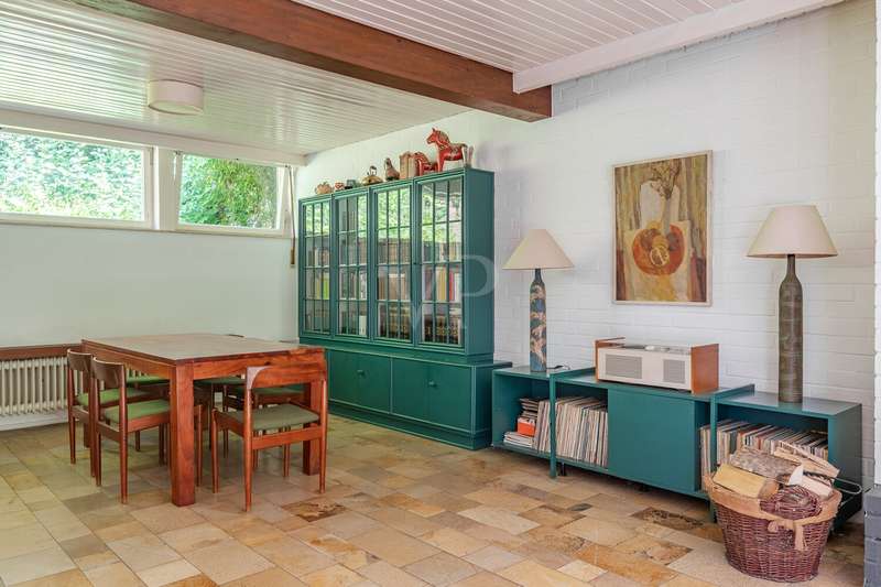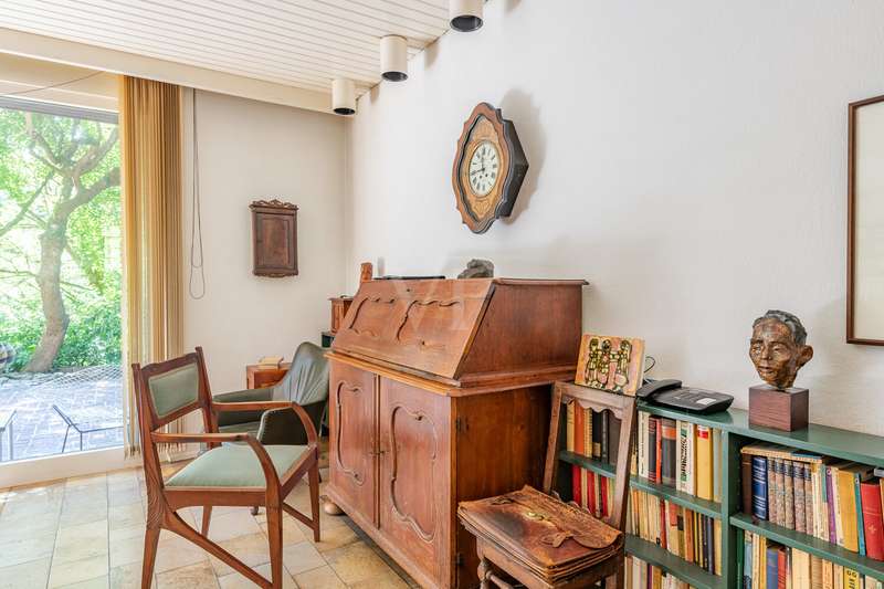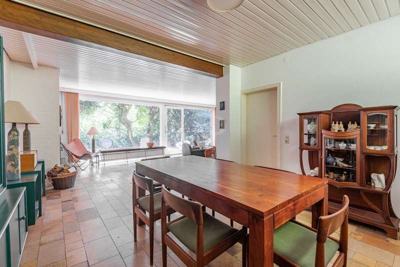 Idyllic location - bungalow with plenty of space and privacy In the middle of nature and in a quiet location, this solidly built bungalow from 1967 offers you a spacious home on an extensive plot of approx. 981 m². The solid brick construction provides a durable and stable foundation. The well thought-out floor plan leads from the entrance area into a central hallway from which all rooms are accessible. The spacious living and dining area impresses with large windows that let in plenty of natural light and provide a view of the greenery. From here, you can access the large terrace, which is ideal for spending relaxing hours outdoors. A fireplace provides pleasant warmth on cooler days. The adjoining kitchen offers plenty of space for your furnishing ideas. The house has two spacious bedrooms as well as a daylight bathroom and a separate guest WC. There is a studio in the basement, which is ideal as a work or hobby room and offers plenty of peace and quiet. The property has a spacious terrace, a balcony and a surrounding garden area that offers plenty of space and privacy. A double garage completes the offer. Quiet location with good connections Here you live close to nature and in a quiet location, while shopping facilities, schools and leisure activities are all within easy reach. A spacious bungalow with plenty of room and privacy - ideal for families, couples or freelancers looking for a solid home in a quiet location.