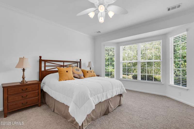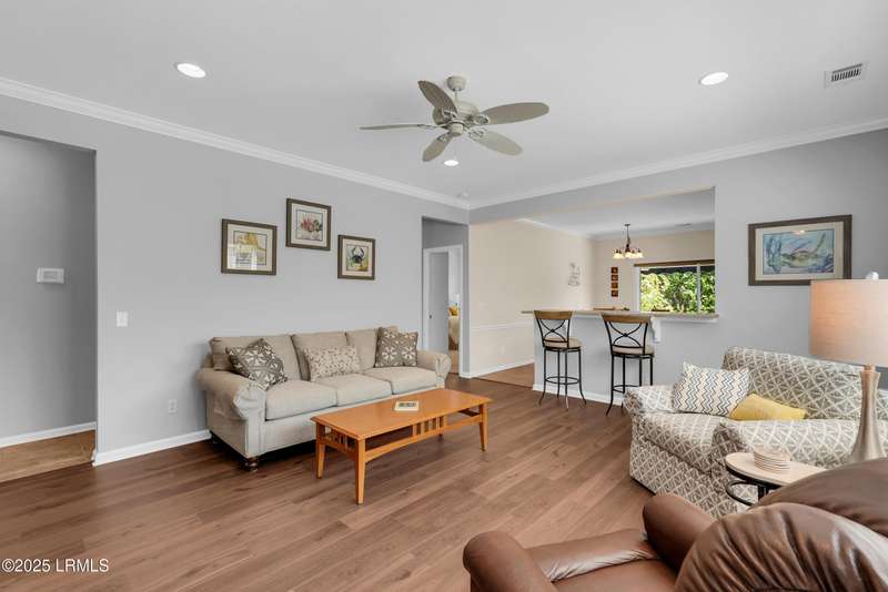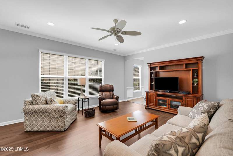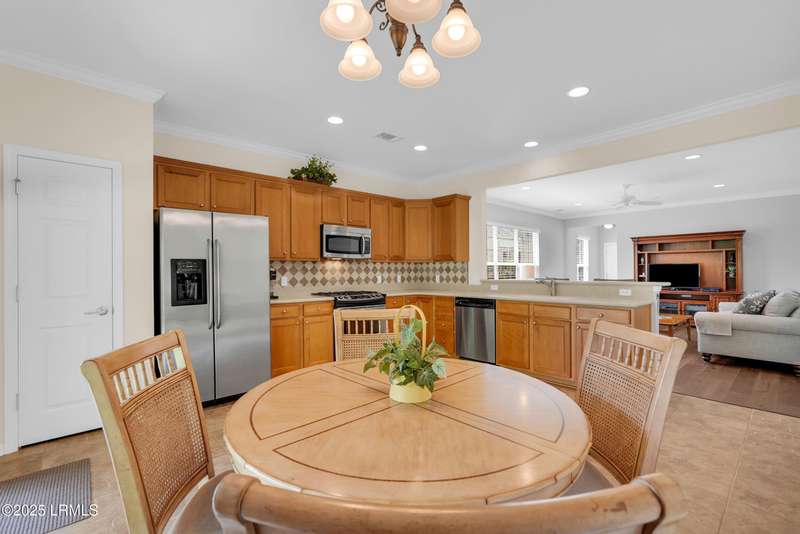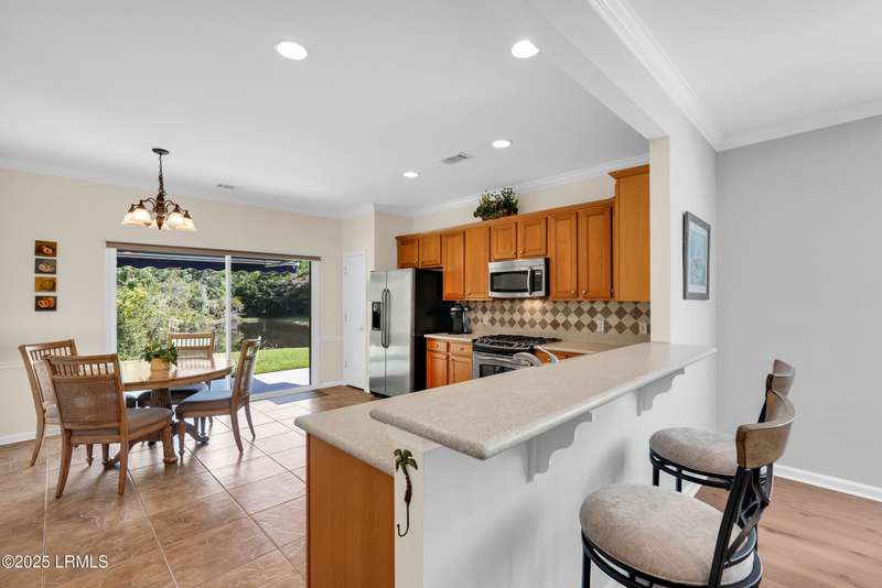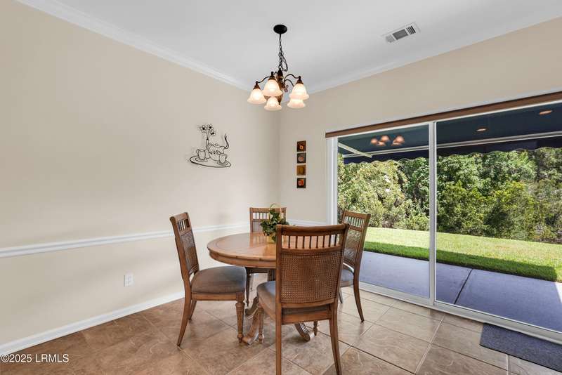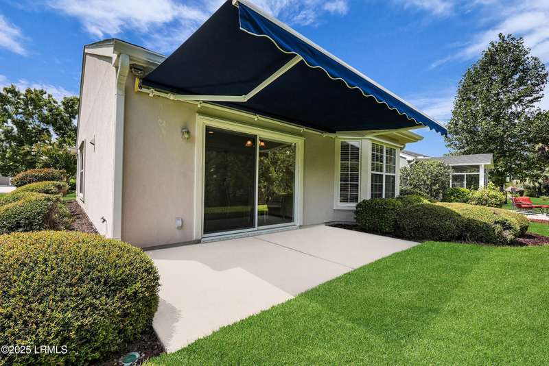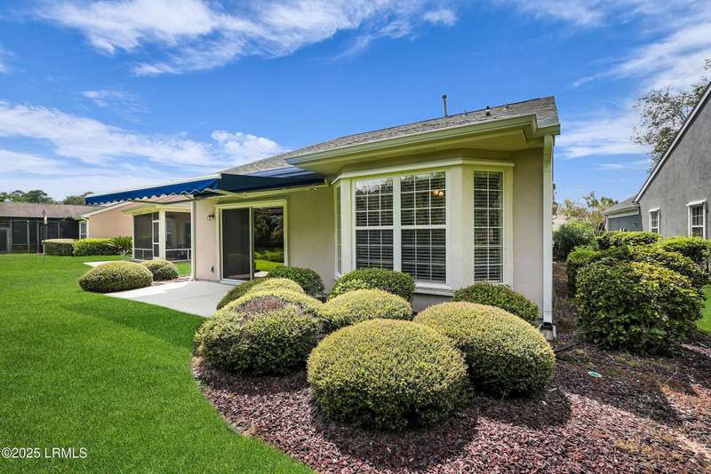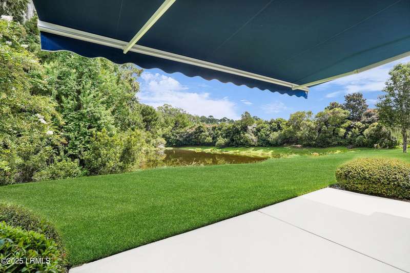 Move-in ready Primrose model with view of natural pond and woods. This well-maintained and gently used 2nd home features 2 bedrooms, 2 bathrooms and a cozy den. LVP flooring and crown molding in living areas. Enjoy the lagoon views from the eat-in kitchen with SS appliances, tile backsplash, Corian countertop, large tile flooring and bar seating. Primary suite has a bay window for extra natural light and views. Crown molding in the Great Room. Remote controlled awning over the patio makes it the perfect place to have your morning coffee and evening beverages while watching the abundance of wildlife. Office/den allows extra space for a home office or a cozy den. Laundry room with extra shelving. Extended garage with pull down stairs for over the garage storage.