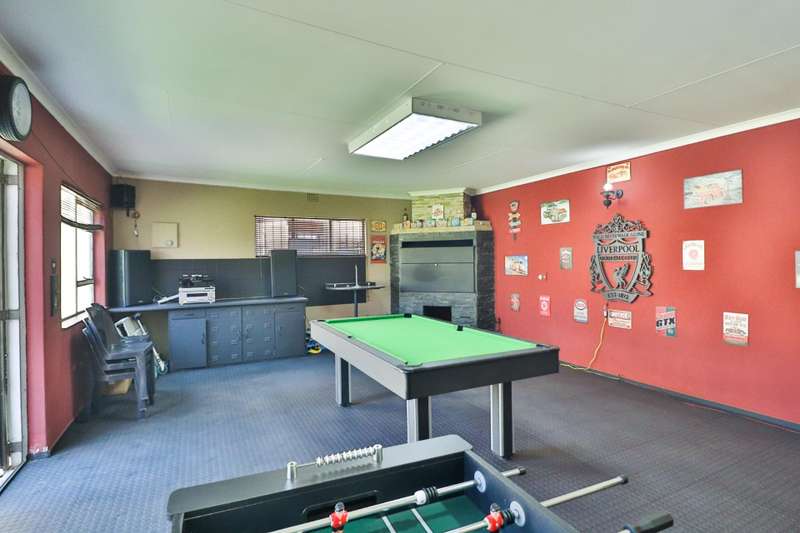 Outside entertainment room with a build in braai , and a sparkling blue pool. Staff accommodation as well as 2 store rooms.
