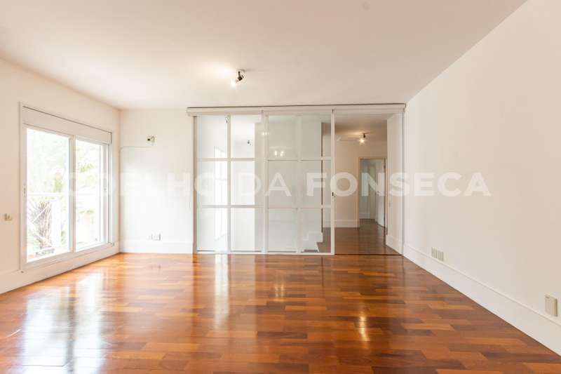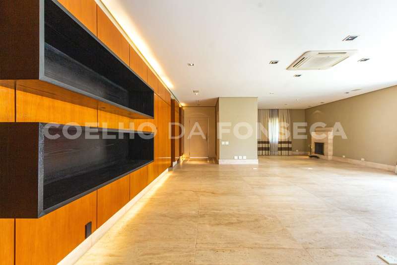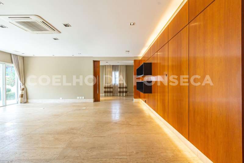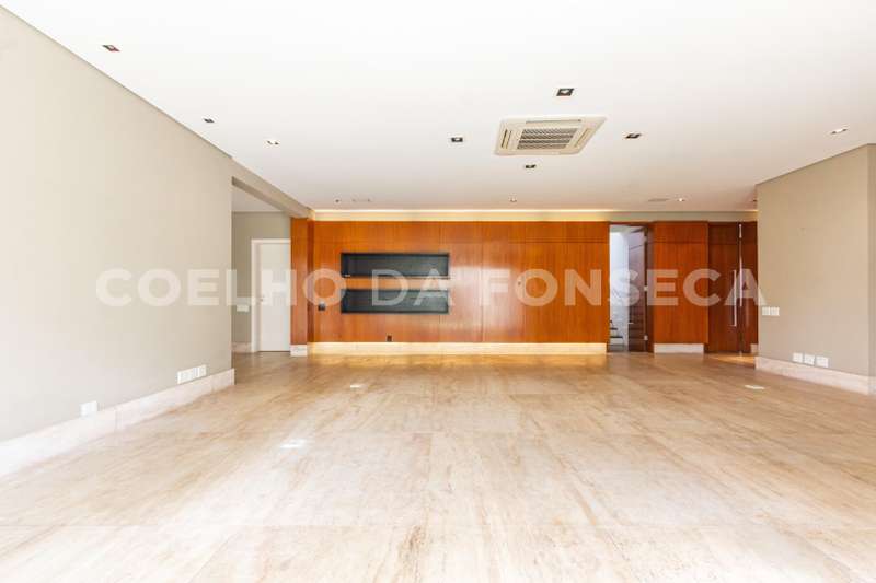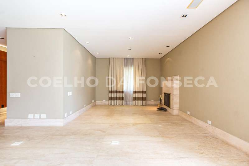 Living com piso de mármore travertino, dividido em sala com lareira, sala de estar, home theater e escritório. Integrado à área de lazer.