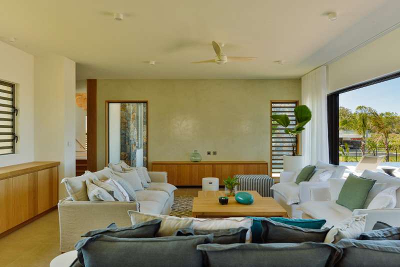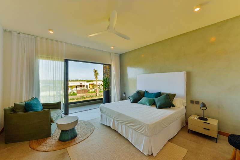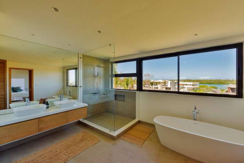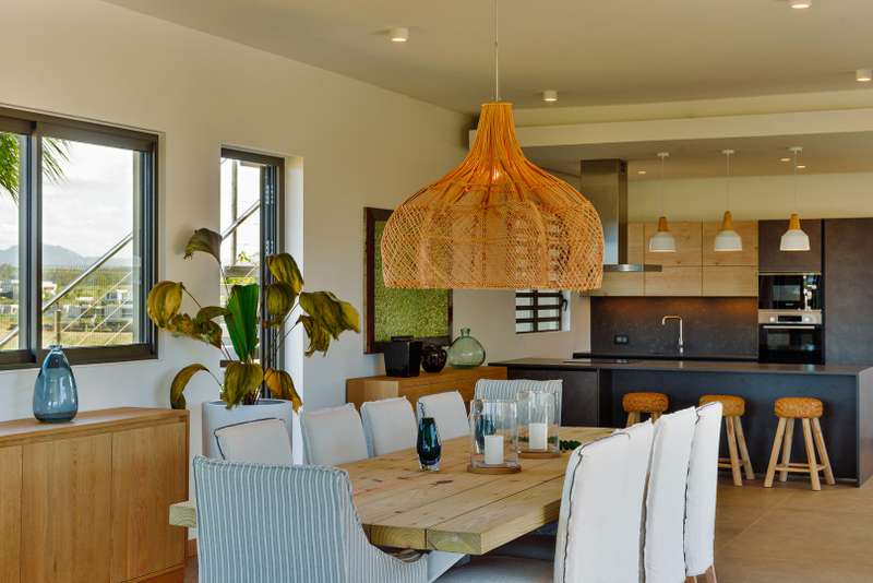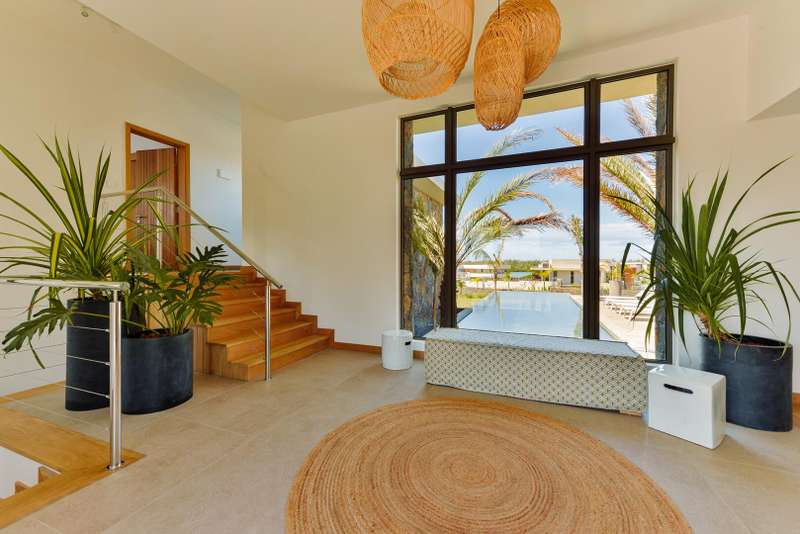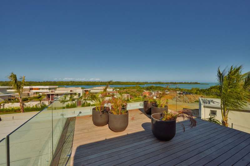 Completed in 2022, this exquisite 492 m² villa sits on a generous 2,252 m² plot, offering an exceptional lifestyle in the heart of Mauritius. Nestled in a tranquil setting, it boasts breathtaking panoramic views from its rooftop terrace, where one can admire Île aux Cerfs, the turquoise lagoon, and the majestic mountain range that frames the horizon. Designed by the renowned architect JM Eynaud, a specialist in five-star villas in Mauritius, this property masterfully combines contemporary design with high-end comfort. The villa features four spacious bedrooms, each with an en suite bathroom, ensuring privacy and well-being for its residents. The living areas are bathed in natural light, highlighting a chic bohemian décor with soft shades of water and sky blue, creating a serene and relaxing ambiance. The fully equipped kitchen meets the demands of culinary enthusiasts, while the laundry room and ample storage provide practical everyday convenience. For social gatherings, an outdoor bar has been thoughtfully designed, offering the perfect setting to share memorable moments with family and friends while enjoying the surrounding scenery. This exceptional villa seamlessly blends aesthetics, functionality, and a prime location, offering a unique island lifestyle. It represents a rare opportunity to reside in a home that embodies luxury, refinement, and a deep connection with nature.