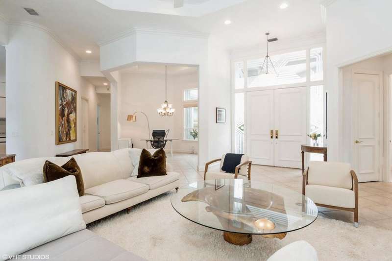Welcome to Old Trail in Ranch Colony - Jupiters hidden gem for golf and nature enthusiasts. Behind a paved circular driveway, this 3-bedroom, 2.5-bath single-family home offers the perfect balance of privacy and comfort. Located in a 24/7 manned-gate community, residents enjoy both peace of mind and the relaxed charm of wide-open green spaces. The home features a lush tropical entryway, soaring ceilings, and elegant crown molding. The whole-house generator and 2018 roof provide convenience and comfort, while the screened pool and private backyard invite you to unwind and enjoy beautiful sunsets. Golfers will enjoy the short golf cart ride to Jonathans Landings Old Trail Courses as well as the Dye Preserve Golf Course. I-95/Turnpike, beaches, and restaurants are a short ride away -