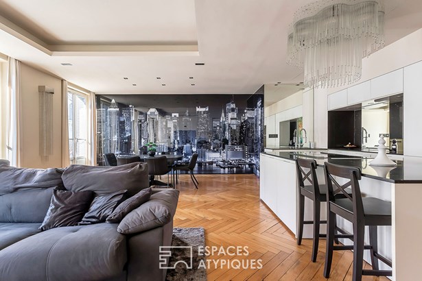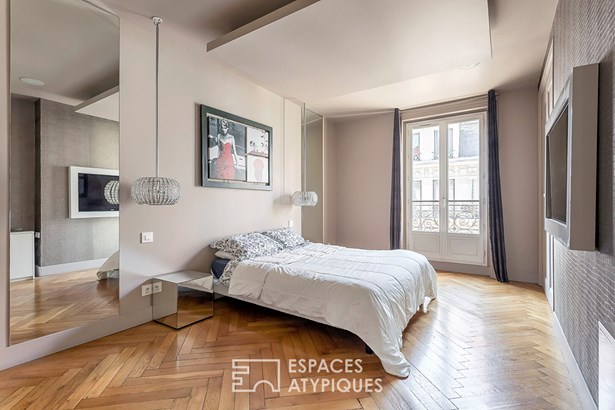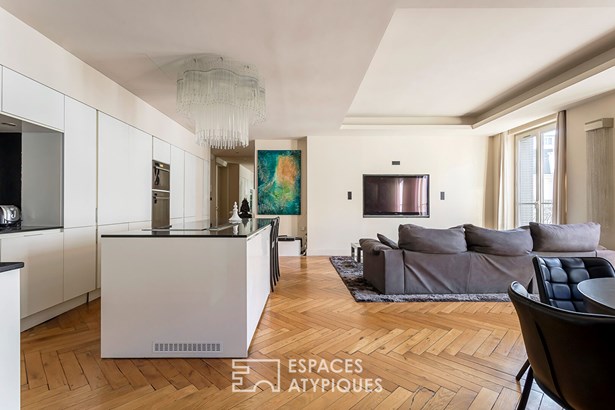 From the moment you enter, the herringbone parquet flooring, refined moldings, and high ceilings attest to the building's noble character and historical charm. Each room of this apartment extends onto the west-facing balcony, bathed in golden light, revealing a unique architectural harmony.
