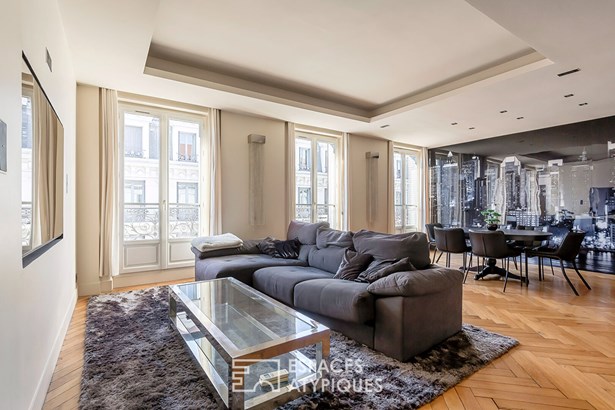 Located in the heart of Lyon's Presqu'ile district on Rue Grolee, near the Cordelier metro station, this magnificent 105 sq m (1130 sq ft) apartment, extended by a continuous balcony, occupies the 4th floor (with elevator) of an exceptional Haussmannian building.