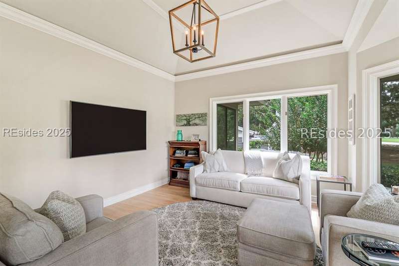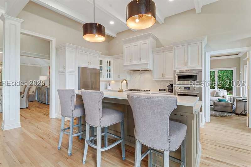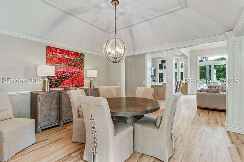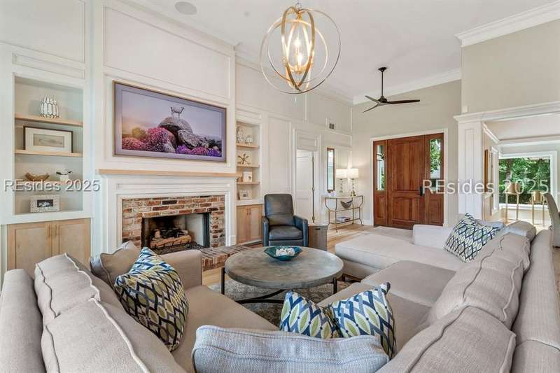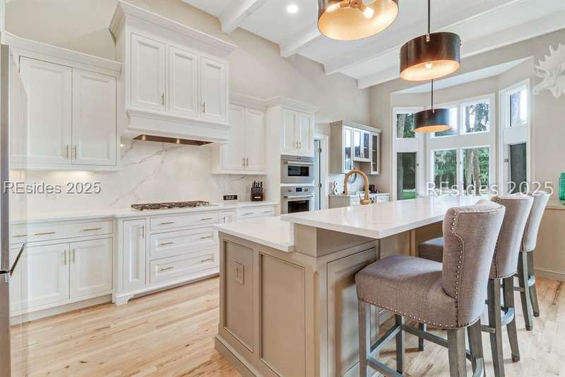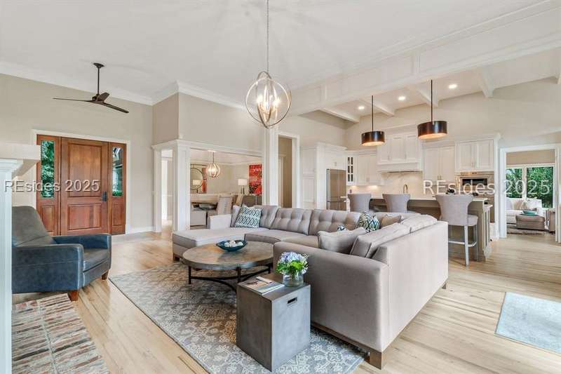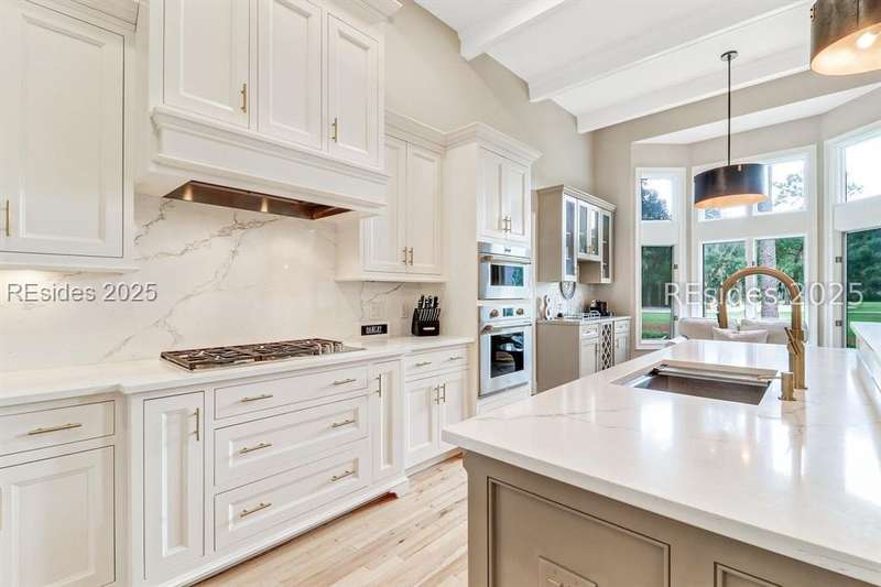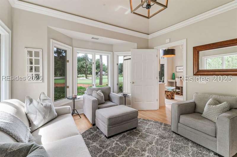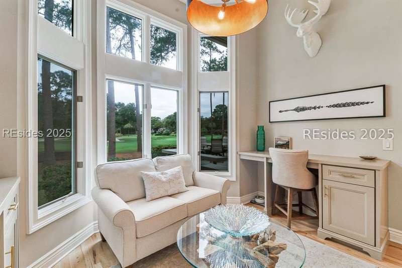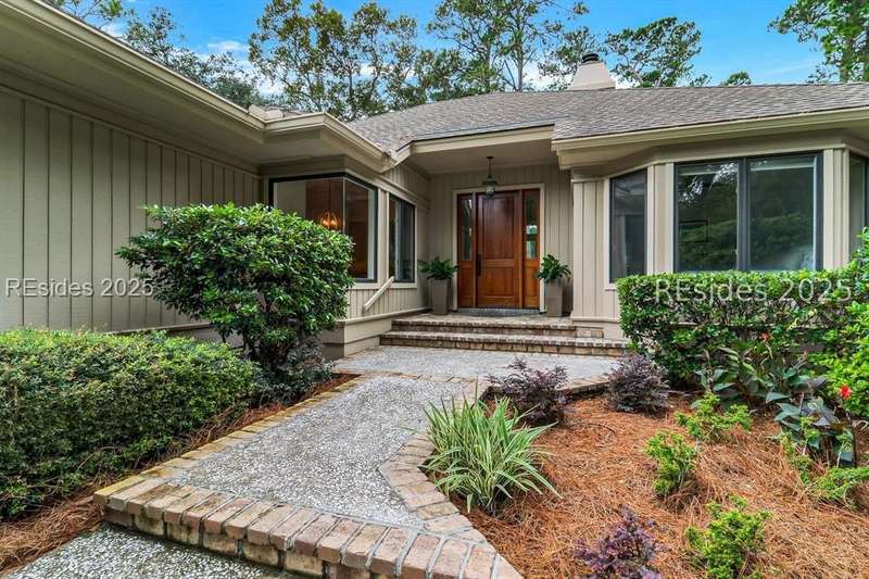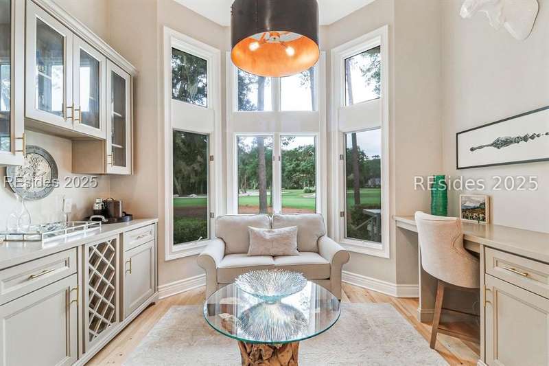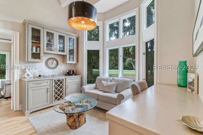 This exceptional 3-bedroom, 3-bath coastal retreat offers panoramic golf views of Harbour Town's famed #6 and #7 fairways and the #2 and #3 greens. Filled with natural light, the open floor plan features soaring ceilings, rich hardwood floors, and a seamless flow between living, dining, and kitchen areas. The newly renovated (2024) kitchen is stunning-complete with quartz countertops, soft-close cabinetry, decorative ceiling beams, and Wolf & Bosch appliances. The inviting great room includes a gas fireplace, while the flexible den can serve as a 4th bedroom or home office, both enjoying incredible golf vistas. The spacious owner's suite offers privacy, beautiful views, and a spa-like bath. Two guest suites provide comfort for family and friends. A new Trex deck overlooks the course, offering the perfect setting for outdoor relaxation and a front-row seat to the RBC Heritage Golf Tournament. Located in the heart of Sea Pines between Harbour Town and the Atlantic Ocean, residents enjoy community amenities including pool, tennis, playground, and basketball-plus easy access to beaches, shopping, and dining. Whether a primary residence, vacation home, or investment property, 13 Fern Court perfectly captures the best of coastal Lowcountry living.