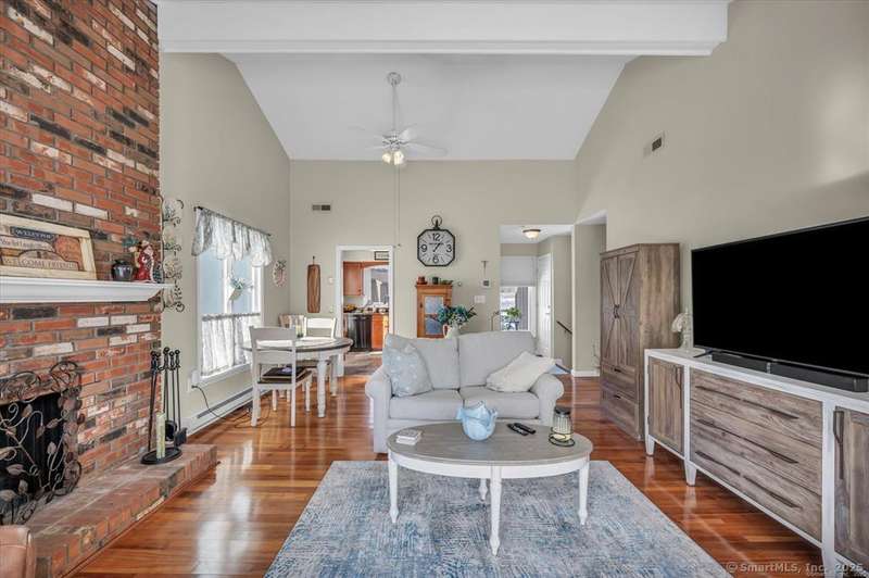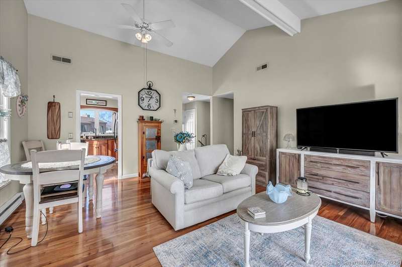 Absolutely adorable and meticulously maintained 2 bedroom Ranch with beautiful hardwood floors, cathedral ceiling in living room, kitchen w/granite, fireplace and living/dining room great for entertainment. Wallingford electric is an added bonus to this already beautiful condo. Sit on the deck and enjoy your morning coffee while admiring the water (pond) views, rainbow's and the golfers trying to get a hole in one!! Pond and golf... life doesn't get better than that!! This condo should not be missed!!