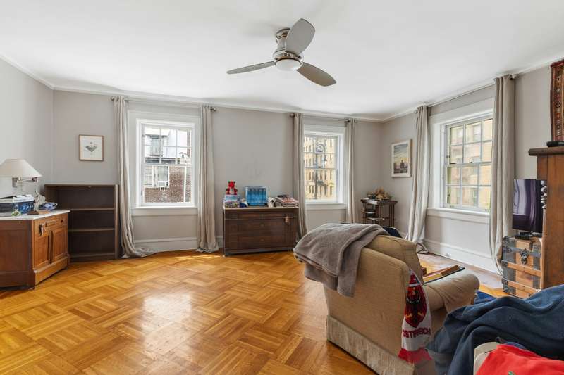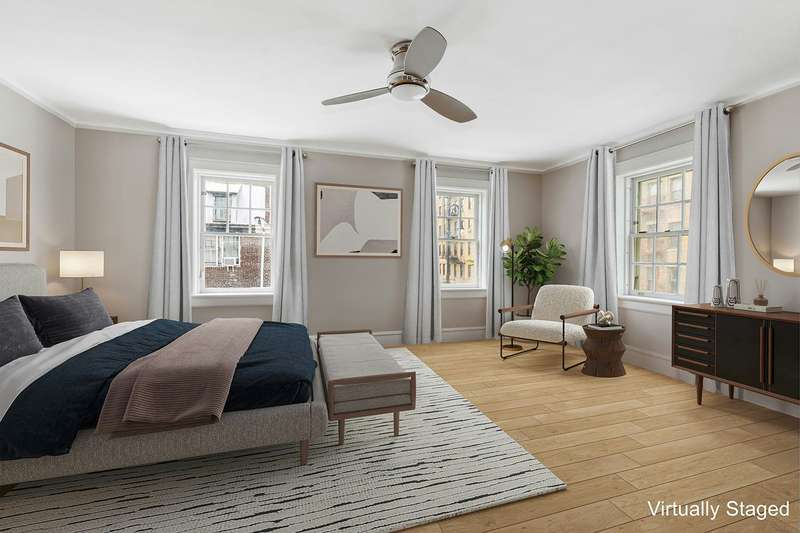 3rd Floor: Perfect for a guest suite, the third floor boasts a total of three bedrooms and a full bath; one full-sized bedroom with sunny south-facing windows and antique built-ins, one bedroom facing north with north and west exposures, and a third bedroom easily convert to a home office or dressing room.