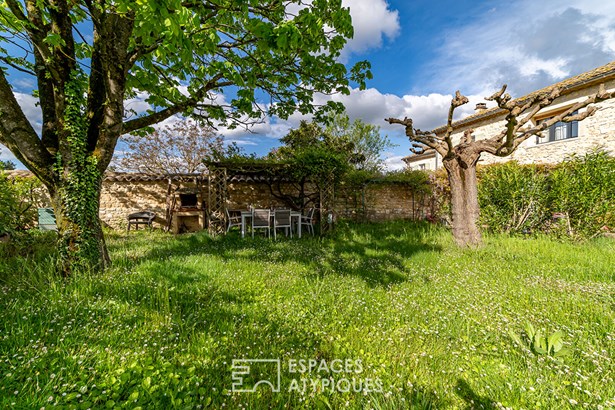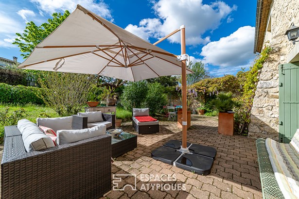 The south-facing garden, where one imagines summer lunches, children's laughter, evenings by the light of fairy lights. Its beautiful flat and sunny space lends itself easily to the creation of a swimming pool, which would perfect this idyllic setting. The vast 45 sqm garage, a former barn with authentic charm, opens up multiple development possibilities. It would be possible to connect it directly to the house, thus providing a beautiful additional space to be imagined according to needs. The building plot allows for an extension.